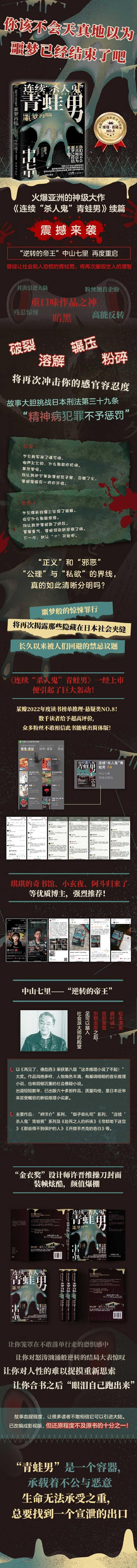 ◆ 你们该不会天真地以为噩梦已经结束了吧?!“逆转的帝王”中山七里,再度重启噩梦般的惊悚罪行,及迷离难解的故事张力。曾经让社会陷入恐慌的青蛙男,将再次摧毁世人的理智!