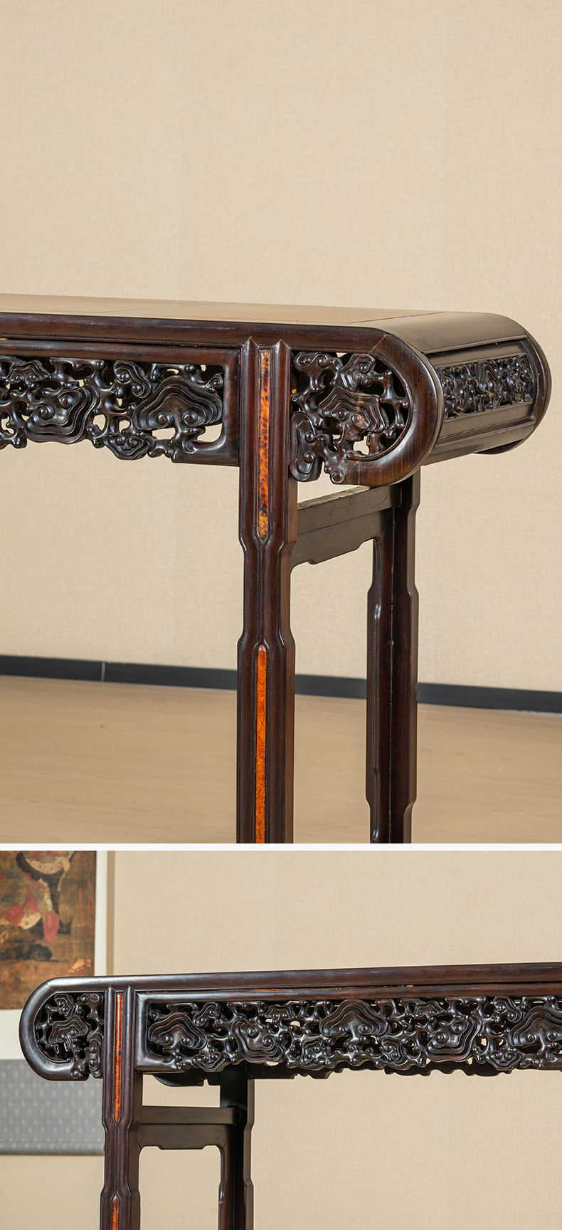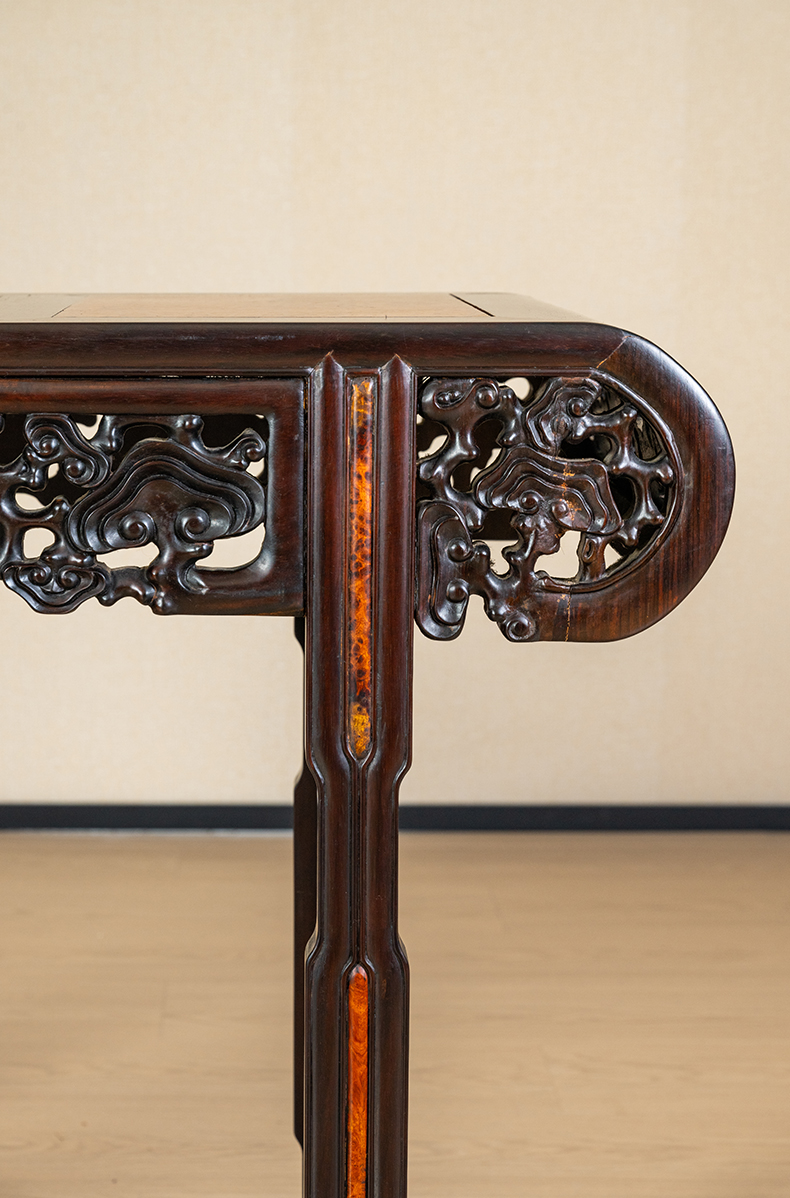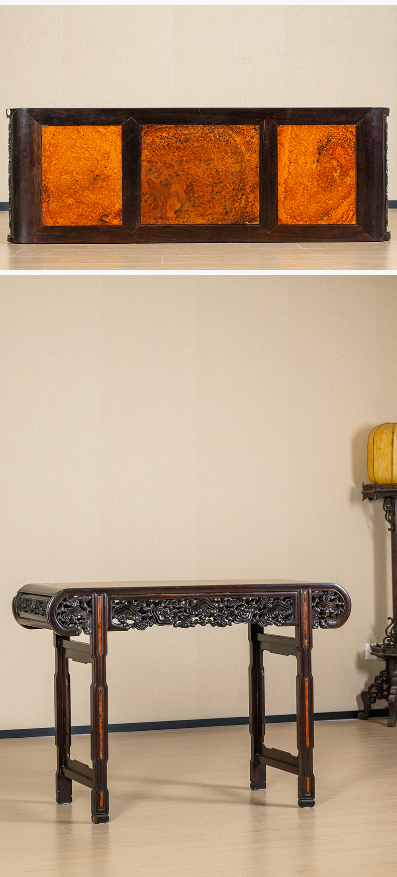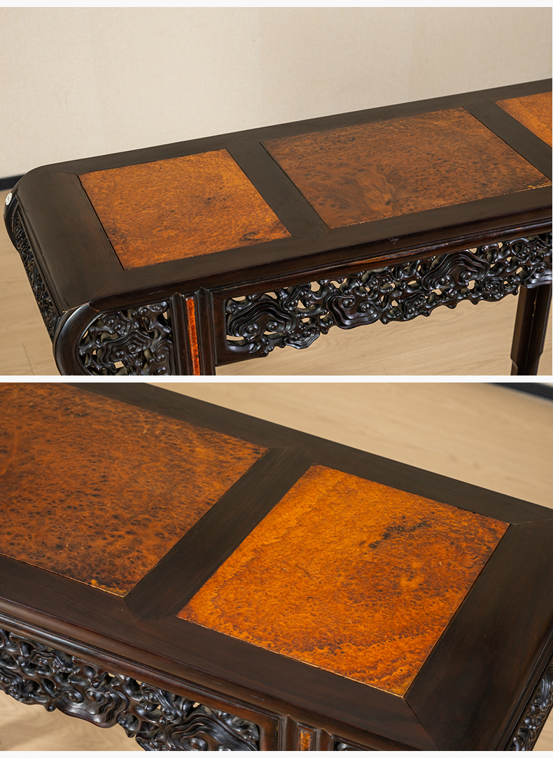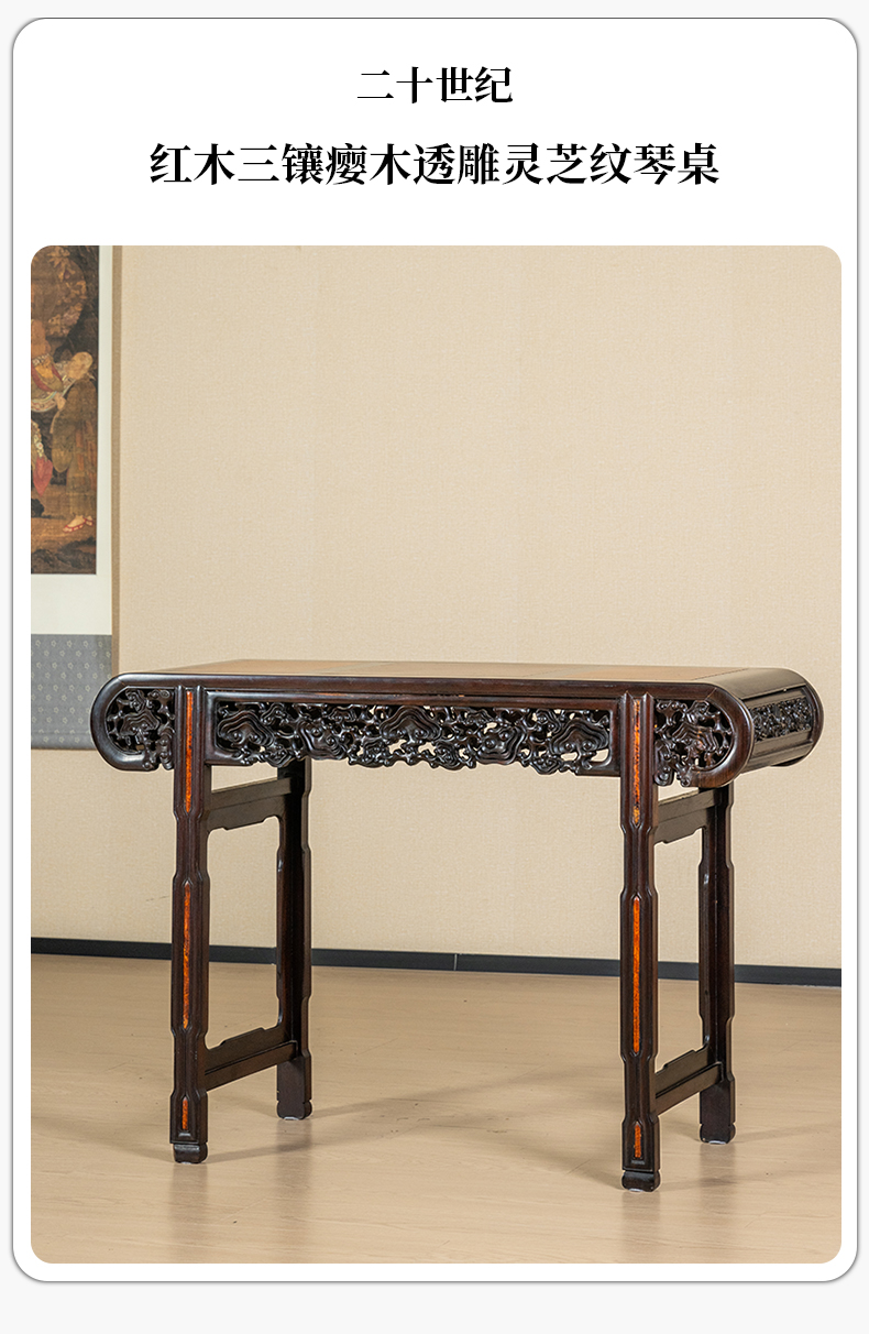 二十世纪 红木三镶瘿木透雕灵芝纹琴桌
