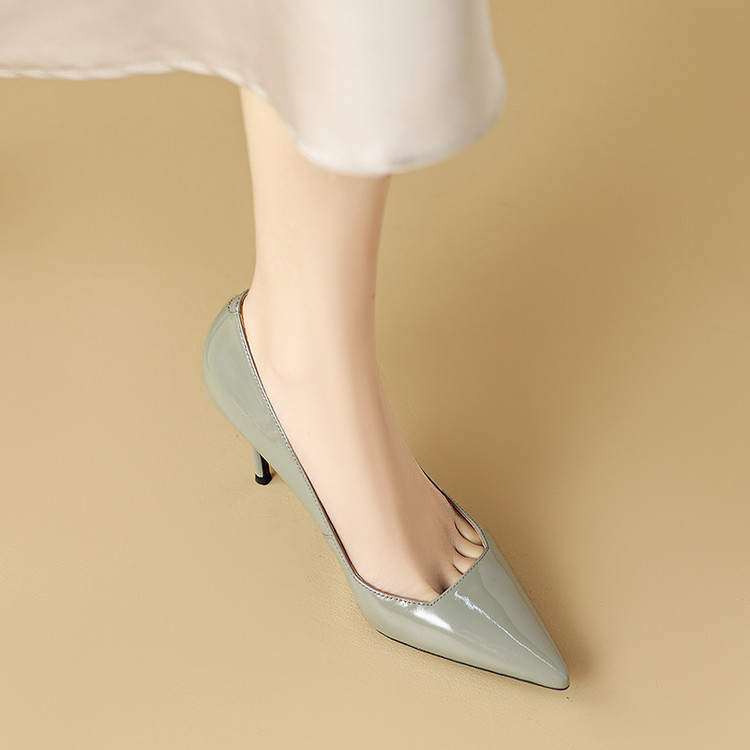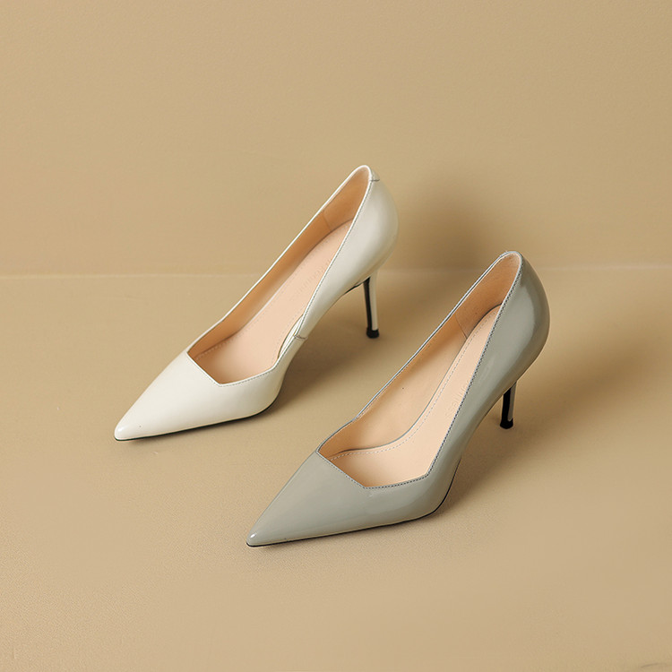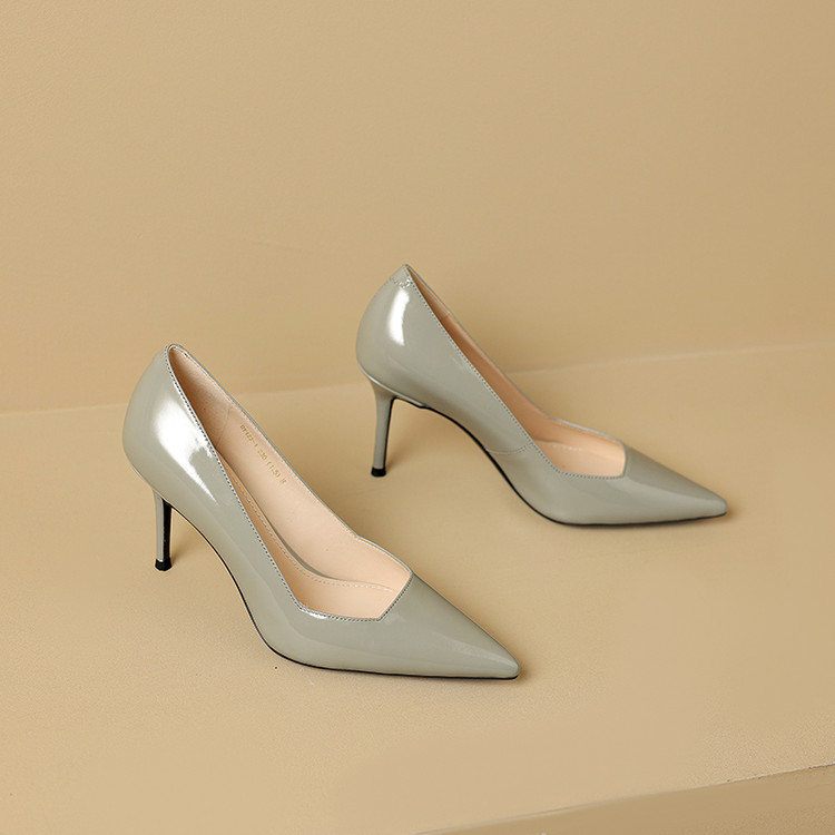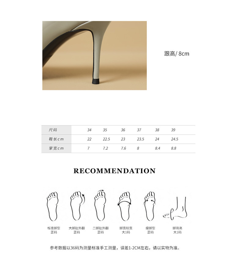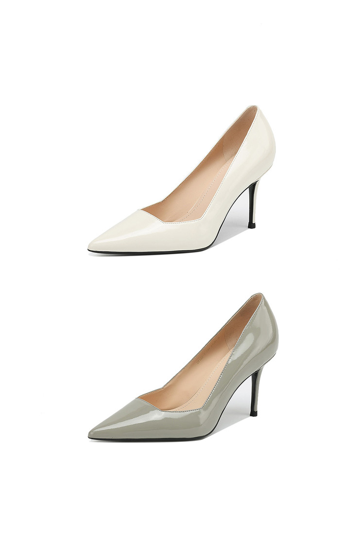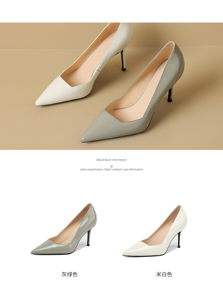 【货号】M1062-1【帮面材质】头层牛漆皮/头层牛油皮【鞋垫】羊皮垫【内里材质】羊皮里【鞋底材质】橡胶【跟高】8CM【颜色】象牙白牛油皮 灰绿色漆皮【尺码】34-39