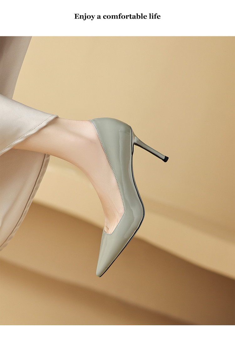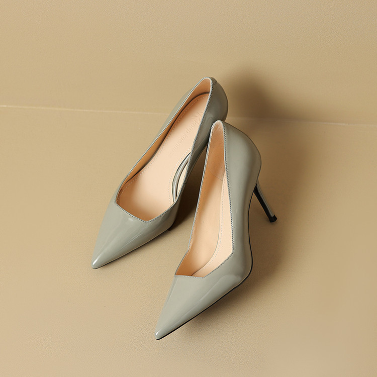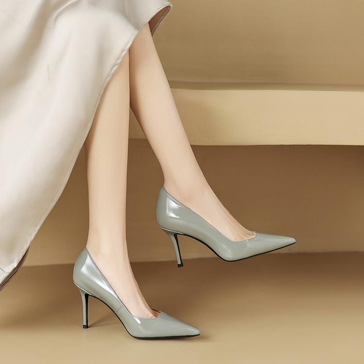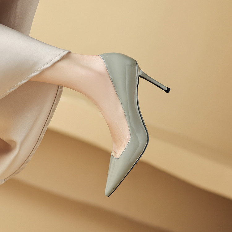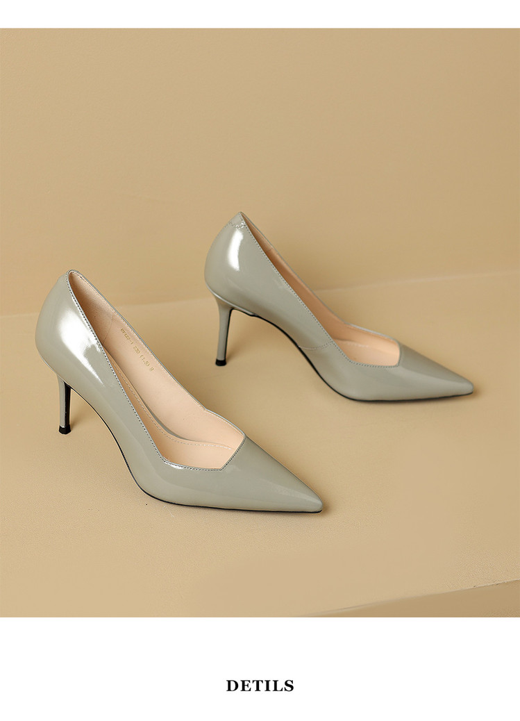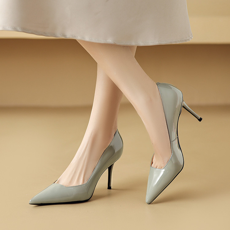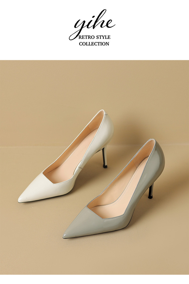 【货号】M1062-1【帮面材质】头层牛漆皮/头层牛油皮【鞋垫】羊皮垫【内里材质】羊皮里【鞋底材质】橡胶【跟高】8CM【颜色】象牙白牛油皮 灰绿色漆皮【尺码】34-39