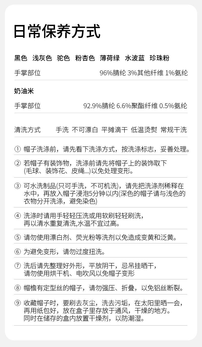 【其他注意事项】注意帽子的洗涤方式,每顶帽子都有吊牌