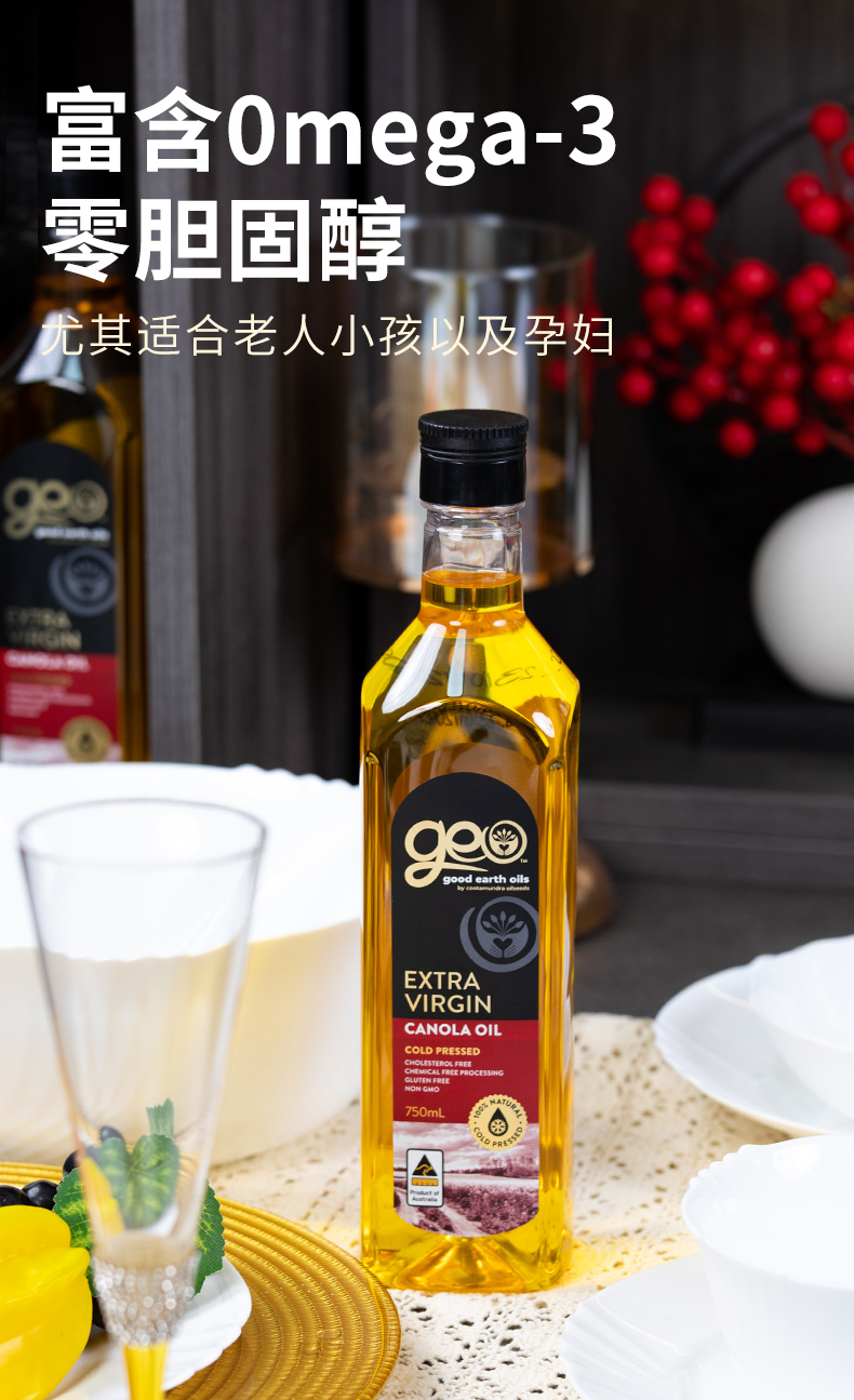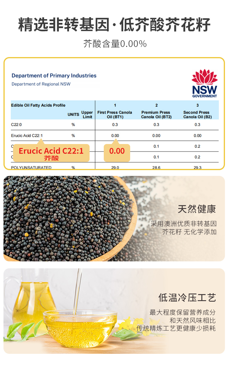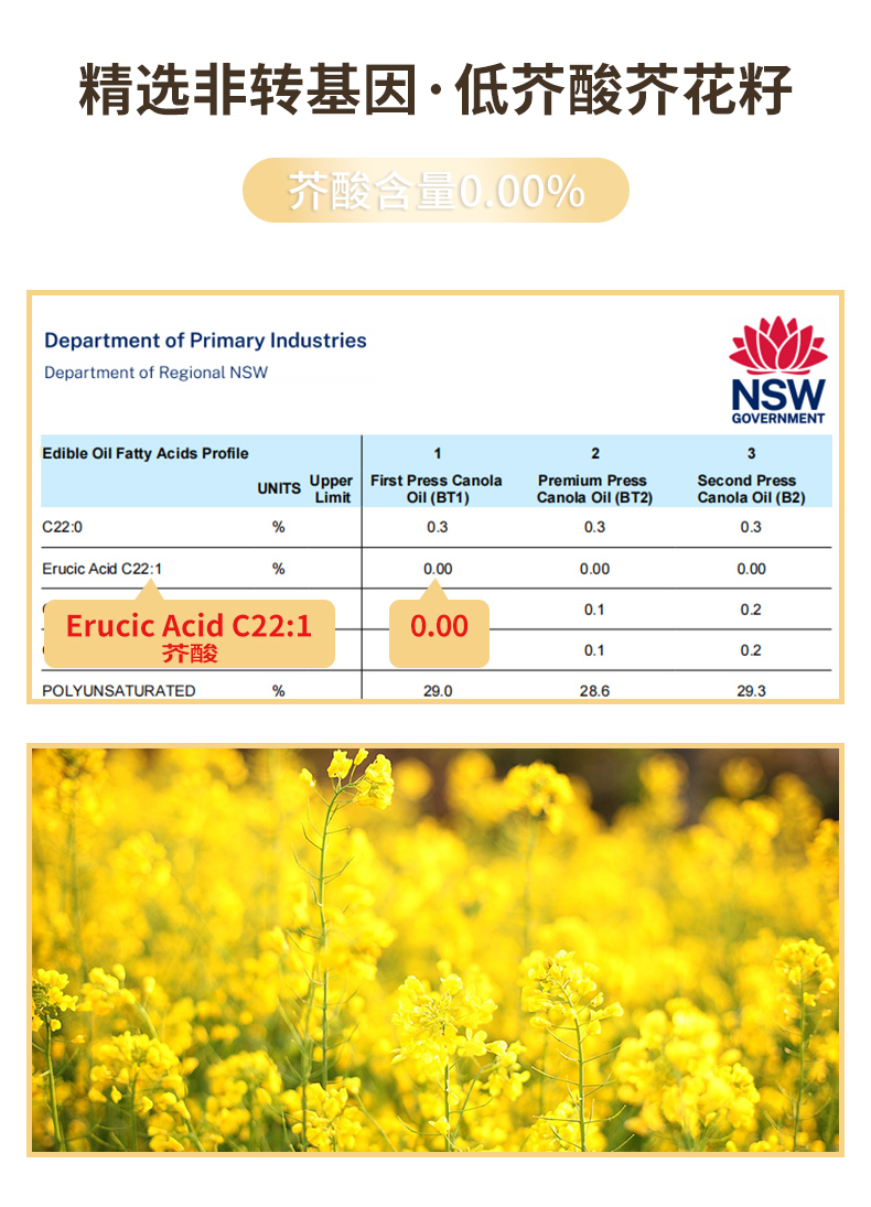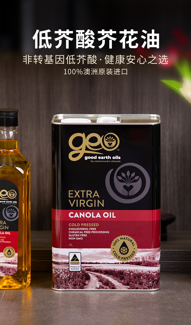 特级初榨芥花油 澳洲原装进口 冷榨工艺 非化学萃取 烟点高达200+ 可热炒 Omega-3含量10%不含反式脂肪酸 芥酸含量0 GEO
