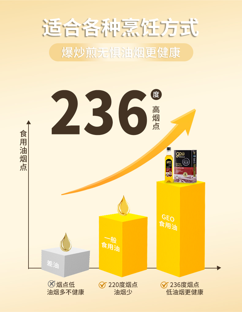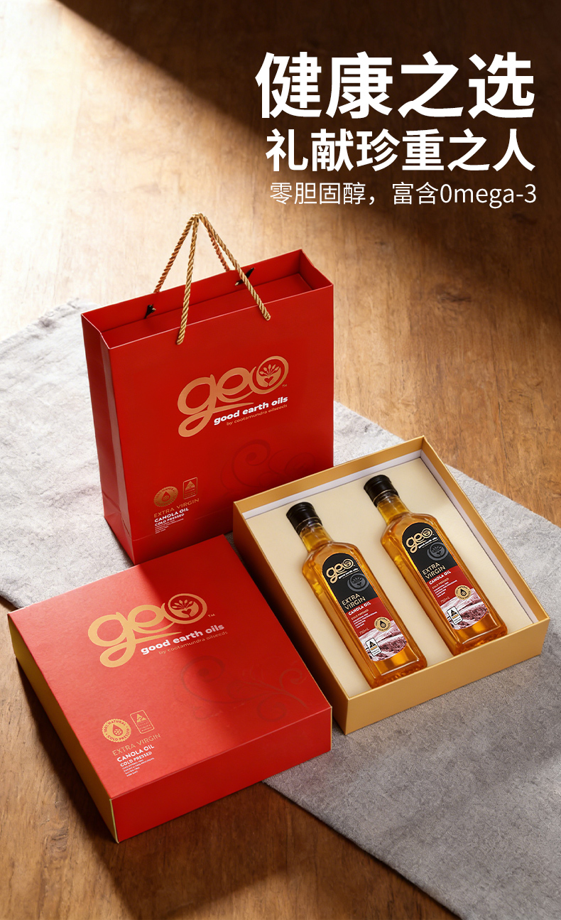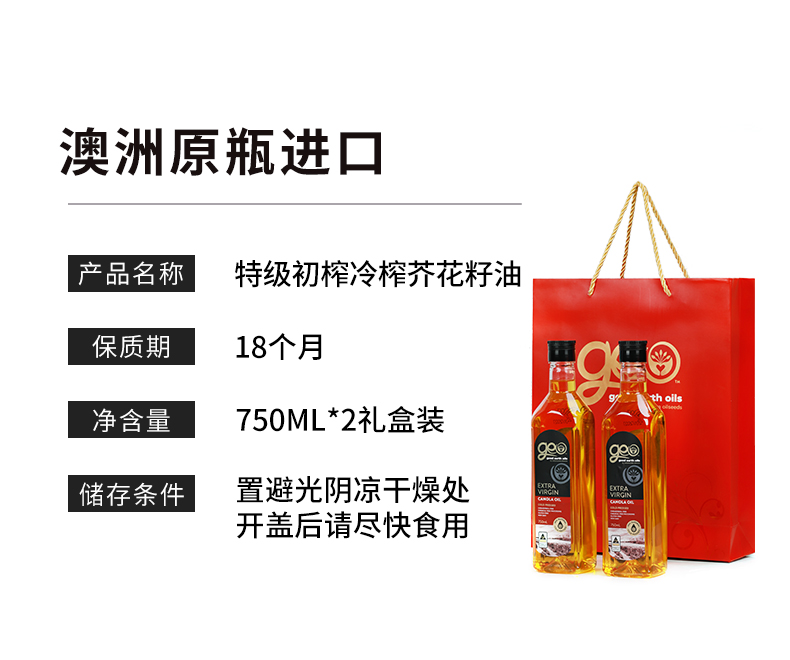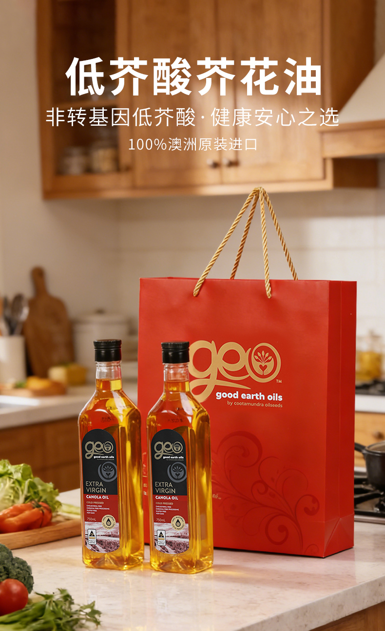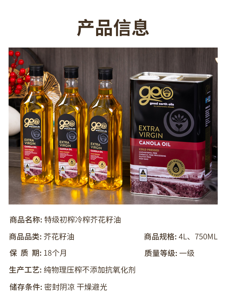 特级初榨芥花油 澳洲原装进口 冷榨工艺 非化学萃取 烟点高达200+ 可热炒 Omega-3含量10%不含反式脂肪酸 芥酸含量0 GEO