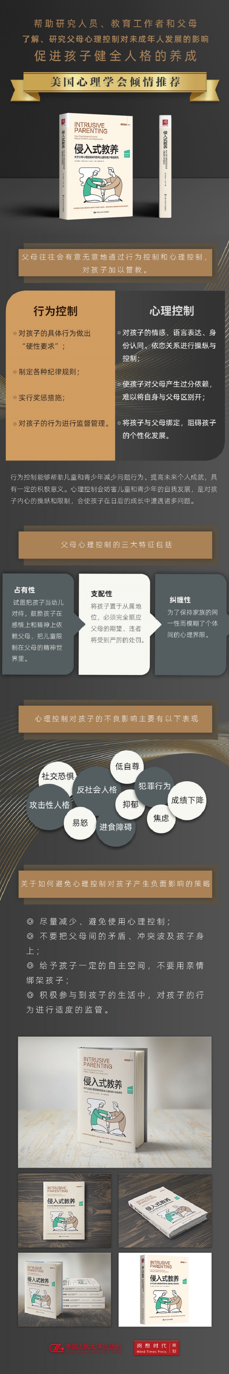 1.本书以大量实证调查与缜密的数据分析为支撑,全面剖析心理控制对未成年人的危害,是一本关于青少年心理发展与亲子关系的经典之作。 2. 书中所汇集的各项经典研究方法和实证研究发现、证明了父母心理控制对儿童和青少年发展的影响。阅读此书可以帮助父母反思自己的行为,促进孩子健全人格的养成。
