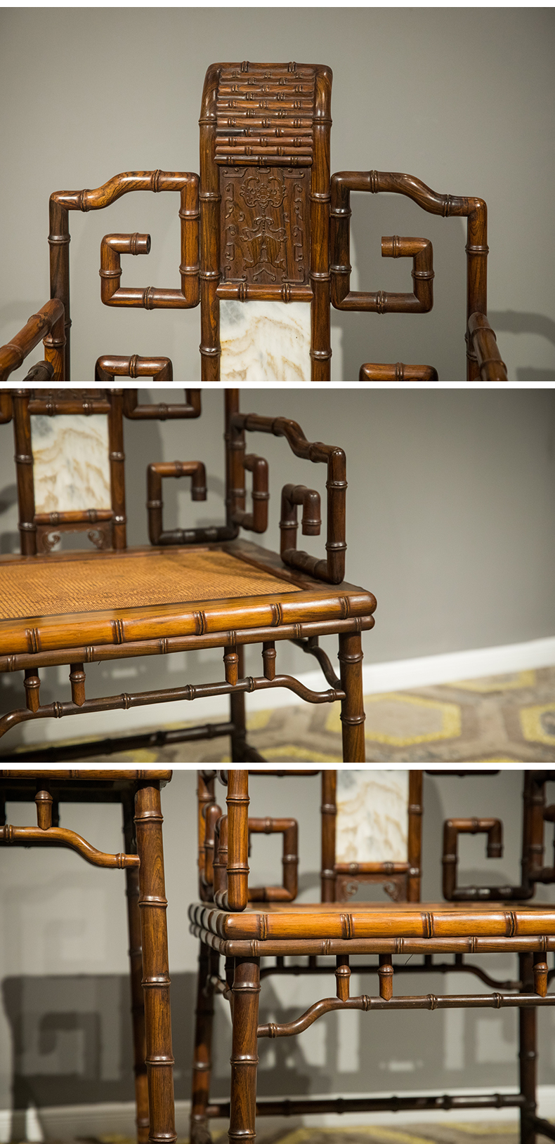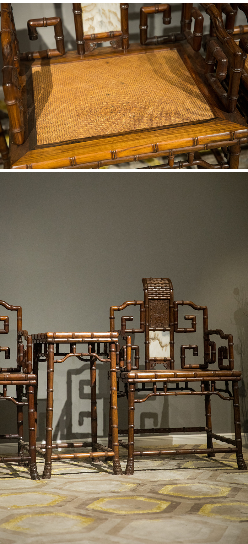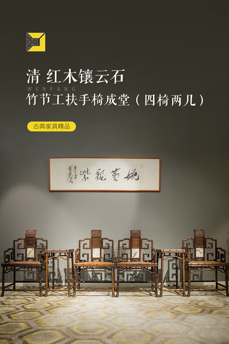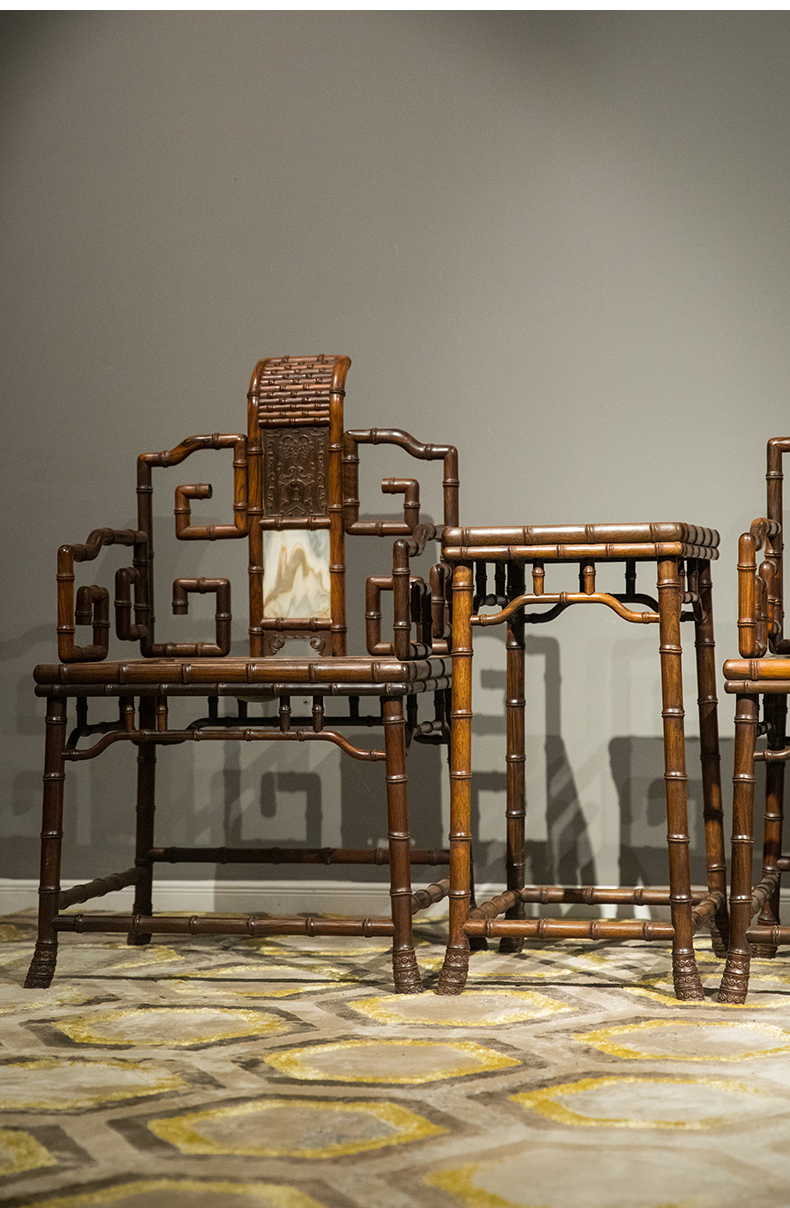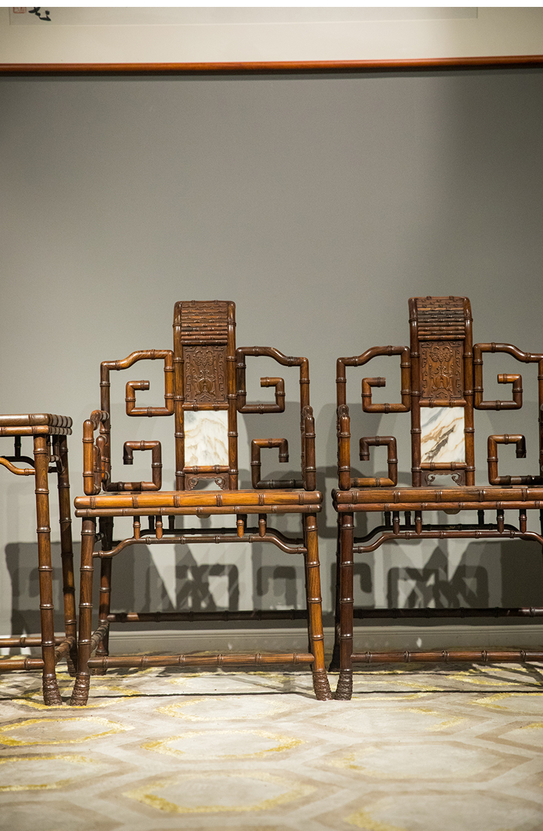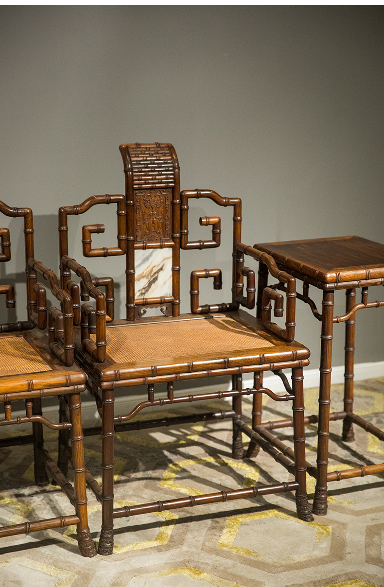 清 红木镶云石竹节工扶手椅成堂(四椅两几)