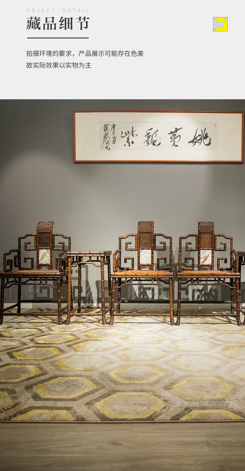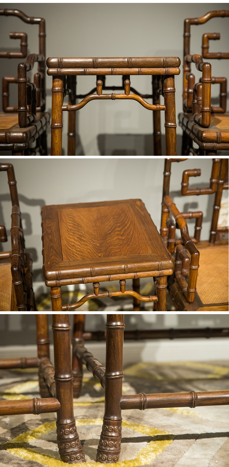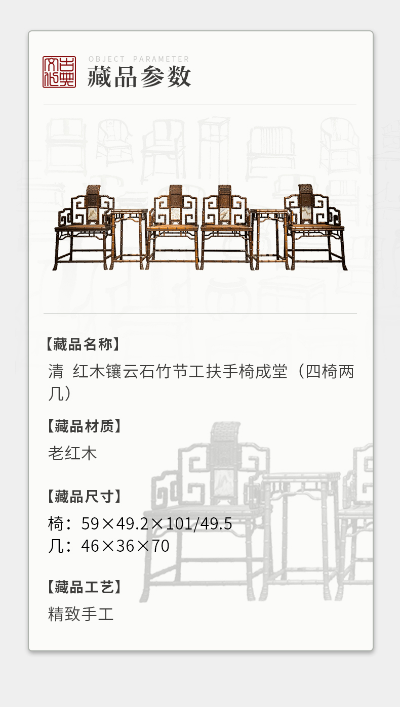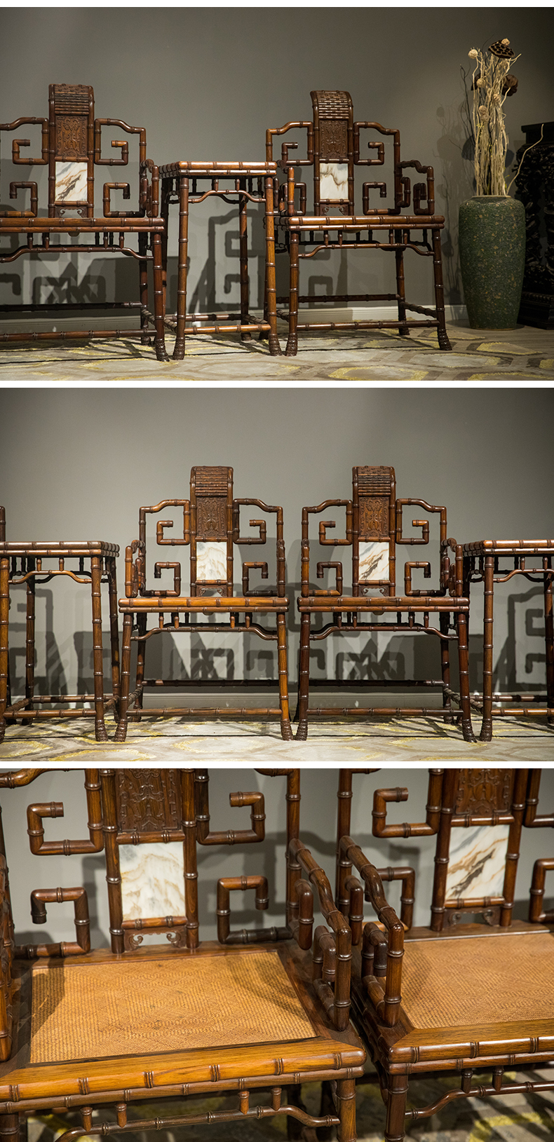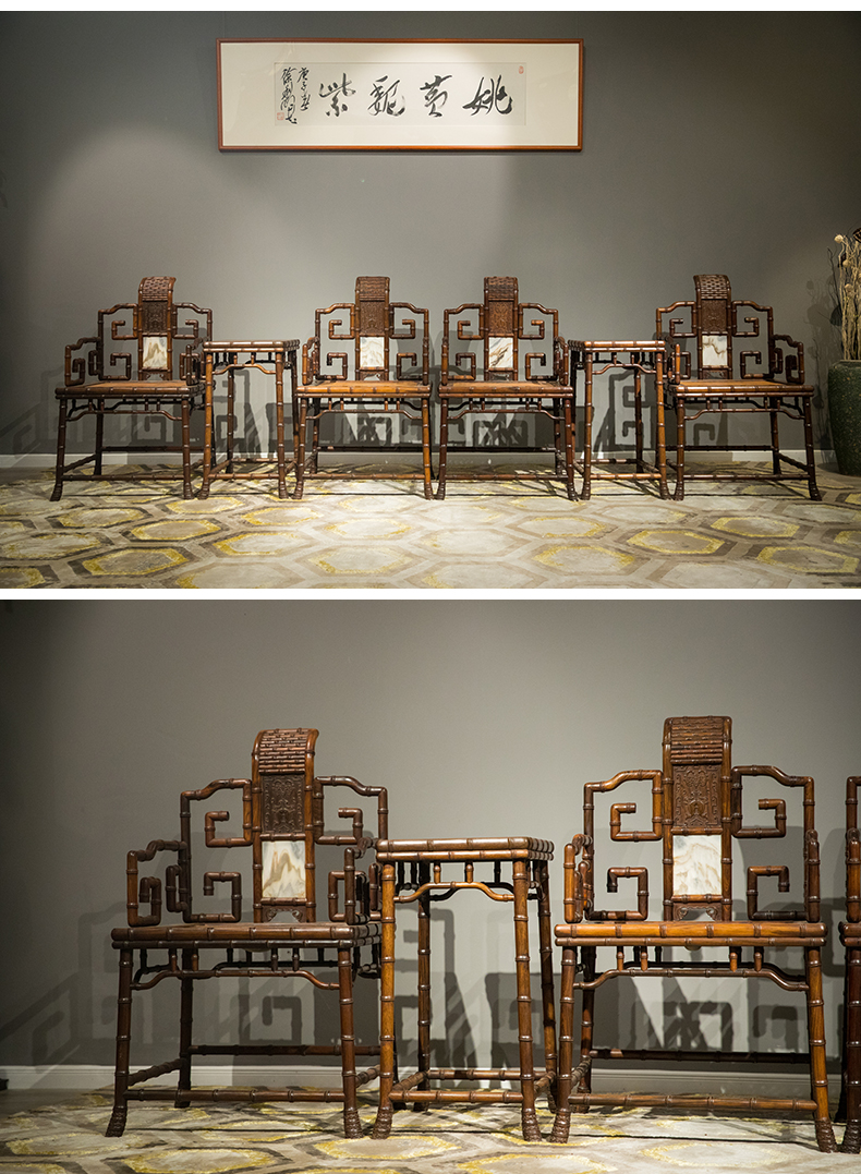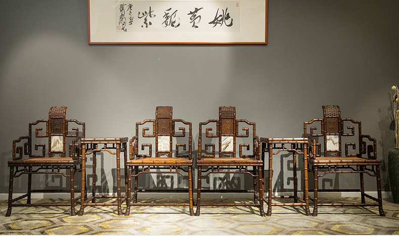 清 红木镶云石竹节工扶手椅成堂(四椅两几)