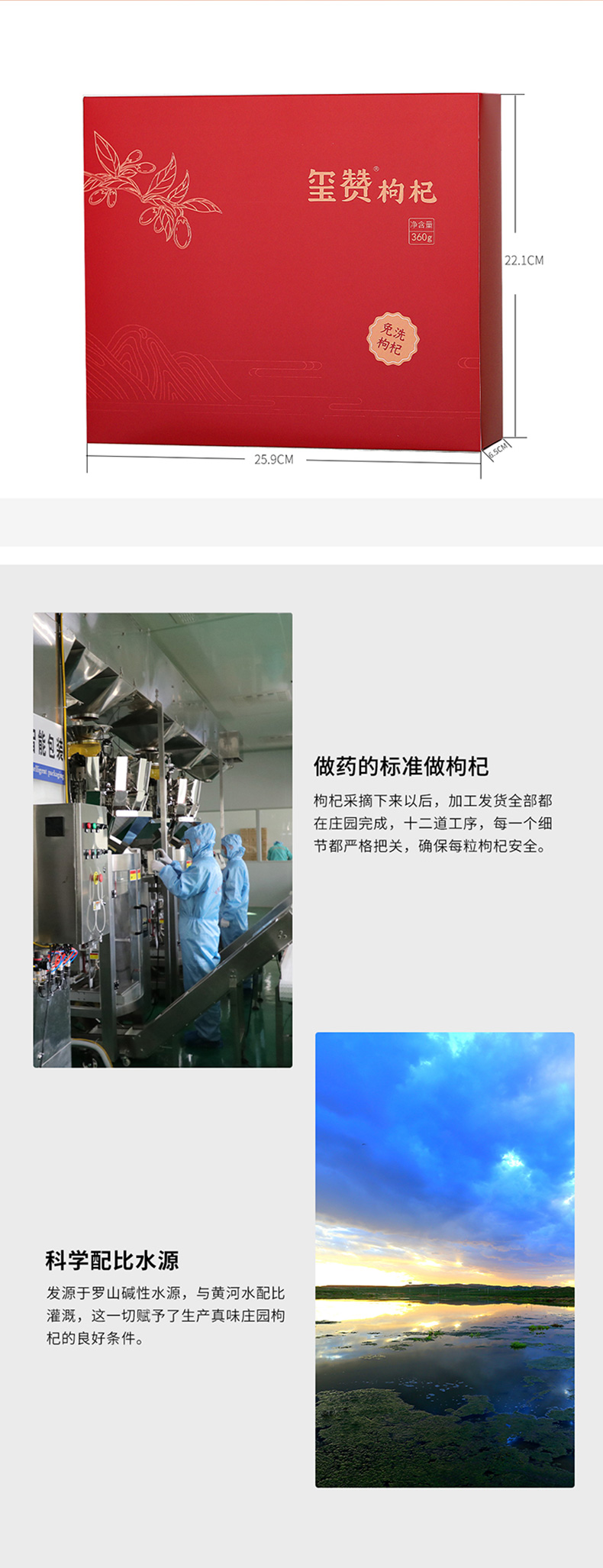 - 玺赞公司位于中国枸杞之乡—宁夏中宁县。在中宁枸杞红柳沟小产区建高标准枸杞种植基地一万三千亩—玺赞生态枸杞庄园,实现了研发、种植、加工、营销、文旅、生态“六位一体”的现代枸杞全产业链企业,本店是玺赞微店
