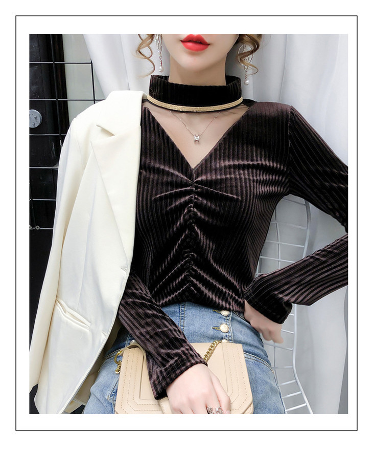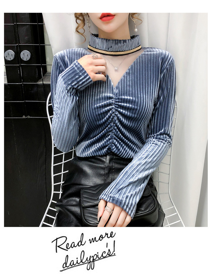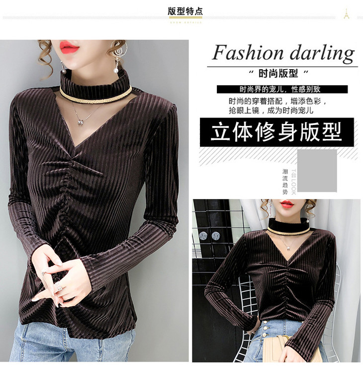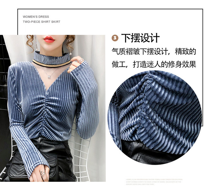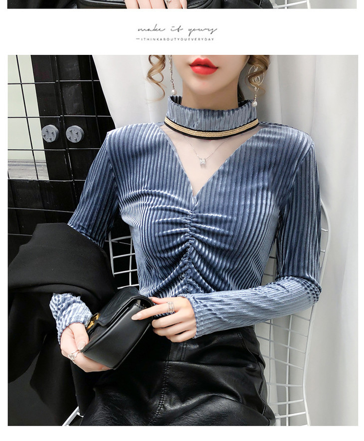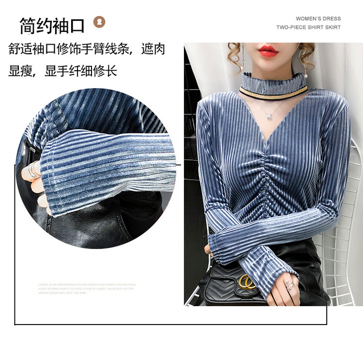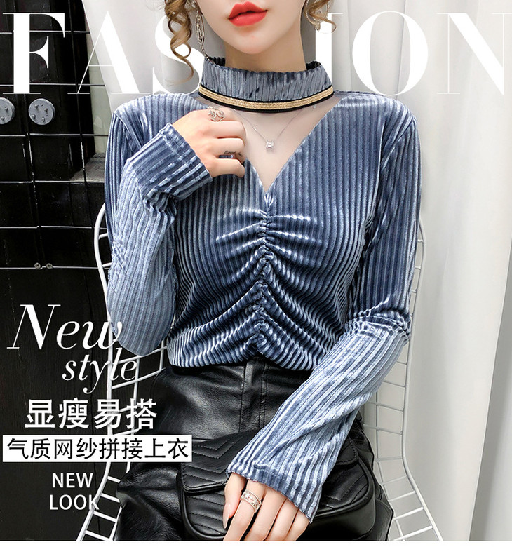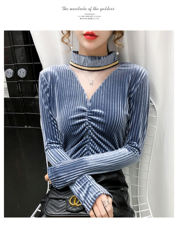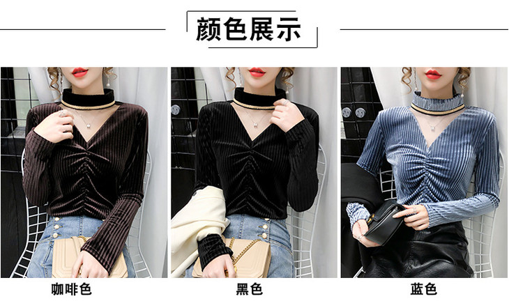 HT-5393新款韩版网纱拼接压褶金丝绒V领打底衫