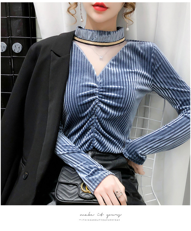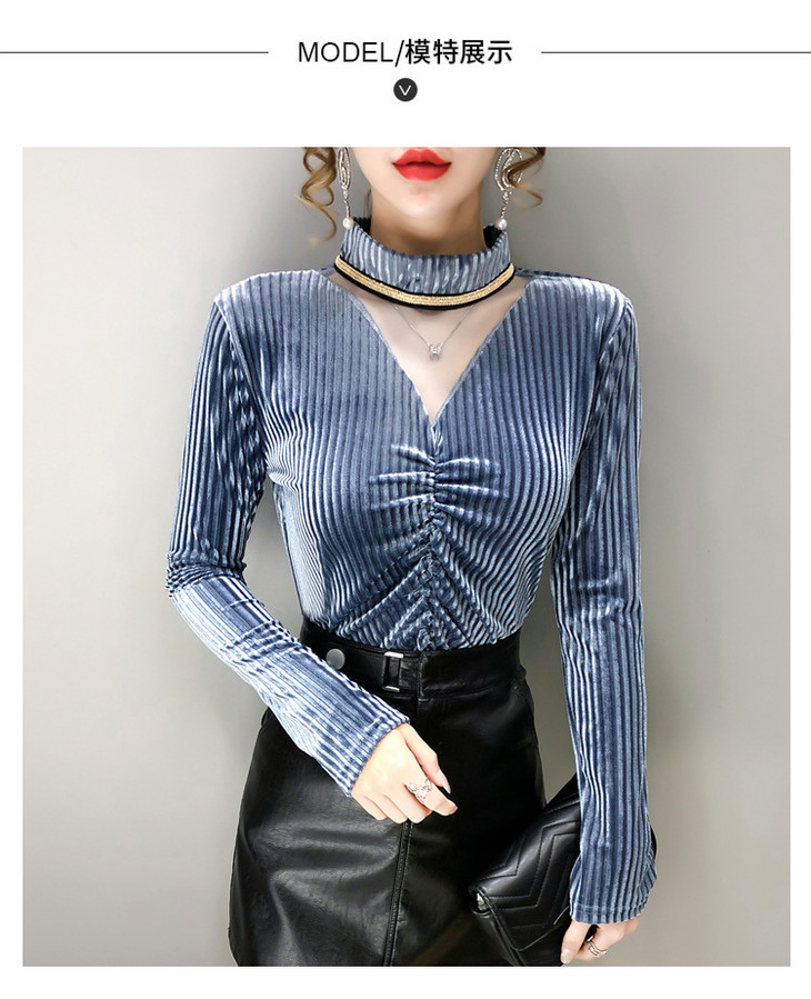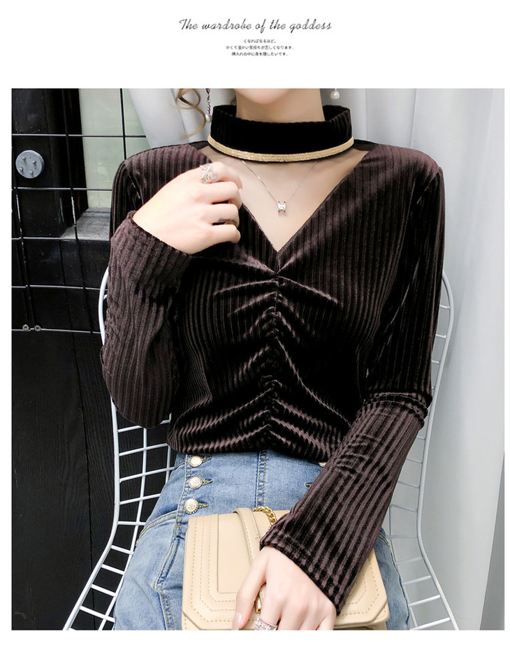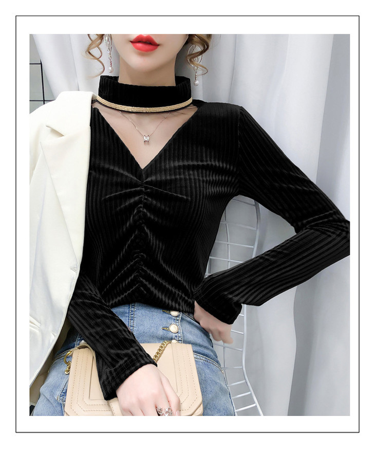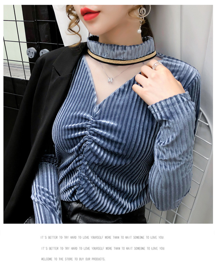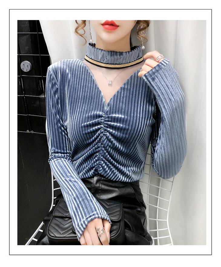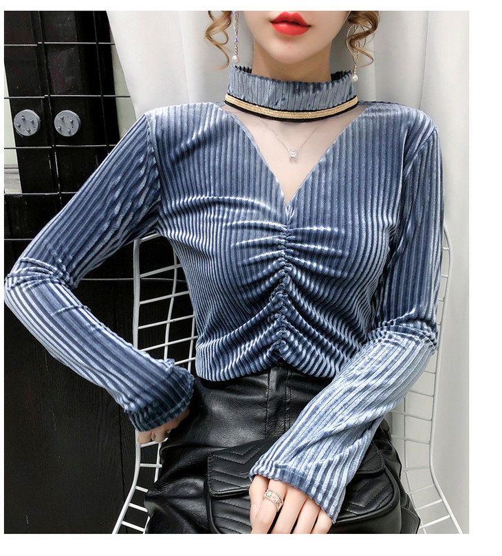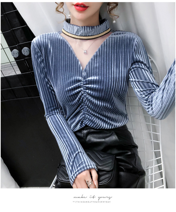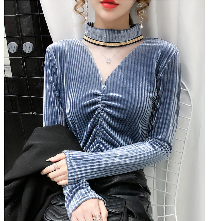 HT-5393新款韩版网纱拼接压褶金丝绒V领打底衫