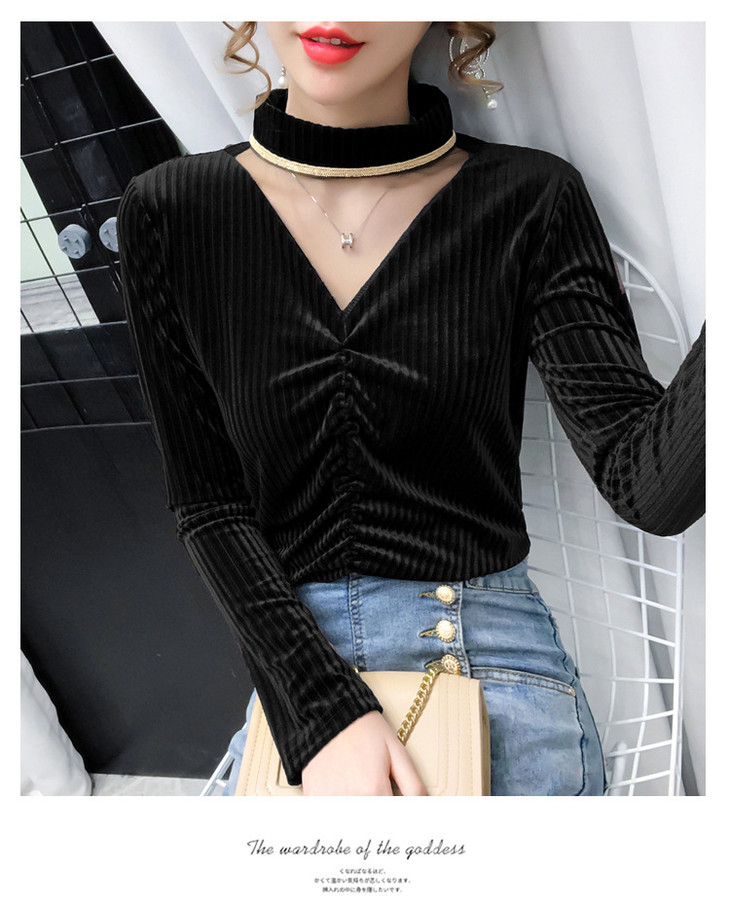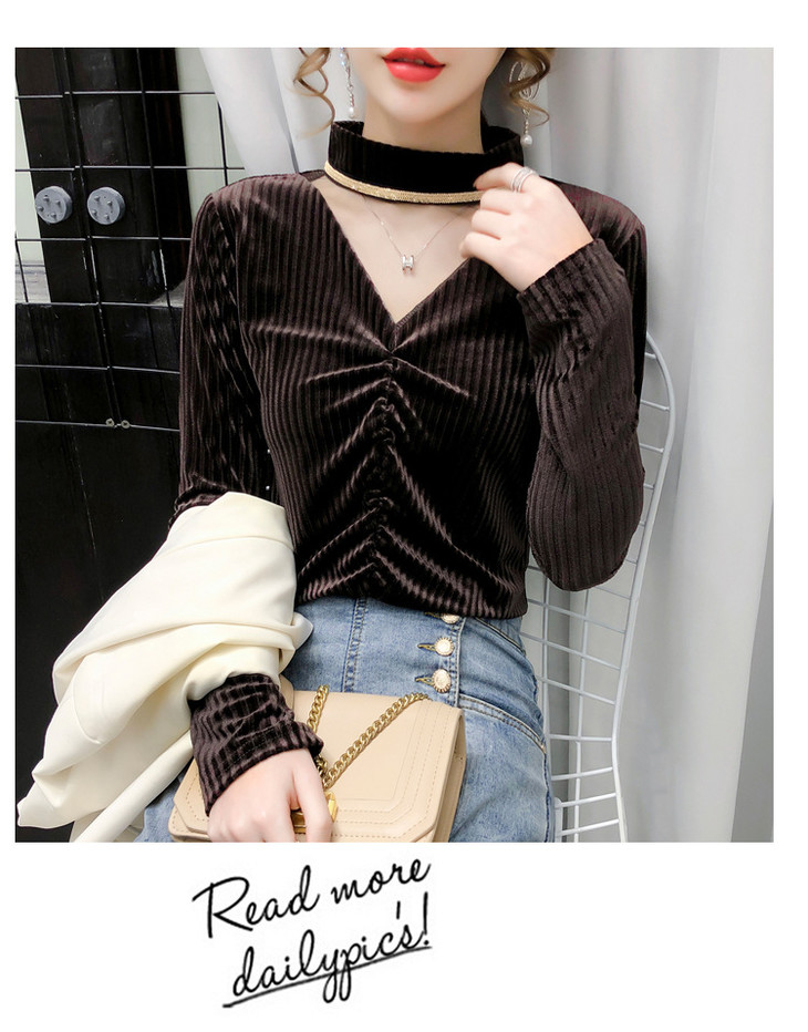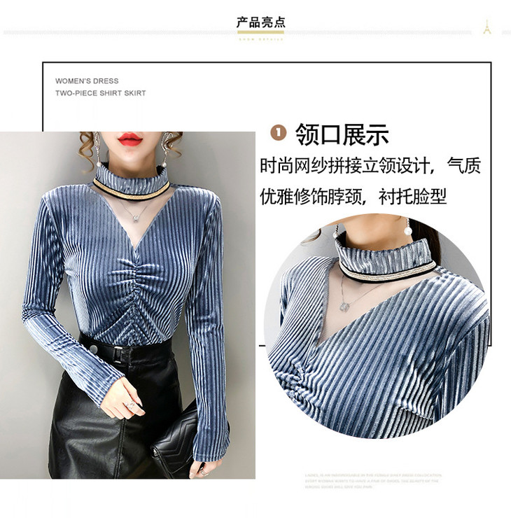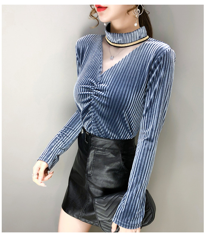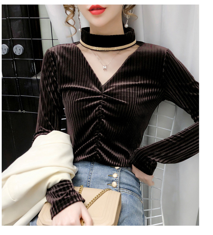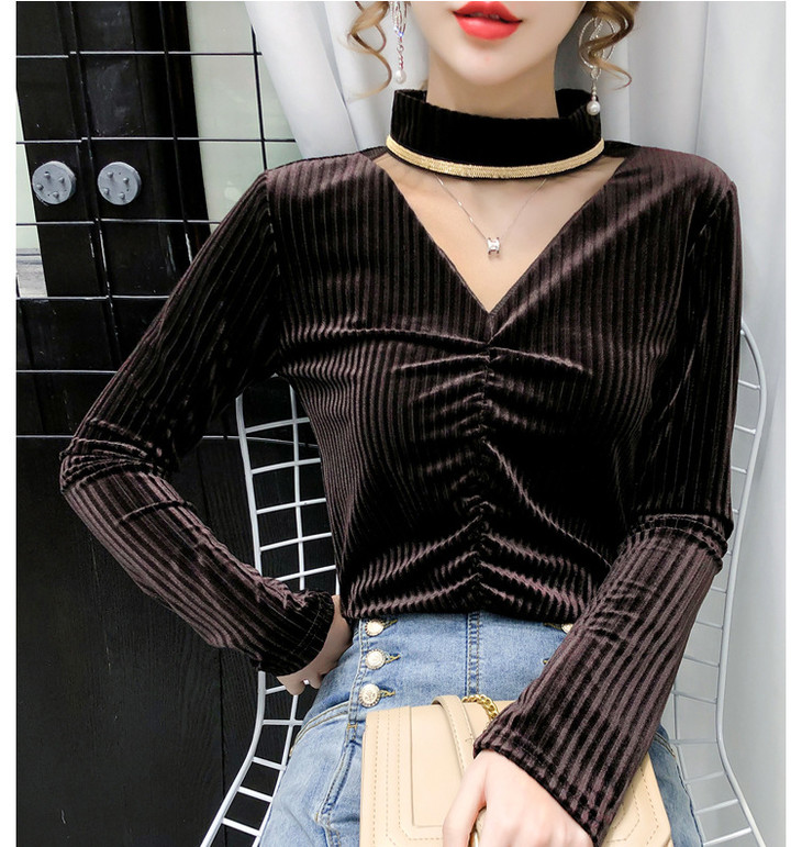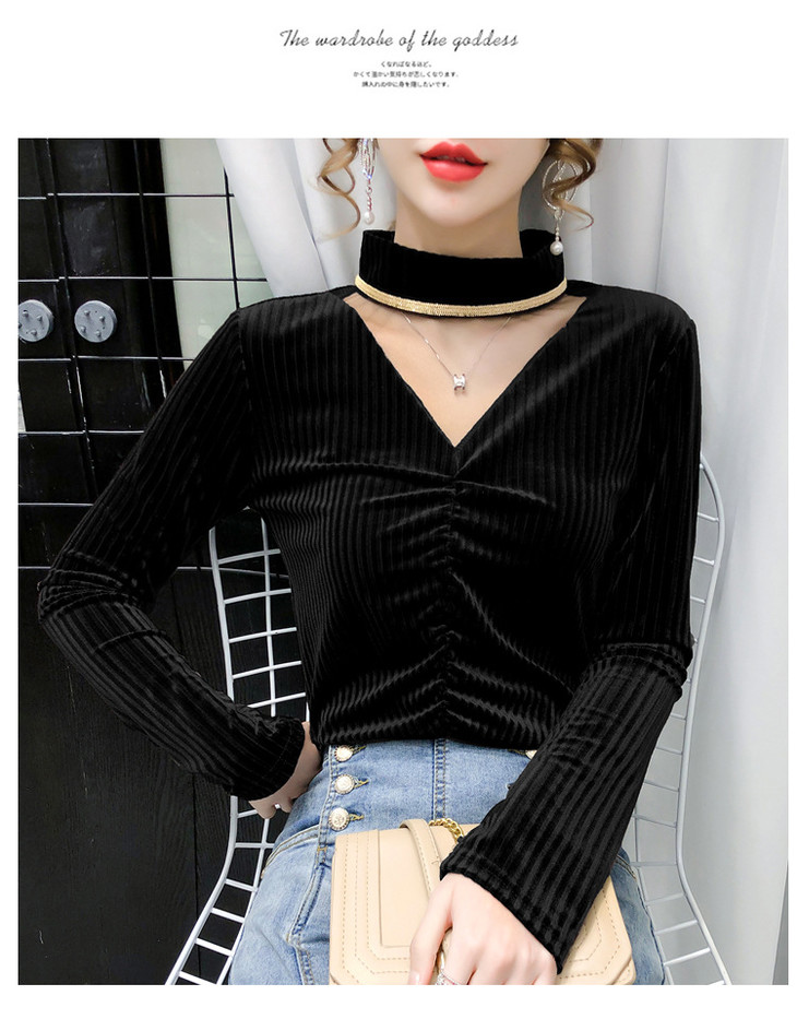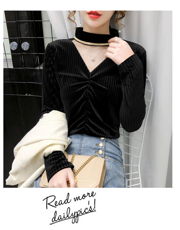 HT-5393新款韩版网纱拼接压褶金丝绒V领打底衫