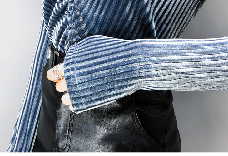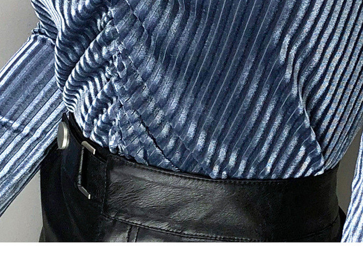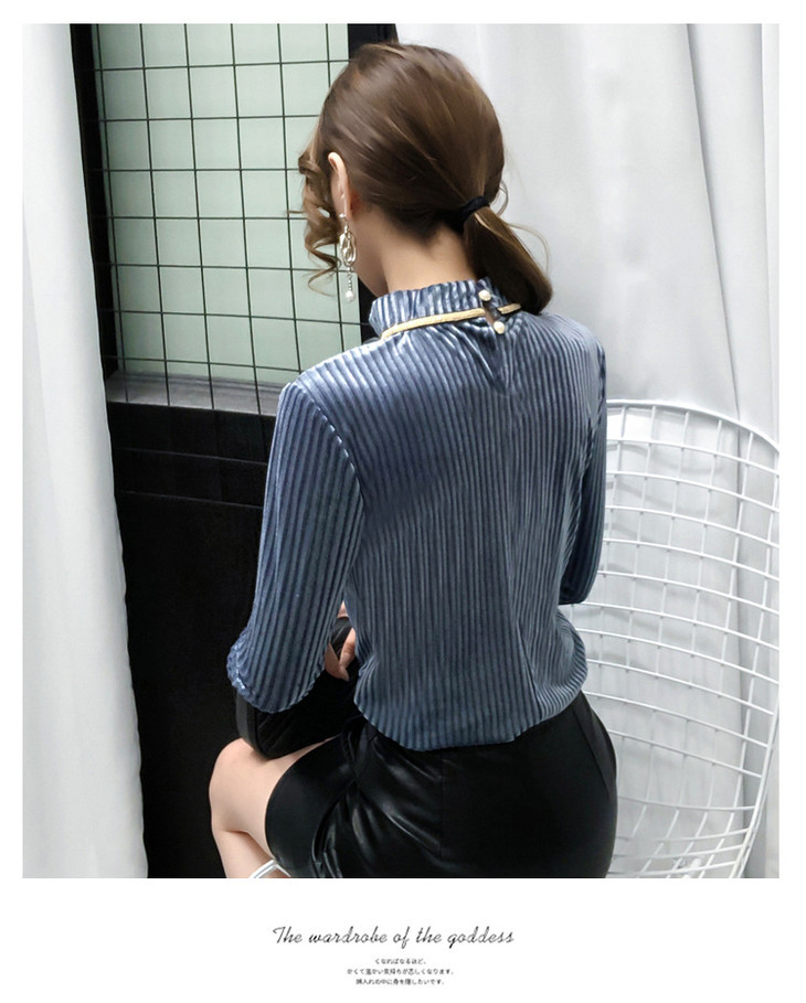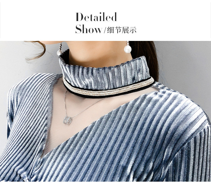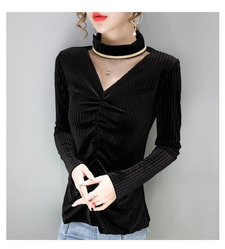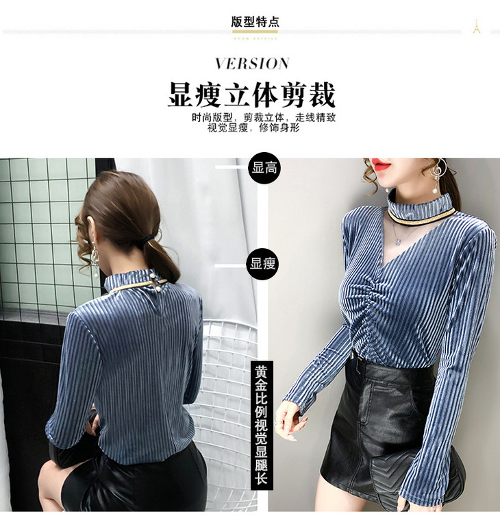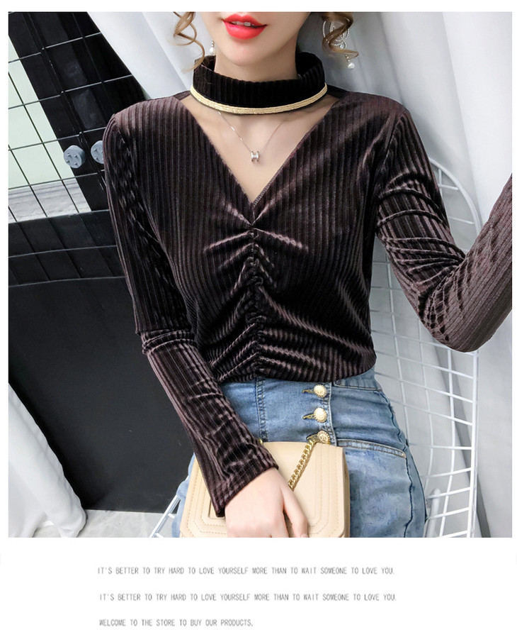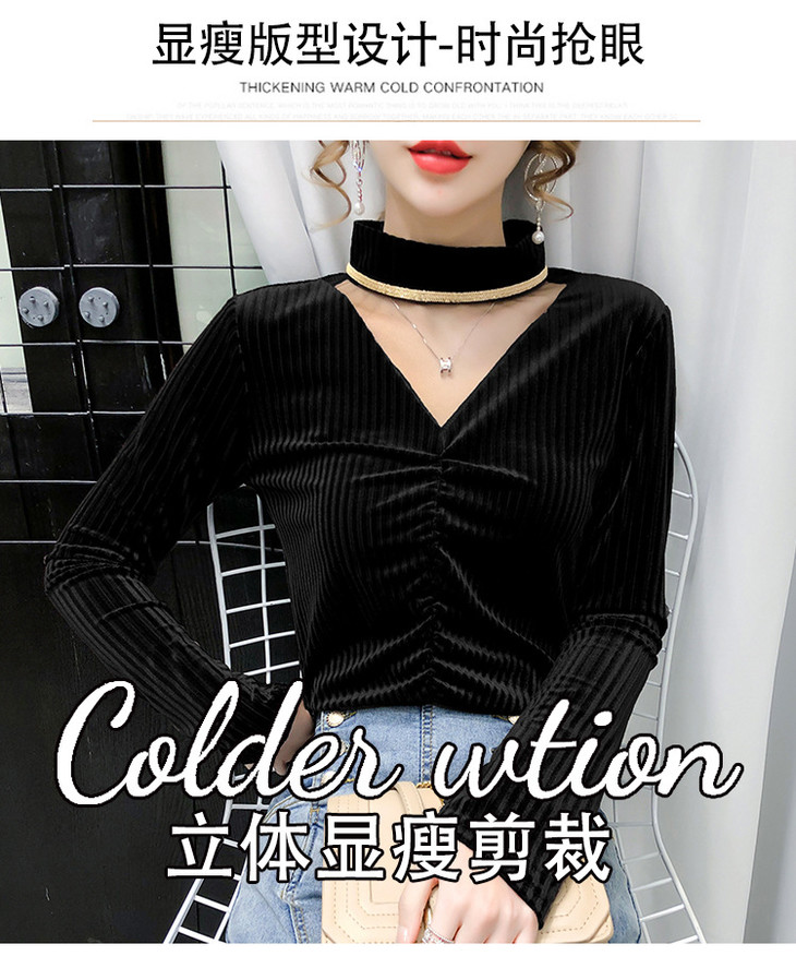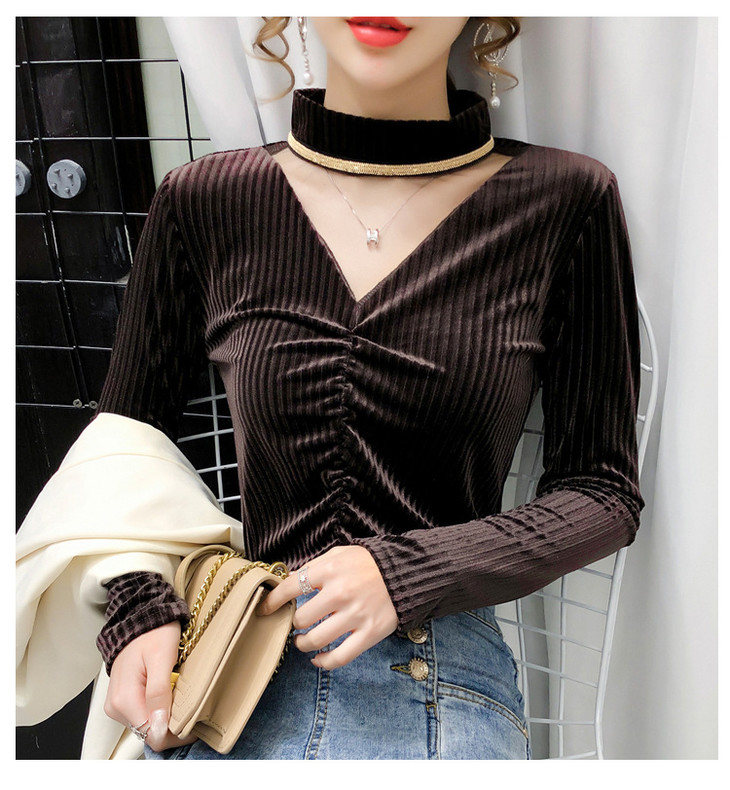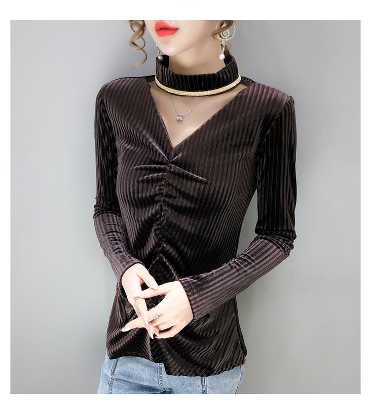 HT-5393新款韩版网纱拼接压褶金丝绒V领打底衫