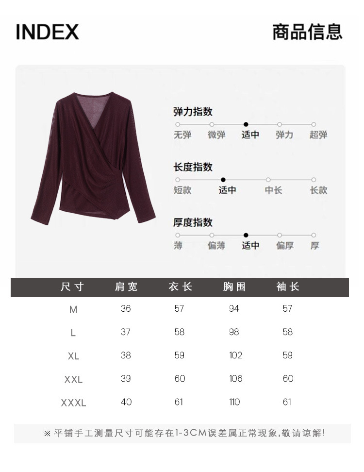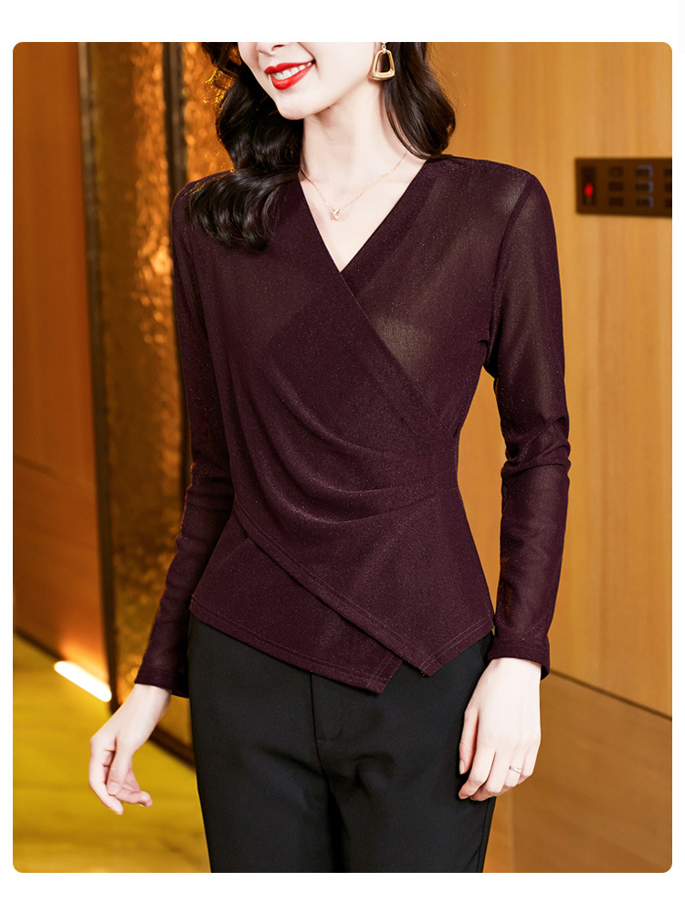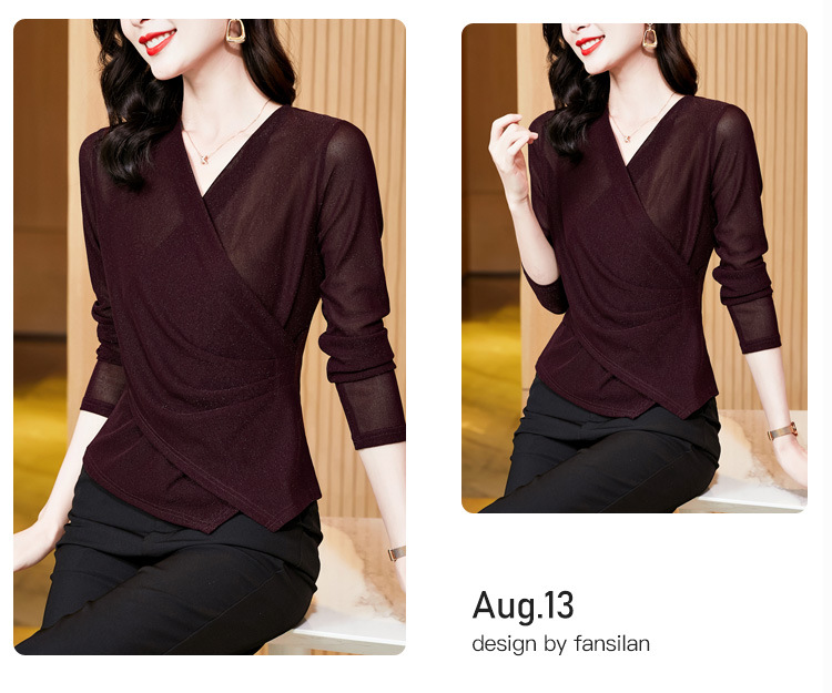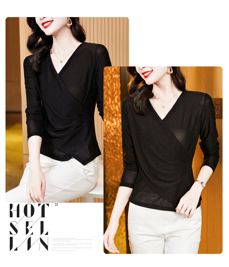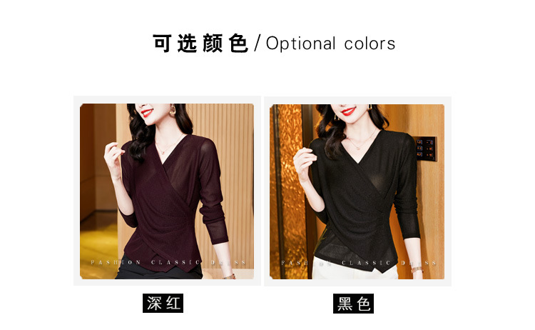 KQL E37M2937气质交叉V领纯色长袖打底衫修身显瘦t恤