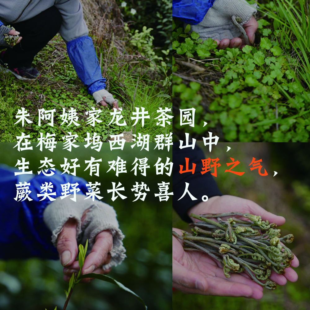 这块茶田位于龙井梅家坞茶区,属于龙井一级产区,茶田周围群山如屏,云蒸雾绕,温差适宜,保证了正宗老味道的龙井茶。