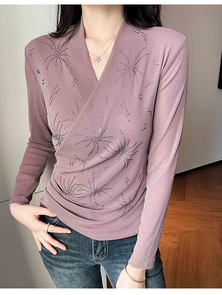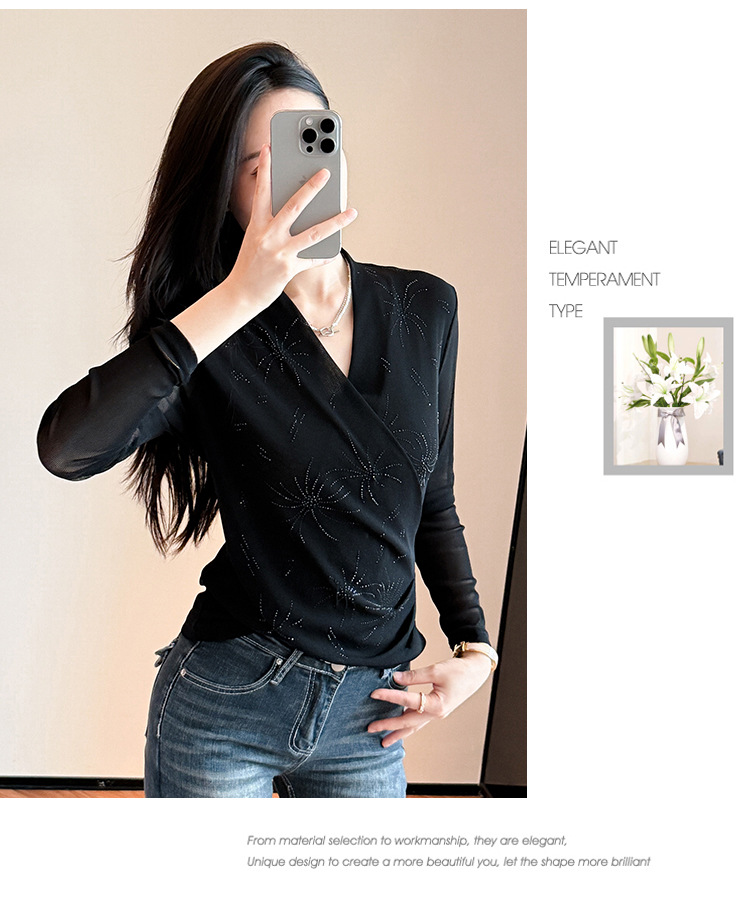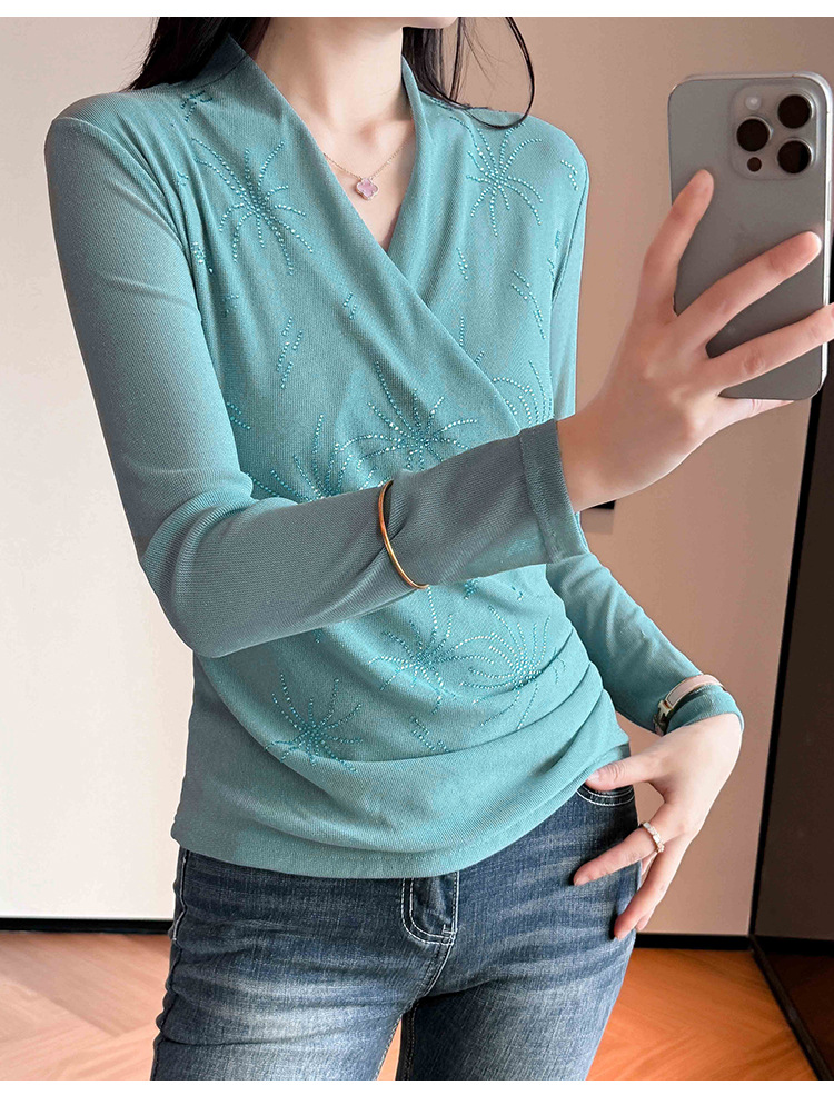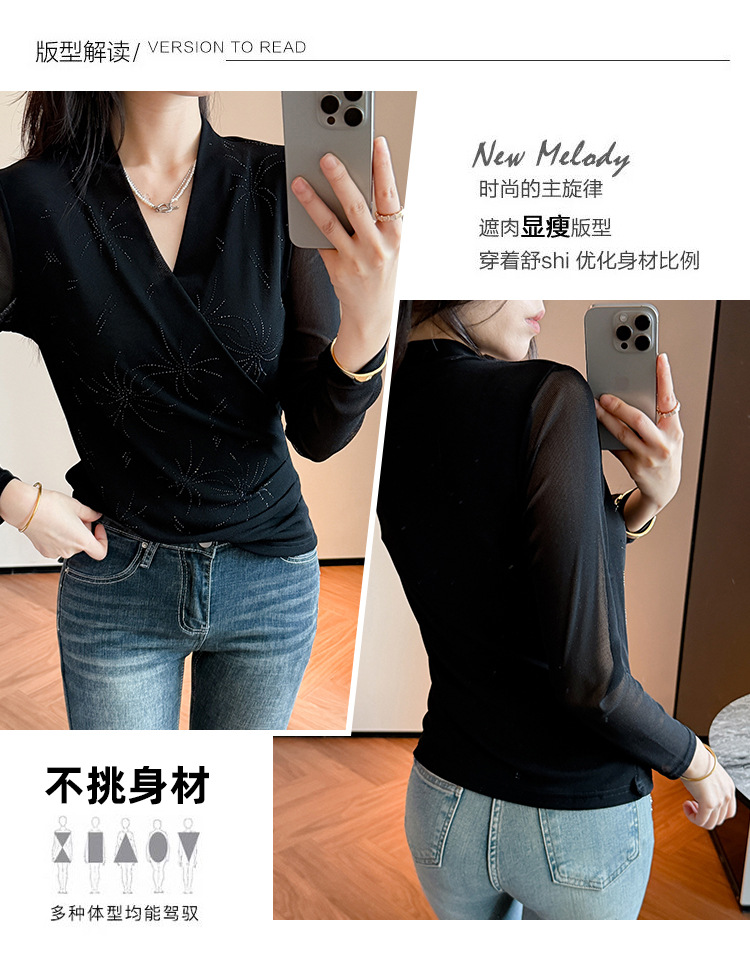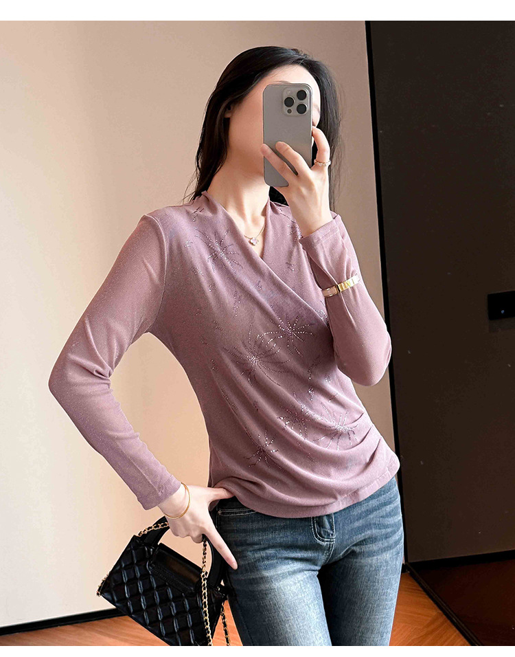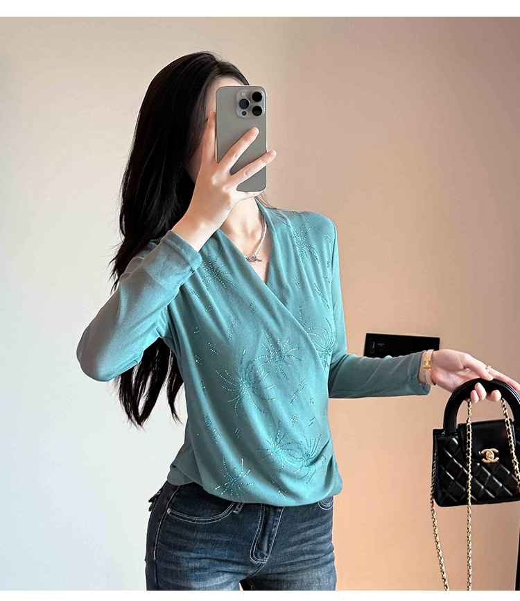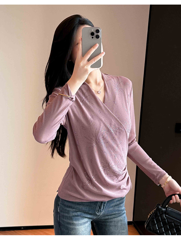 KQL311H9120 2025年秋季新款V领烫钻修身长袖洋气T恤百搭纯欲风抗起球显瘦小衫