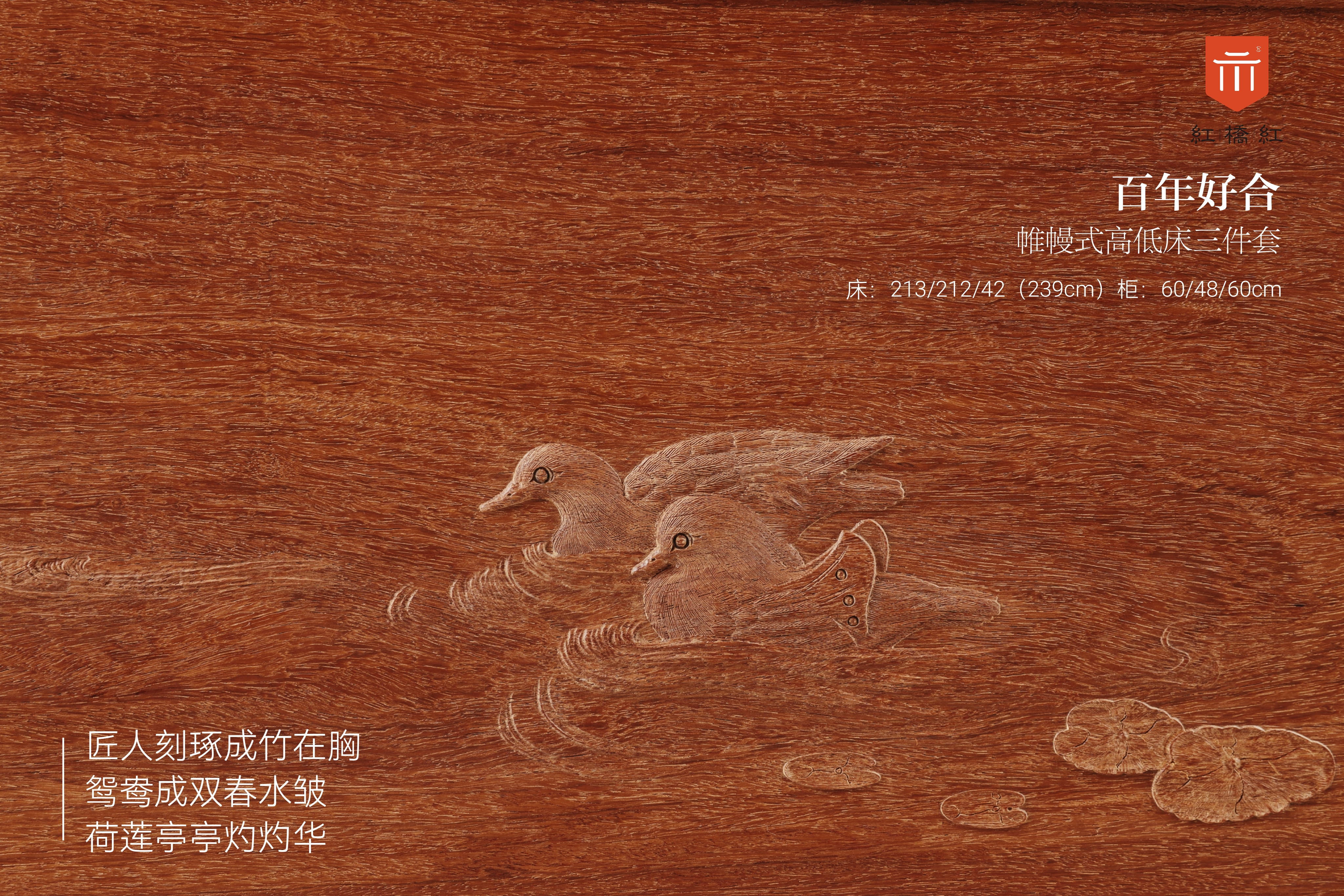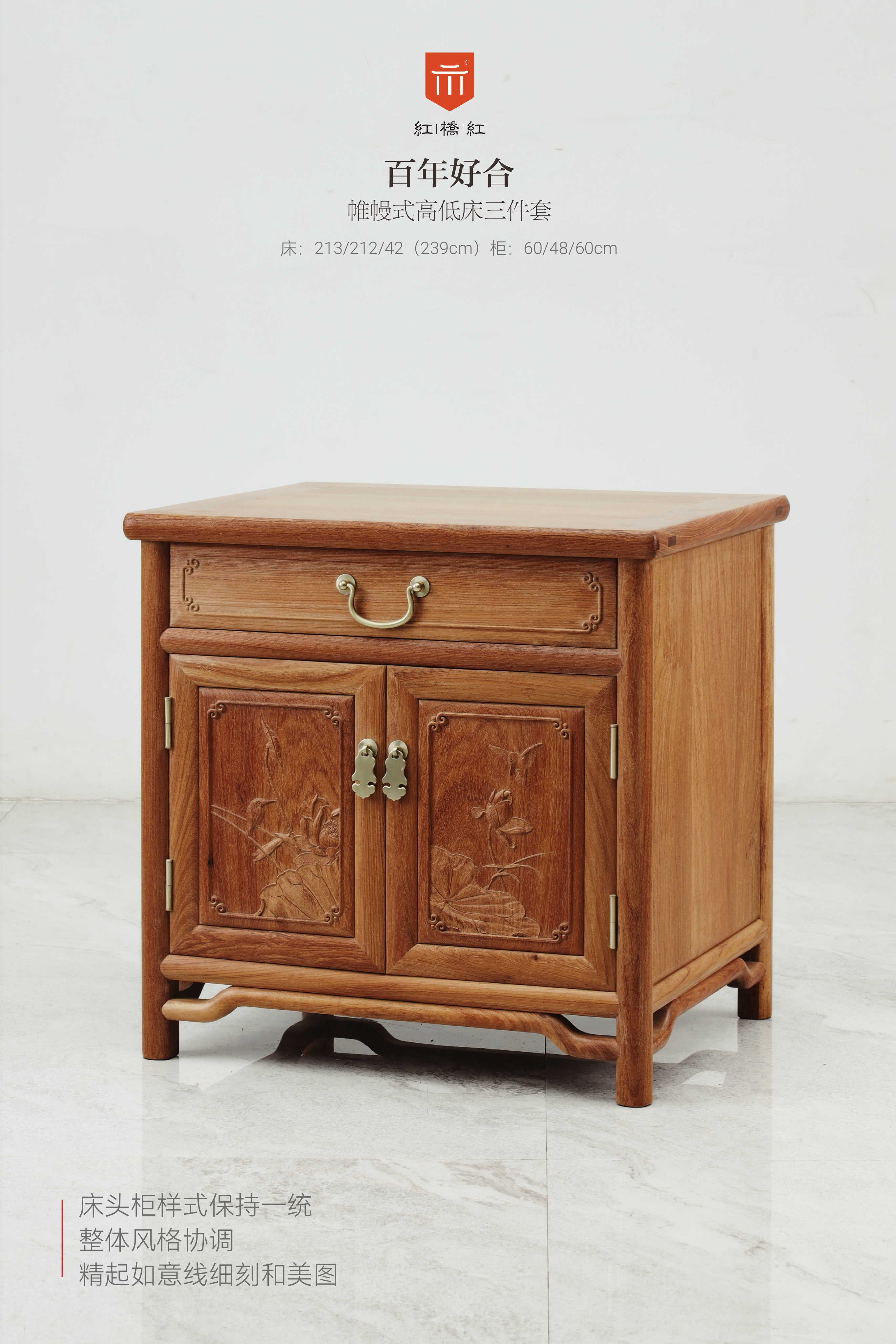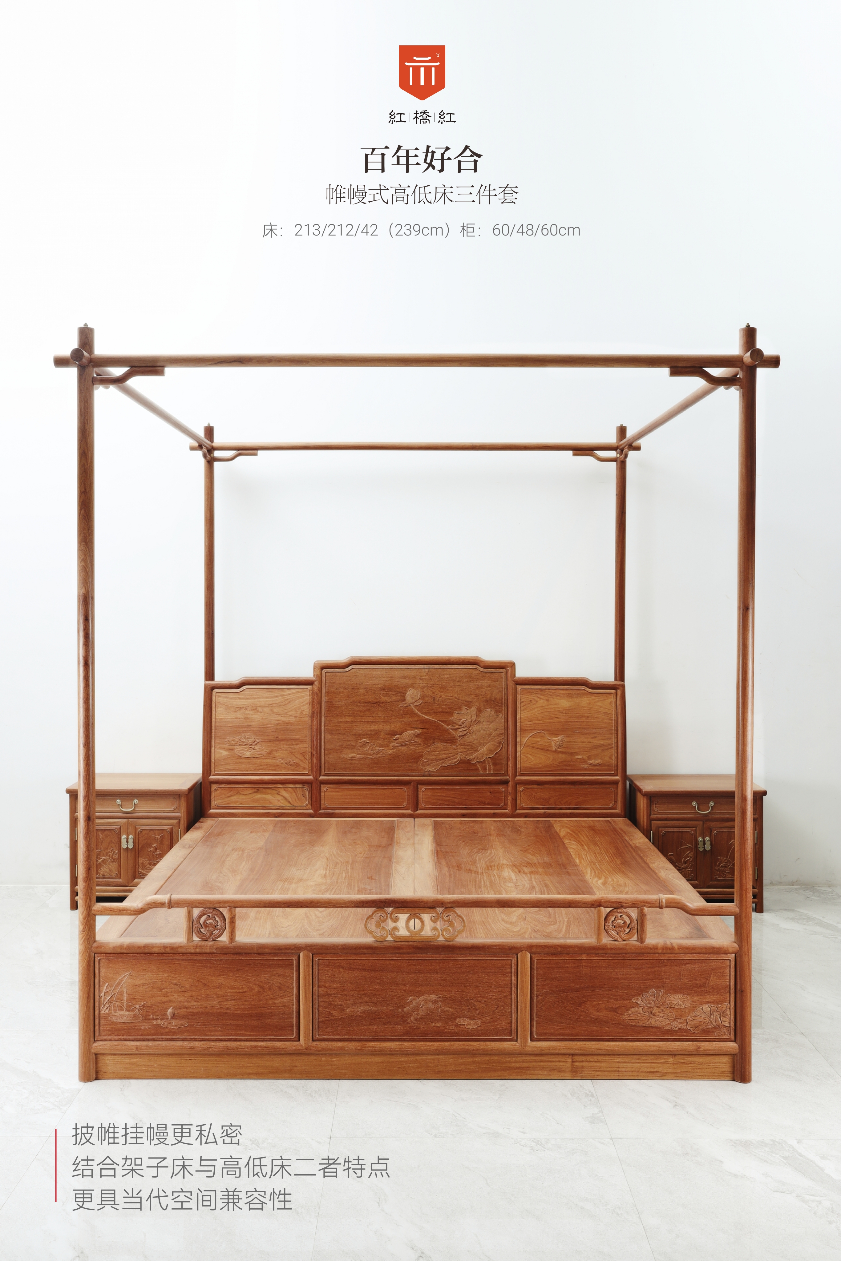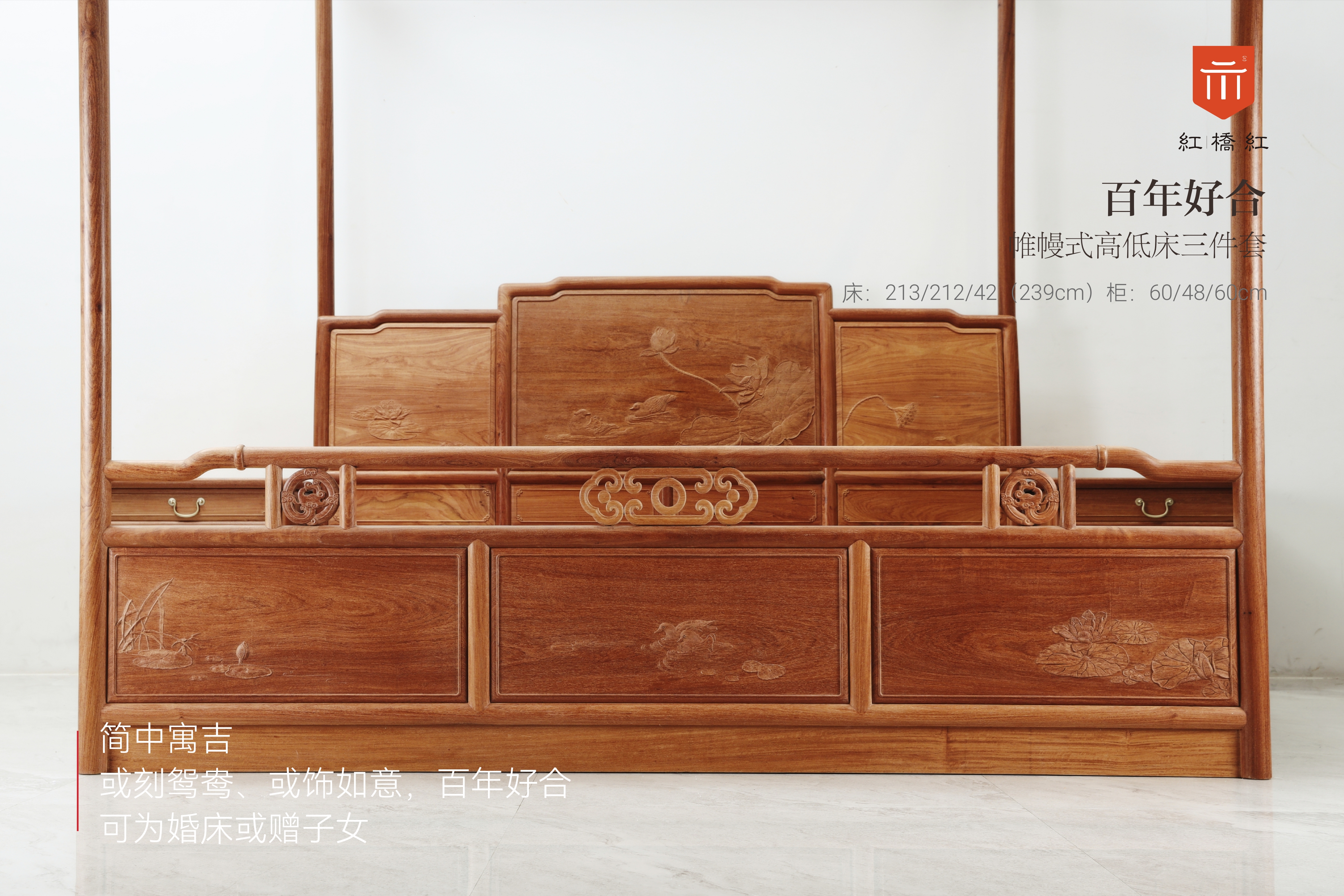 整体攒框后弯,有利于提高休憩、倚靠时的舒适度,雕饰则以鸳鸯、荷莲为题材,布于靠背,床尾及床身两侧,图案简练,动植物生动传神,有百年好合、和和美美的寓意;床尾板三片绦环板上有圆材,竹节形罗锅枨,下连矮老饰如意纹卡子花,祥云螭龙纹卡子花,颇得明韵,床头柜依床体造型设计,屉面起如意委角线,对开料柜门有雕饰,圆腿足间安罗锅枨,整体大气简练,尤其适合婚嫁之用。