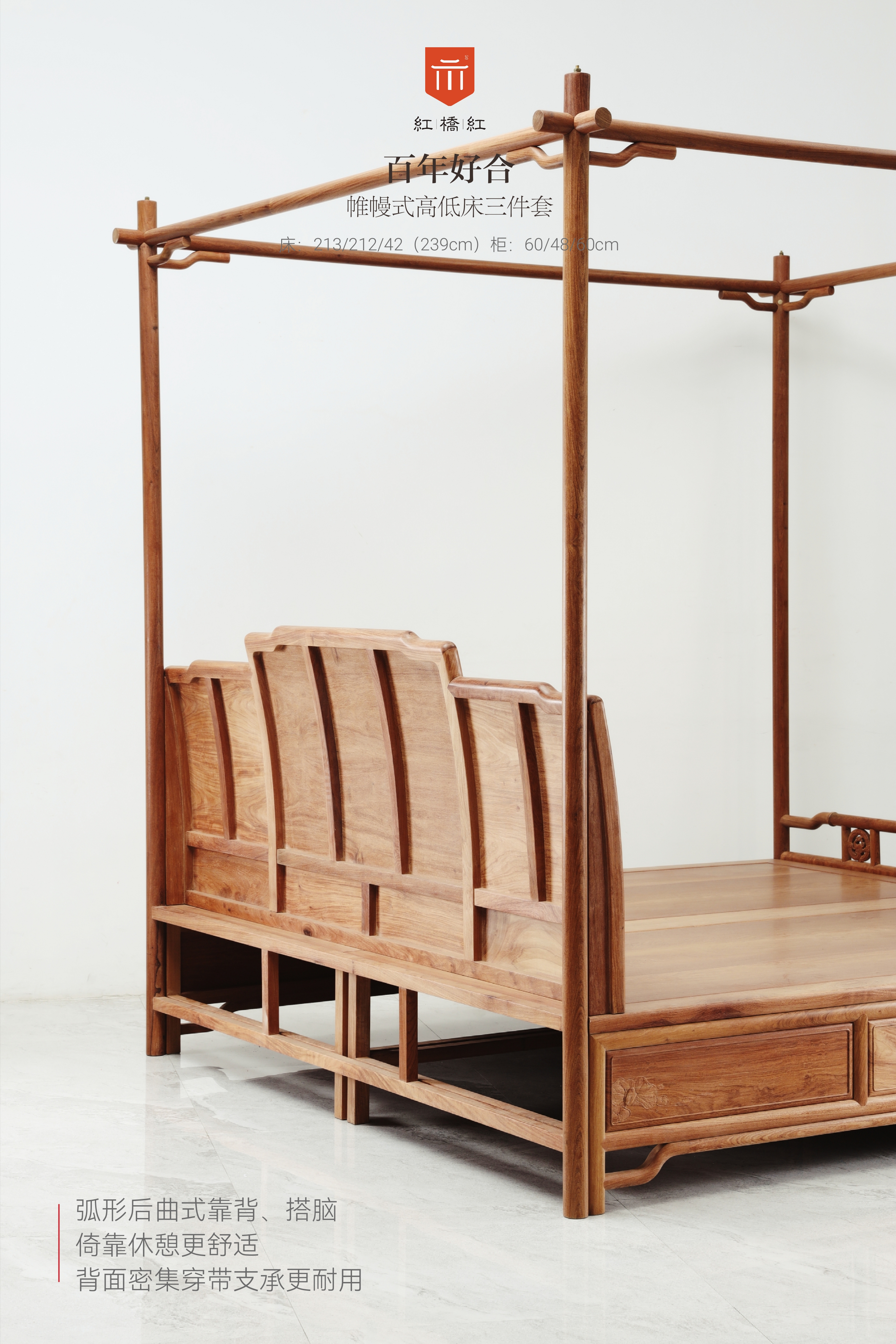 这款床铺体量比较大,长宽均在2米1出头,是以高低床为基本形态,床身四周起圆材立柱,两两以横杆连接辅以挂牙,方便披挂帷幔、纱帐,形成架子床一般的独立而私密的空间,靠背板中间高两侧低,错落有致。