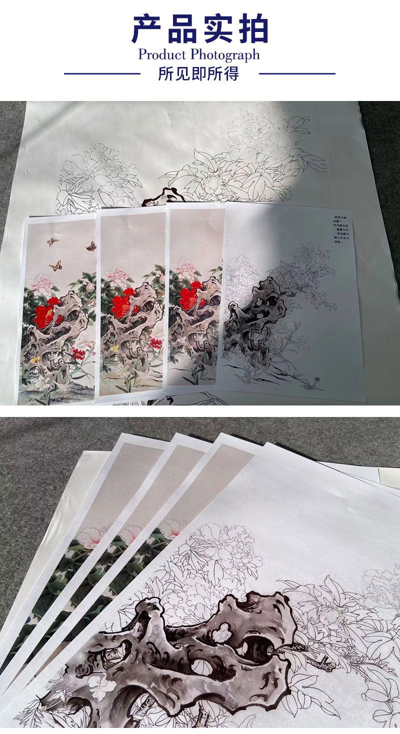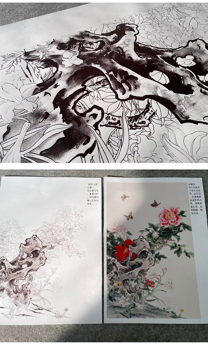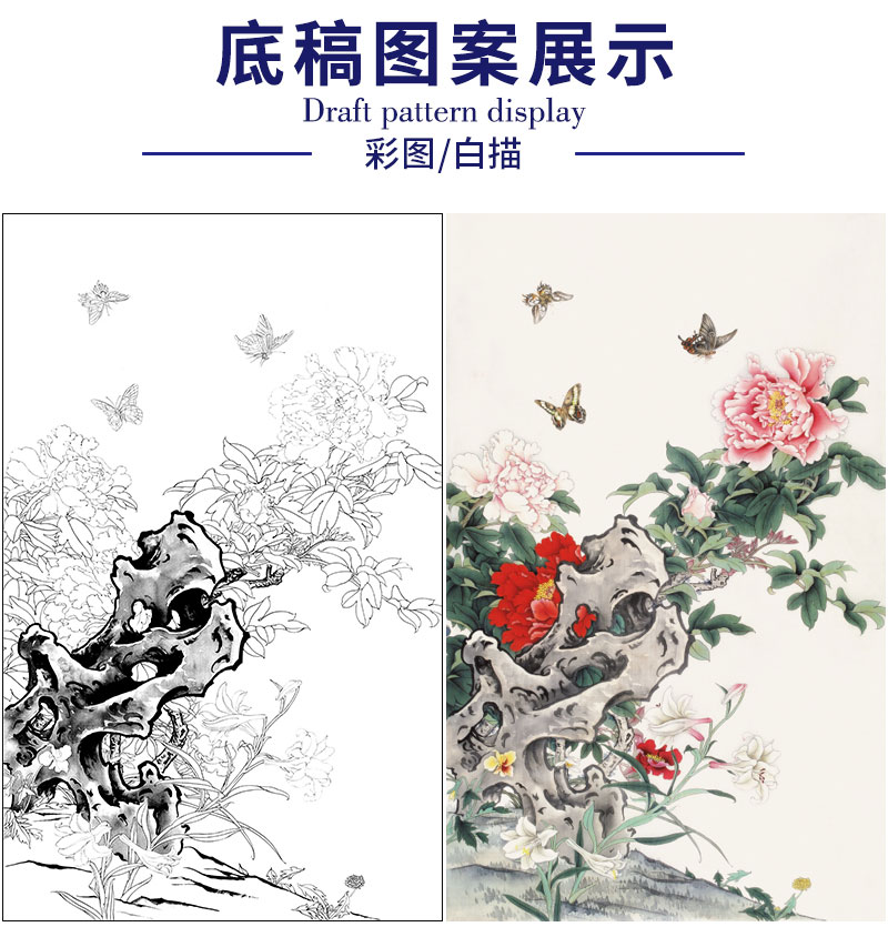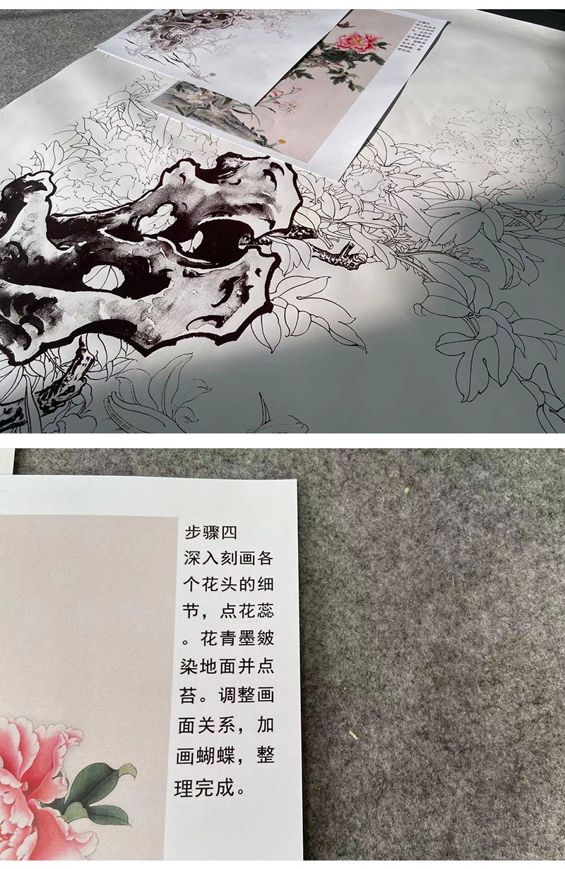 【有步骤】陈军工笔画白描底稿《群芳斗艳》牡丹蝴蝶初学者临摹花鸟线稿CJ13