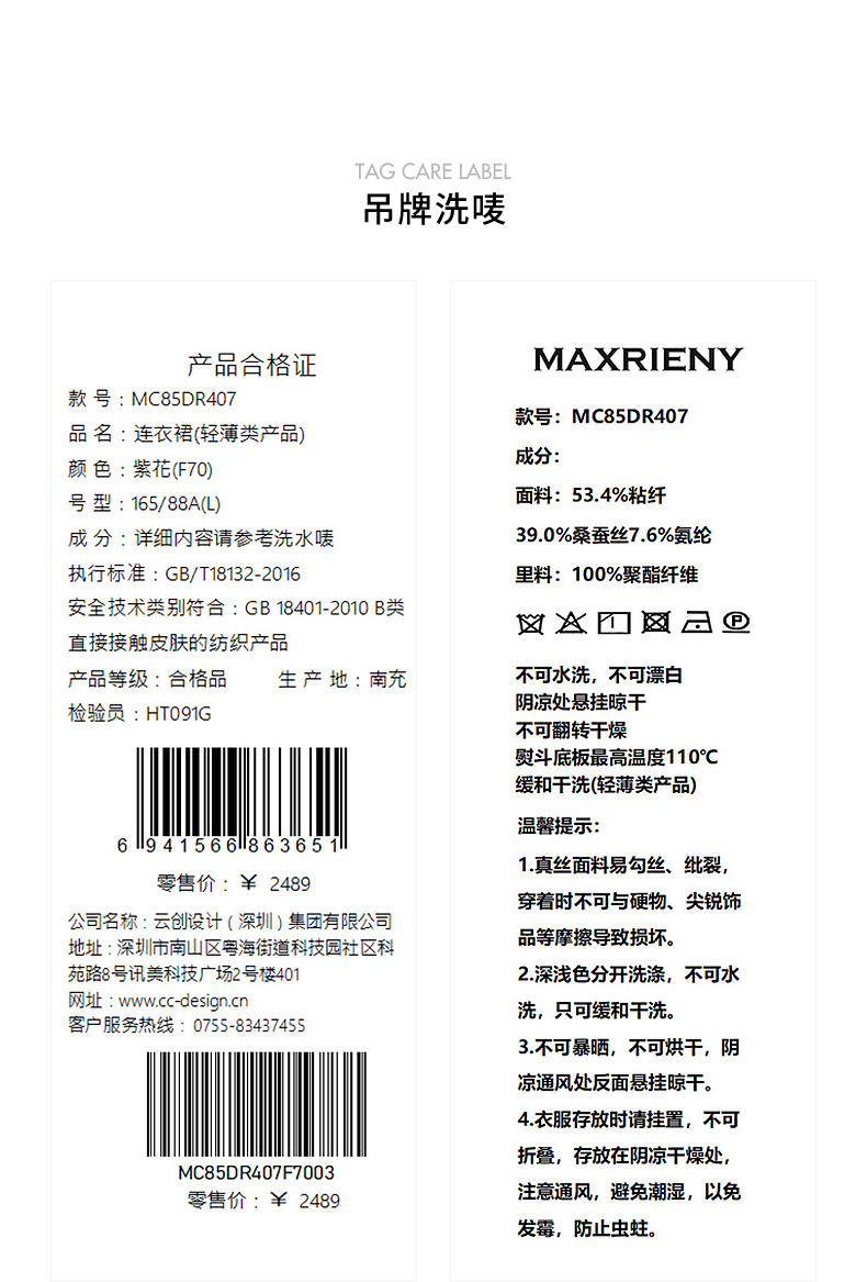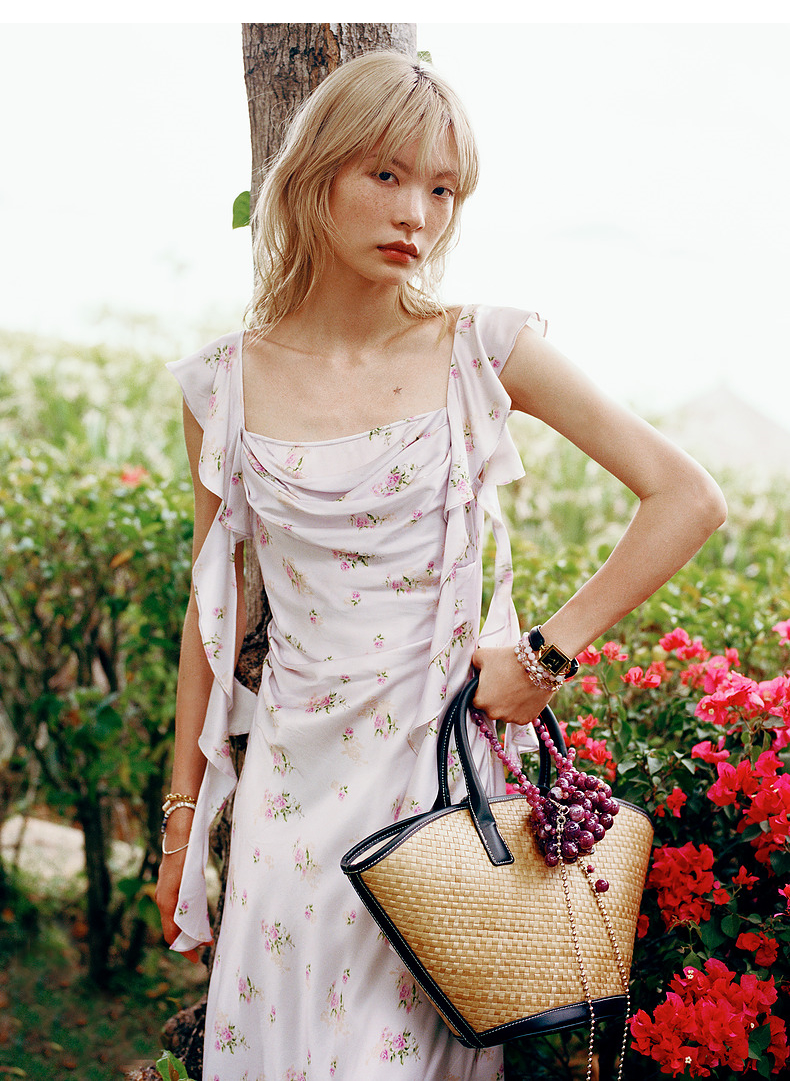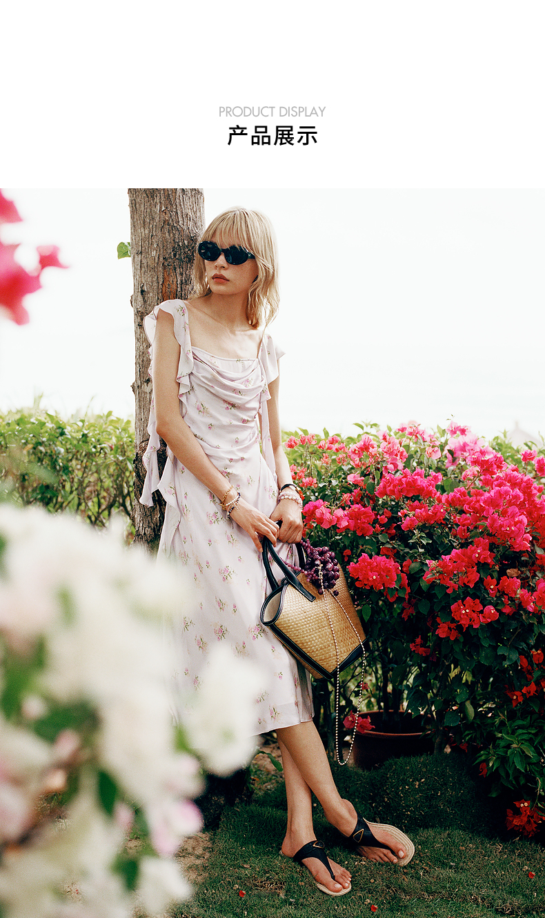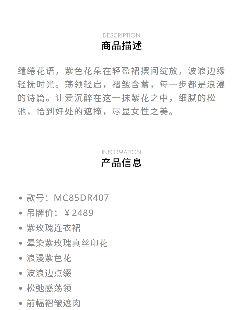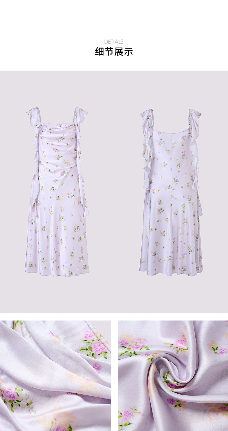 【浪漫度假-商场同款】MAXRIENY紫玫瑰连衣裙波浪花边真丝印花(货号:MC85DR407)
