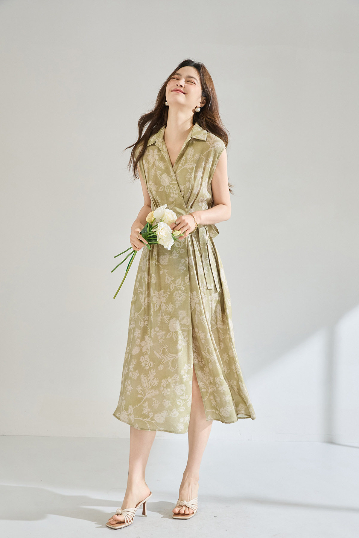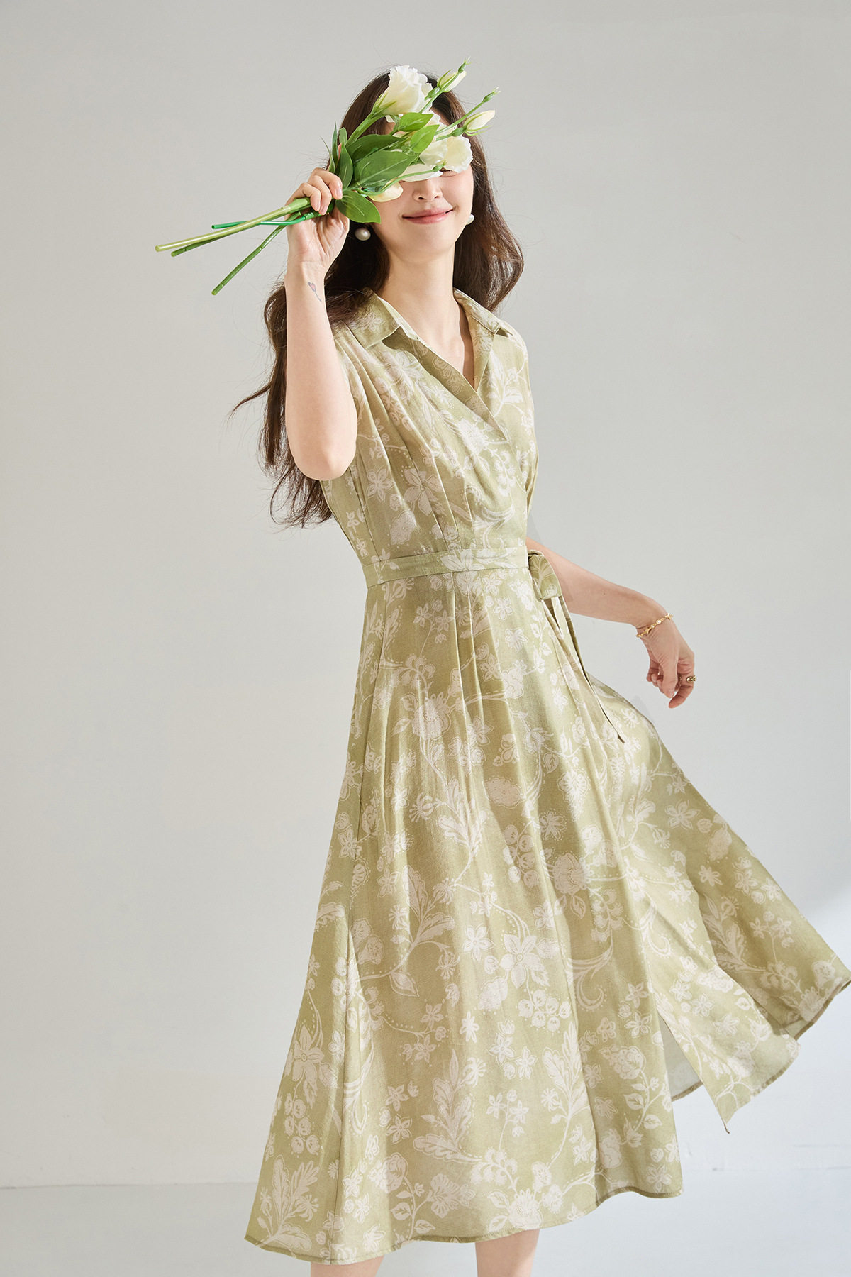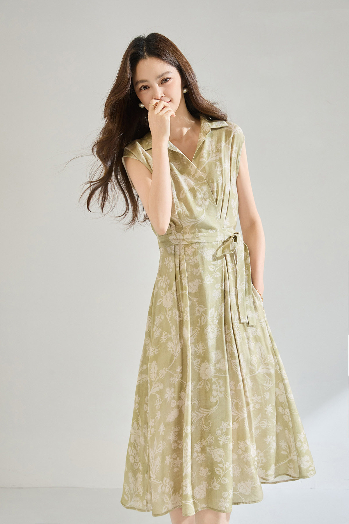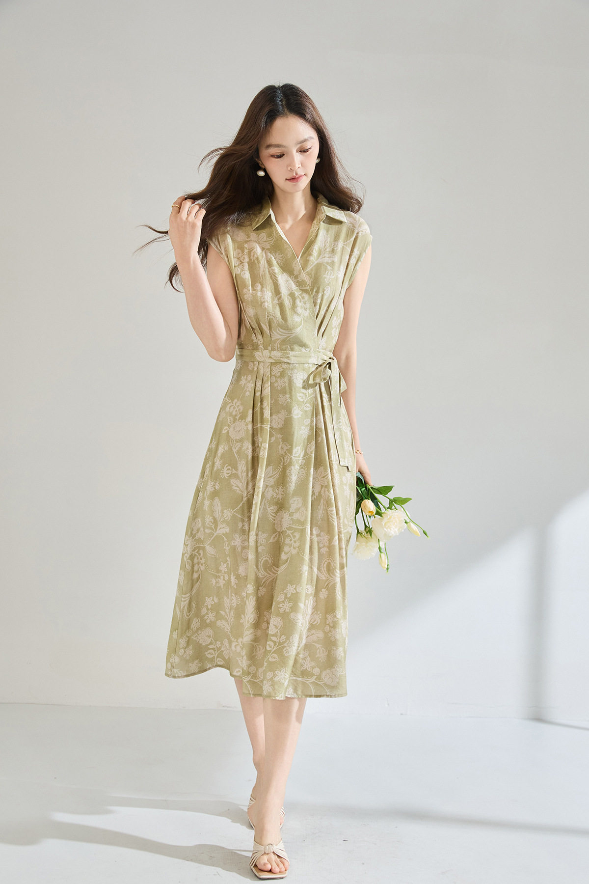 「高货sh」全新升级【铂金会员266/天猫359/差价93】(01806)洛诗琳法式淡雅印花衬衫裙2026春夏收腰显瘦无袖系带裙