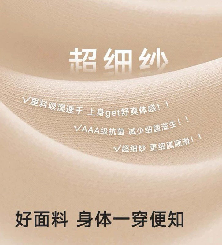 定织定染超细纱线 面料贴身细腻柔滑 软糯Q弹不松懈 身体就像被棉花包裹 即使炎热天气出汗也能被面料秒速吸湿 良好的透气性迅速达到速干效果 随时清爽舒适!!