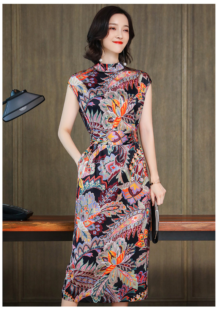MZC-19305高端修身印花收腰复古重磅真丝连衣裙