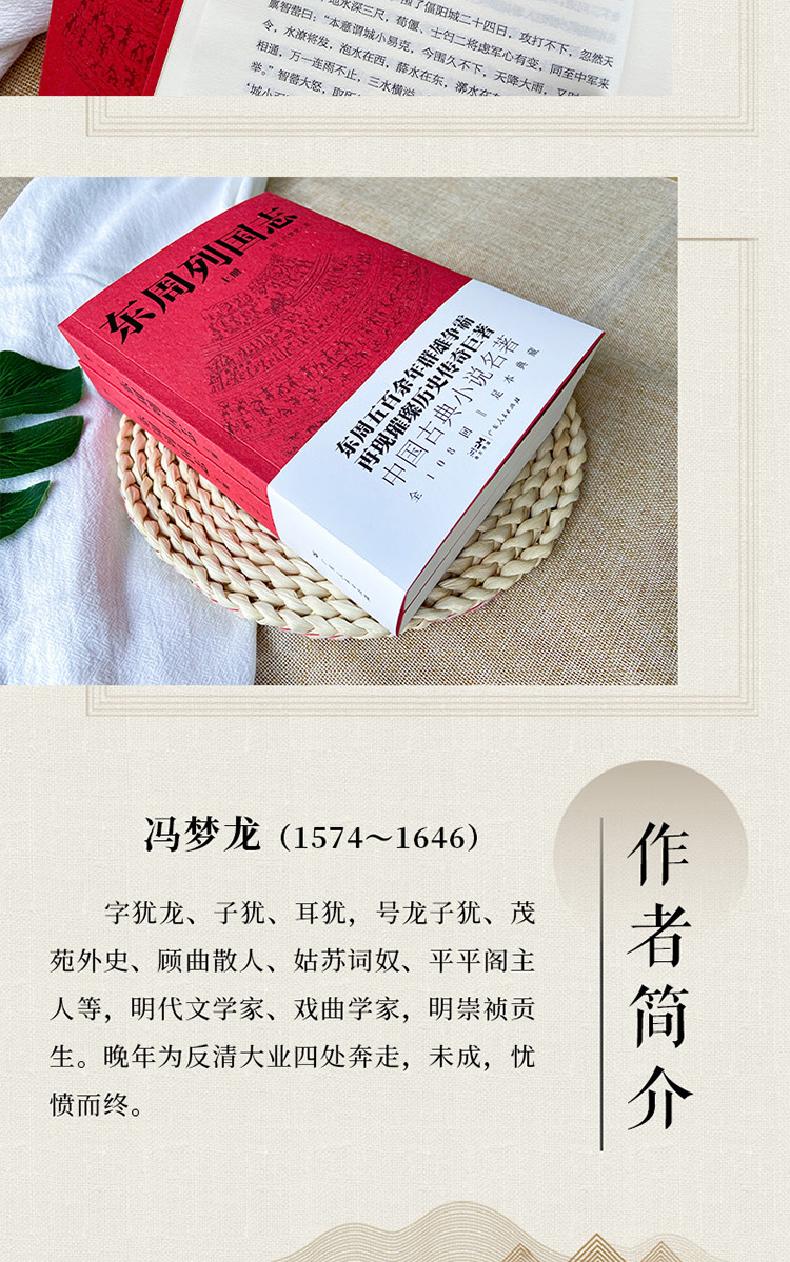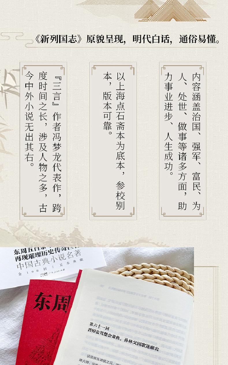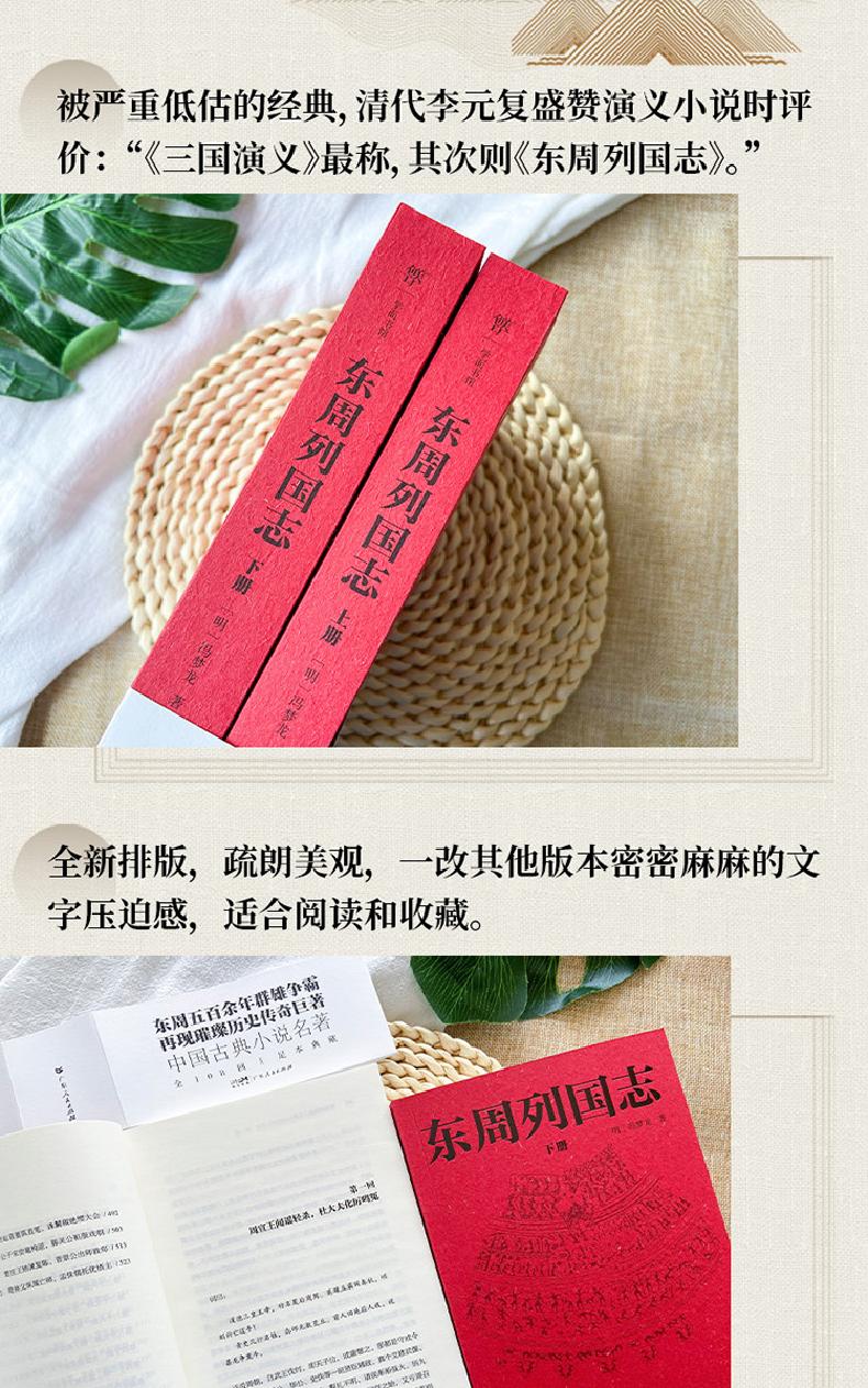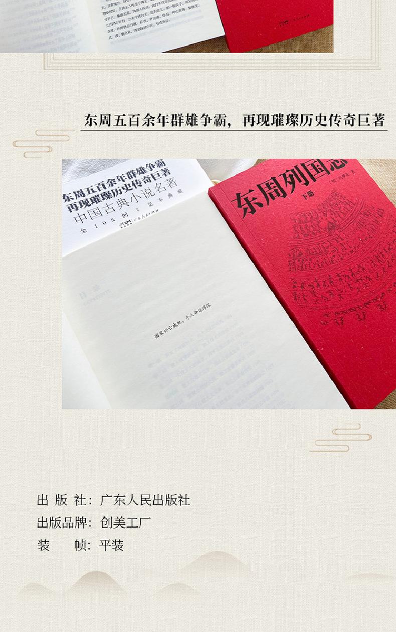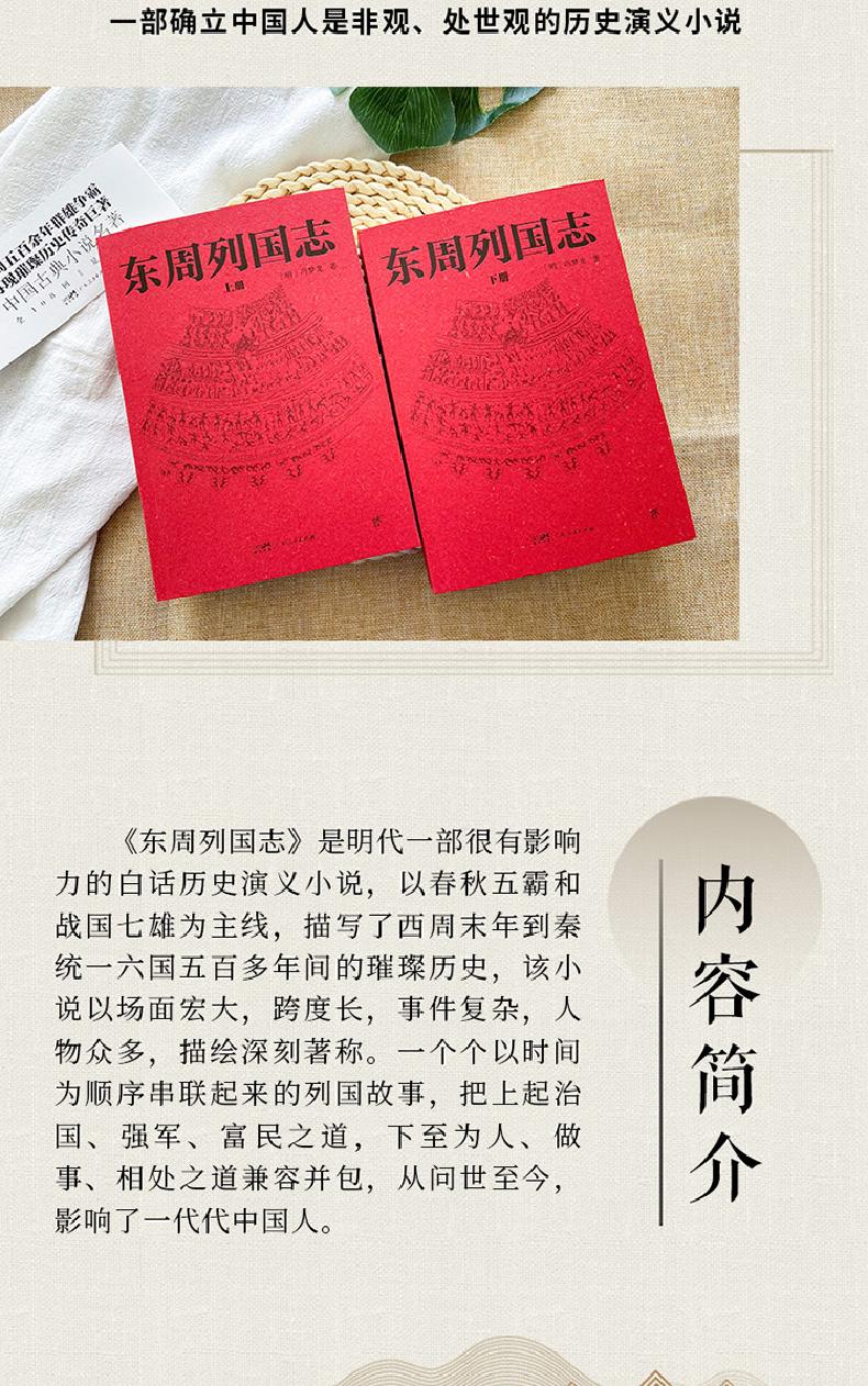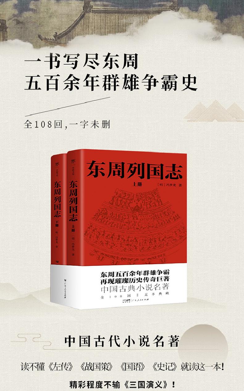 《东周列国志》是明代一部很有影响力的白话历史演义小说,以春秋五霸和战国七雄为主线,描写了西周末年到秦统一六国五百多年间的璀璨历史,该小说以场面宏大,跨度长,事件复杂,人物众多,描绘深刻著称。一个个以时间为顺序串联起来的列国故事,把上起治国、强军、富民之道,下至为人、做事、相处之道兼容并包,从问世至今,影响了一代代中国人。