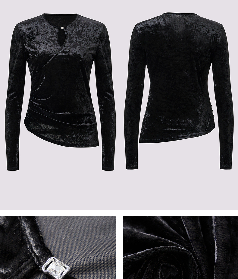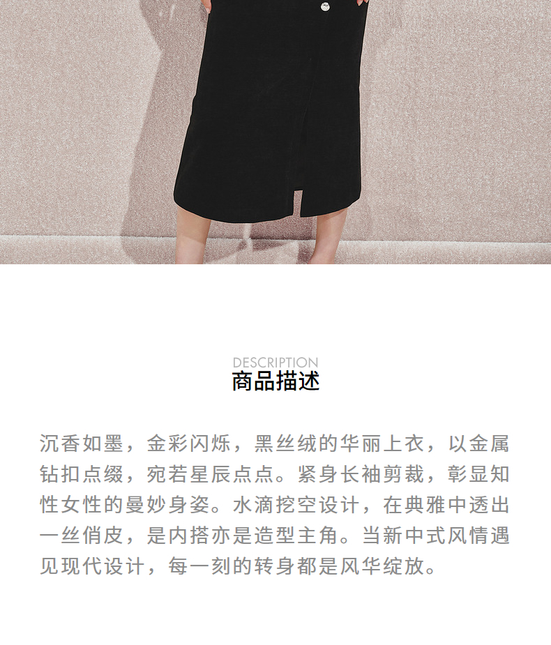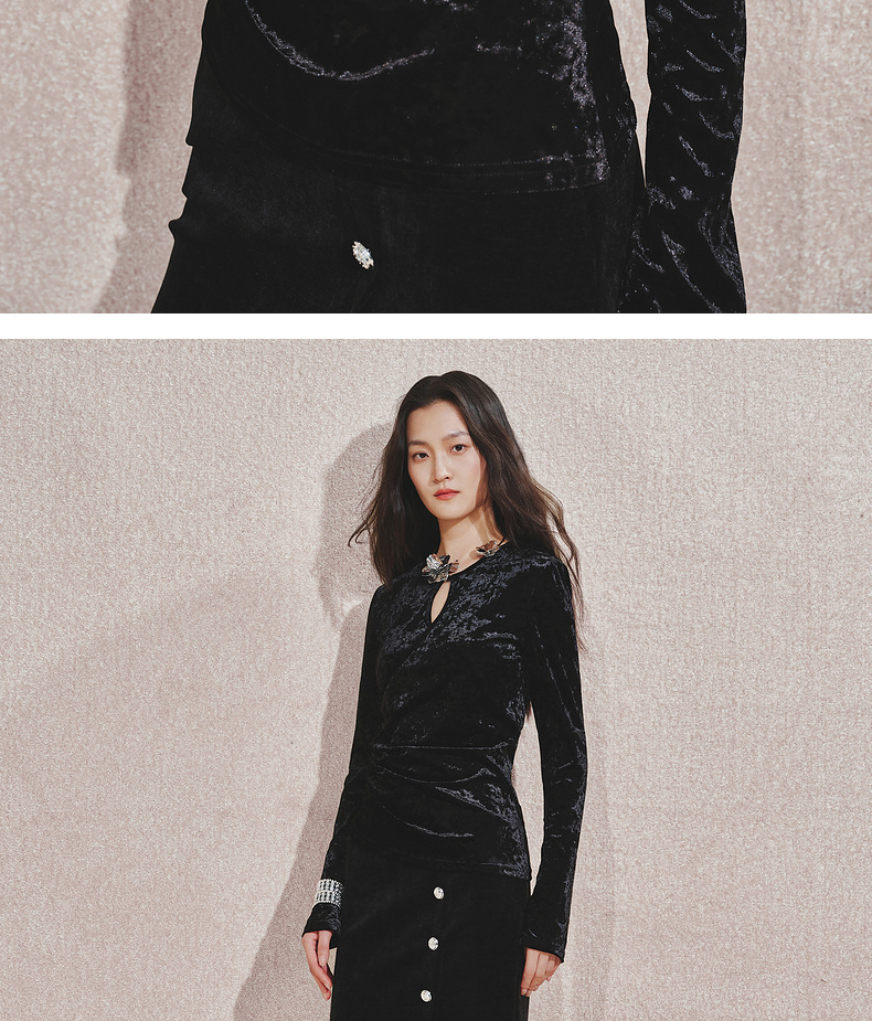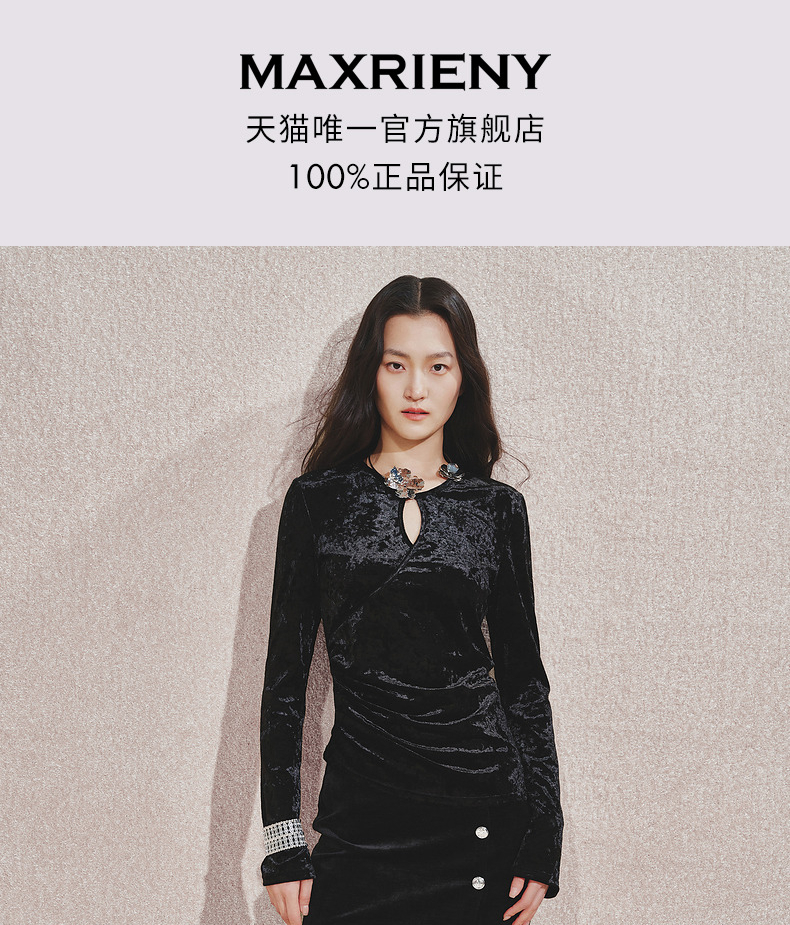 玛克门店发货:MAXRIENY金属钻扣黑丝绒上衣女24秋新款(货号:MC85TP544)