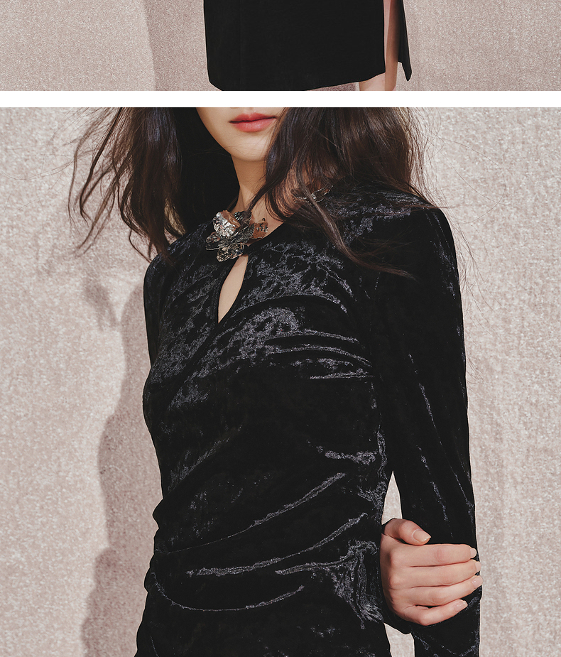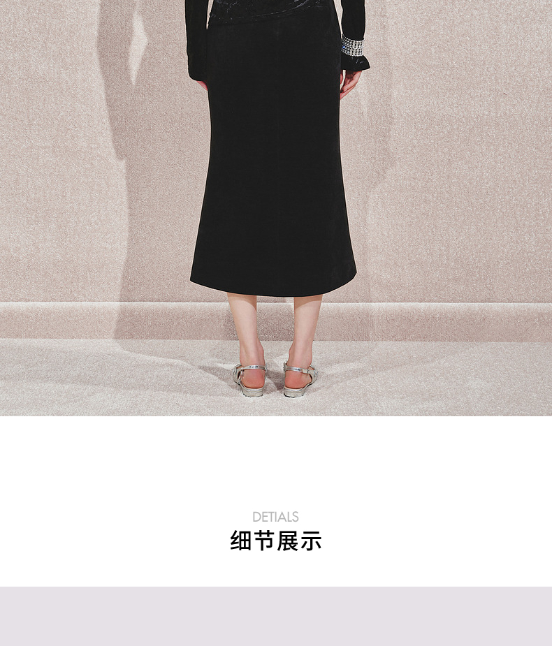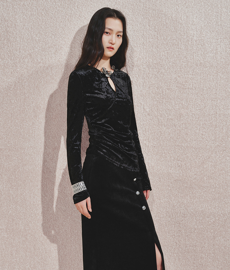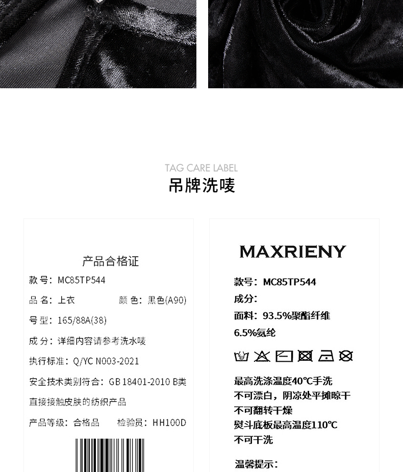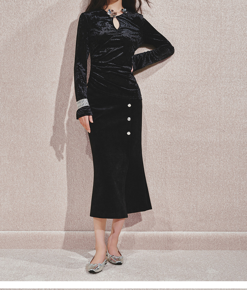 玛克门店发货:MAXRIENY金属钻扣黑丝绒上衣女24秋新款(货号:MC85TP544)