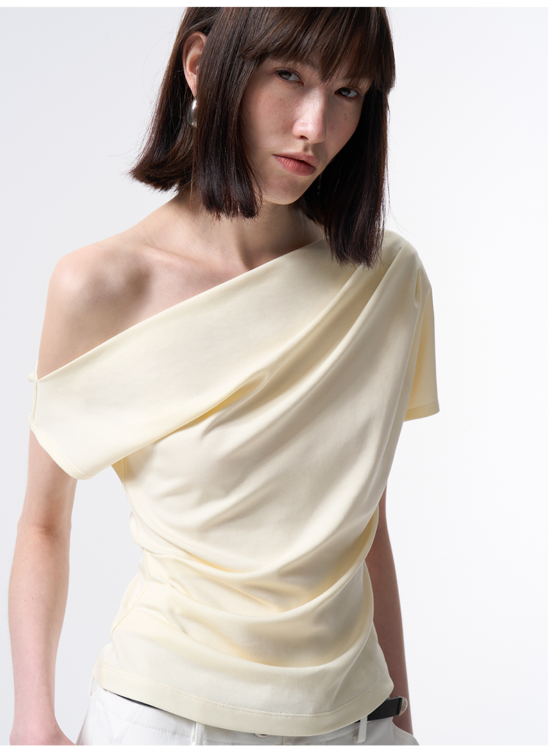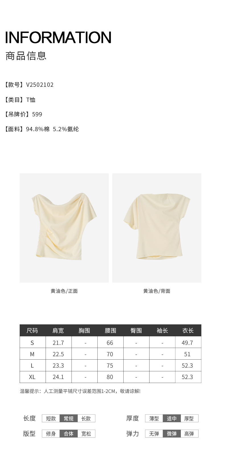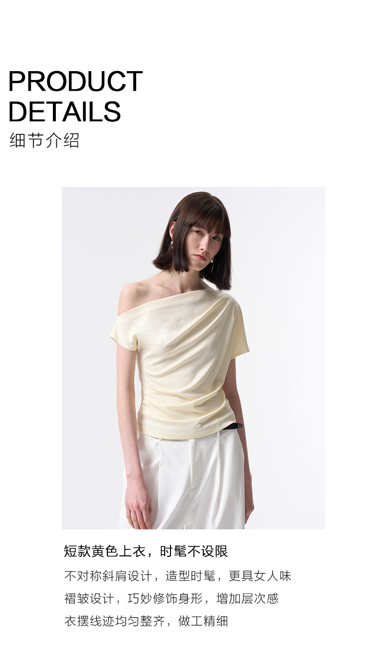 VIMAGE纬漫纪设计感斜肩修身显瘦黄色短袖T恤上衣2026夏季新款V2502102