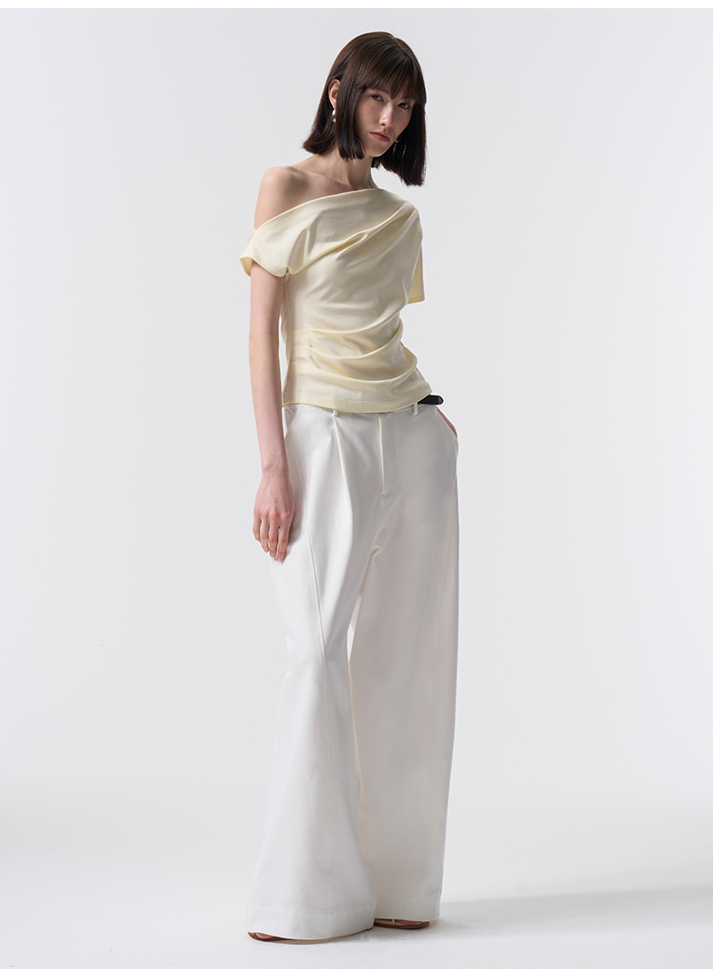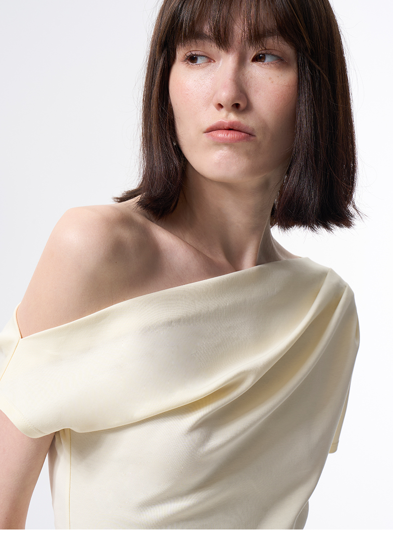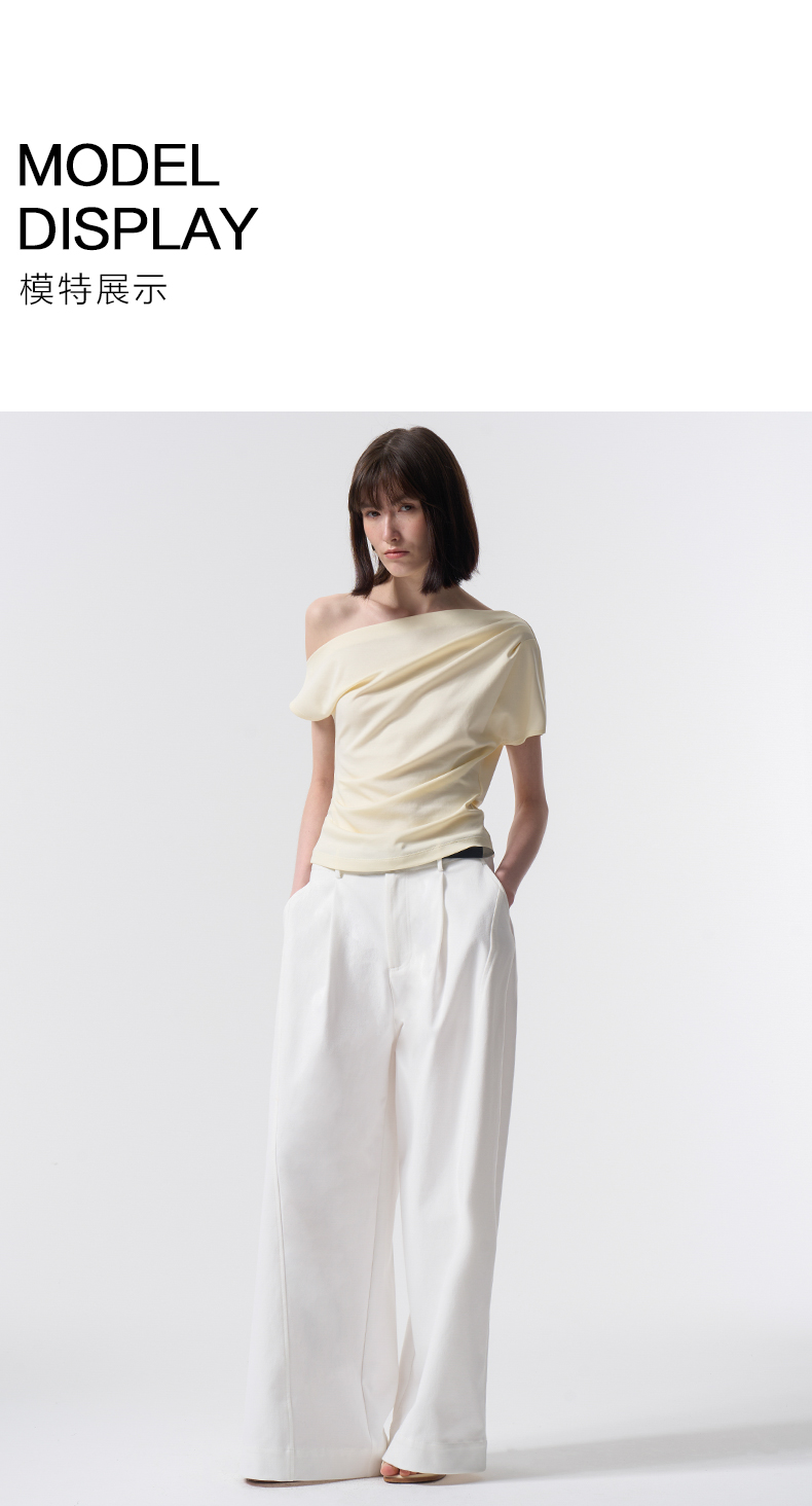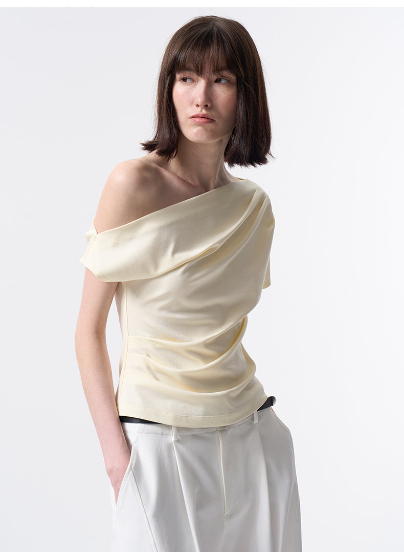 VIMAGE纬漫纪设计感斜肩修身显瘦黄色短袖T恤上衣2026夏季新款V2502102