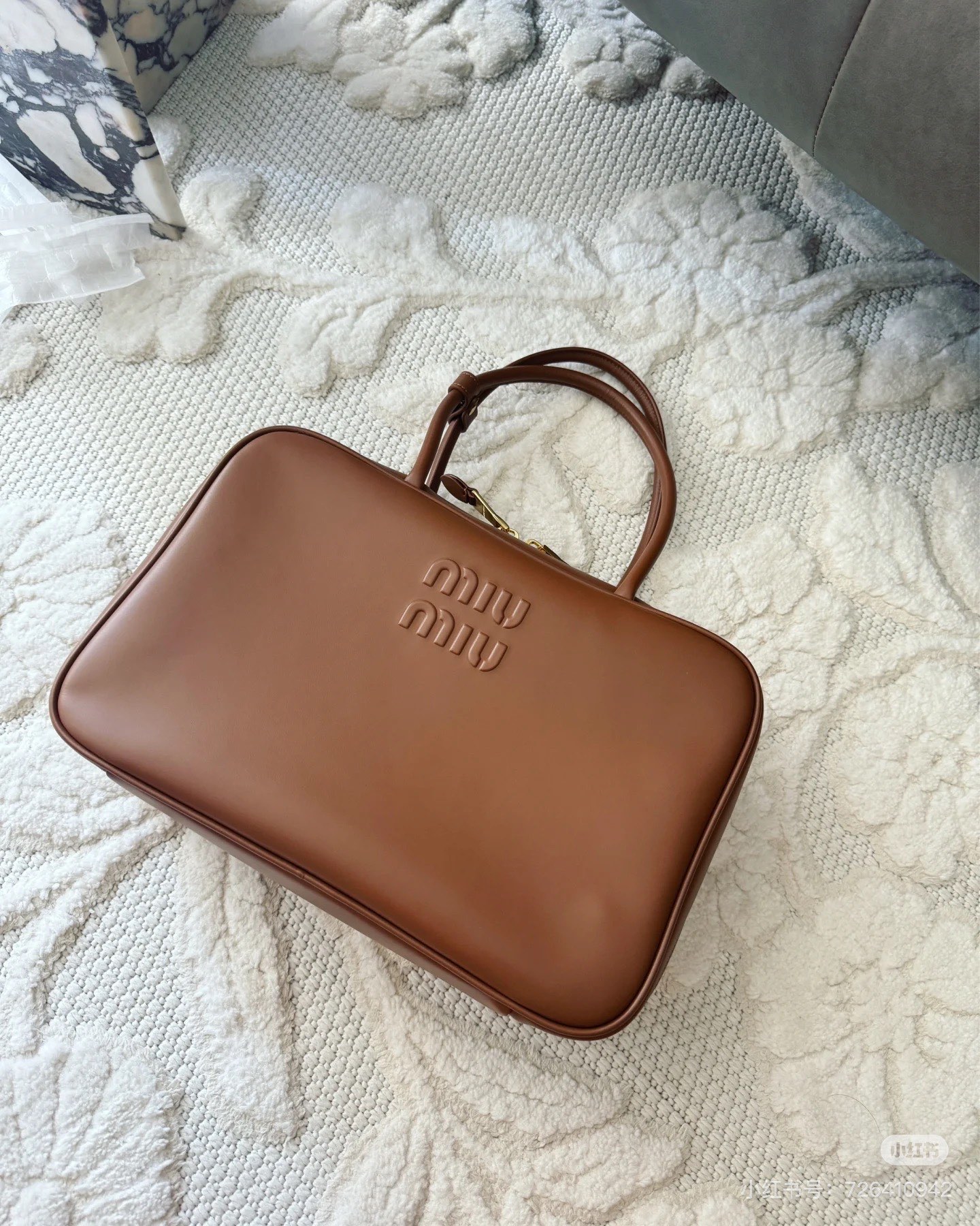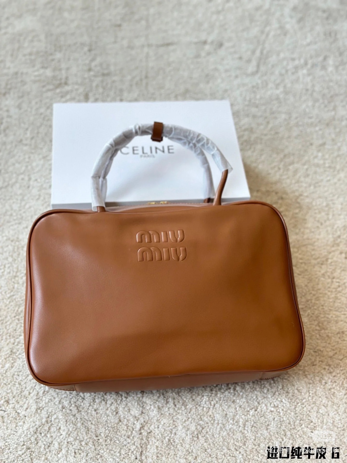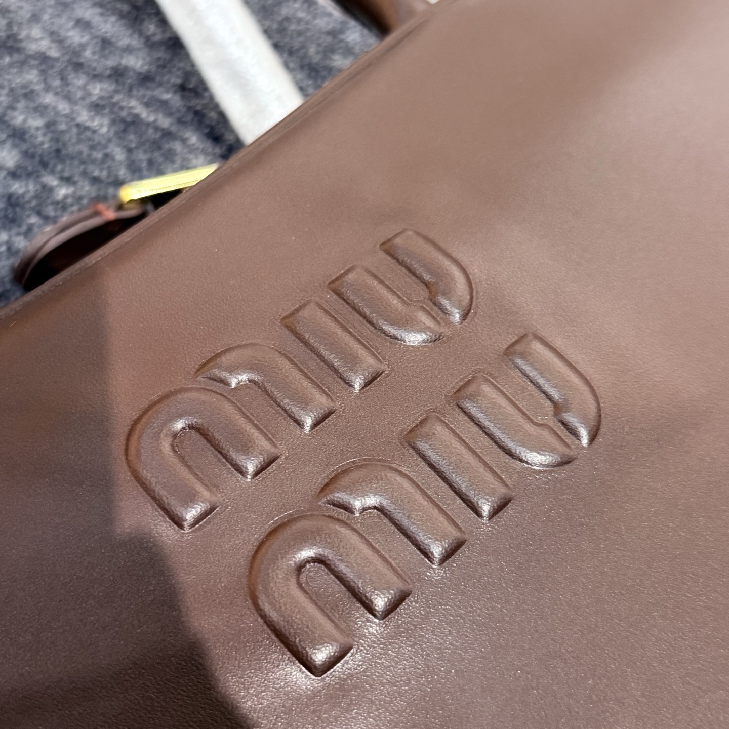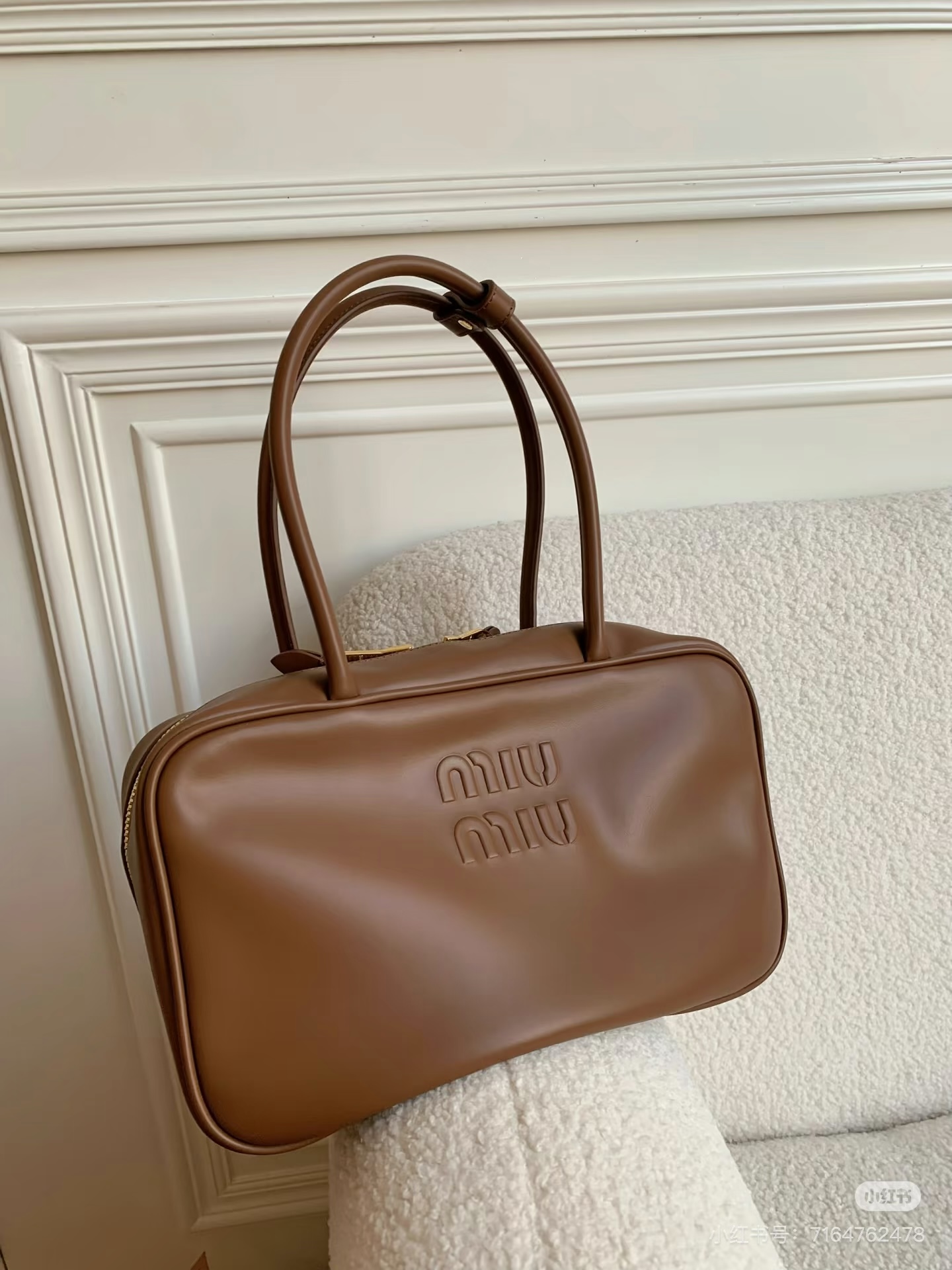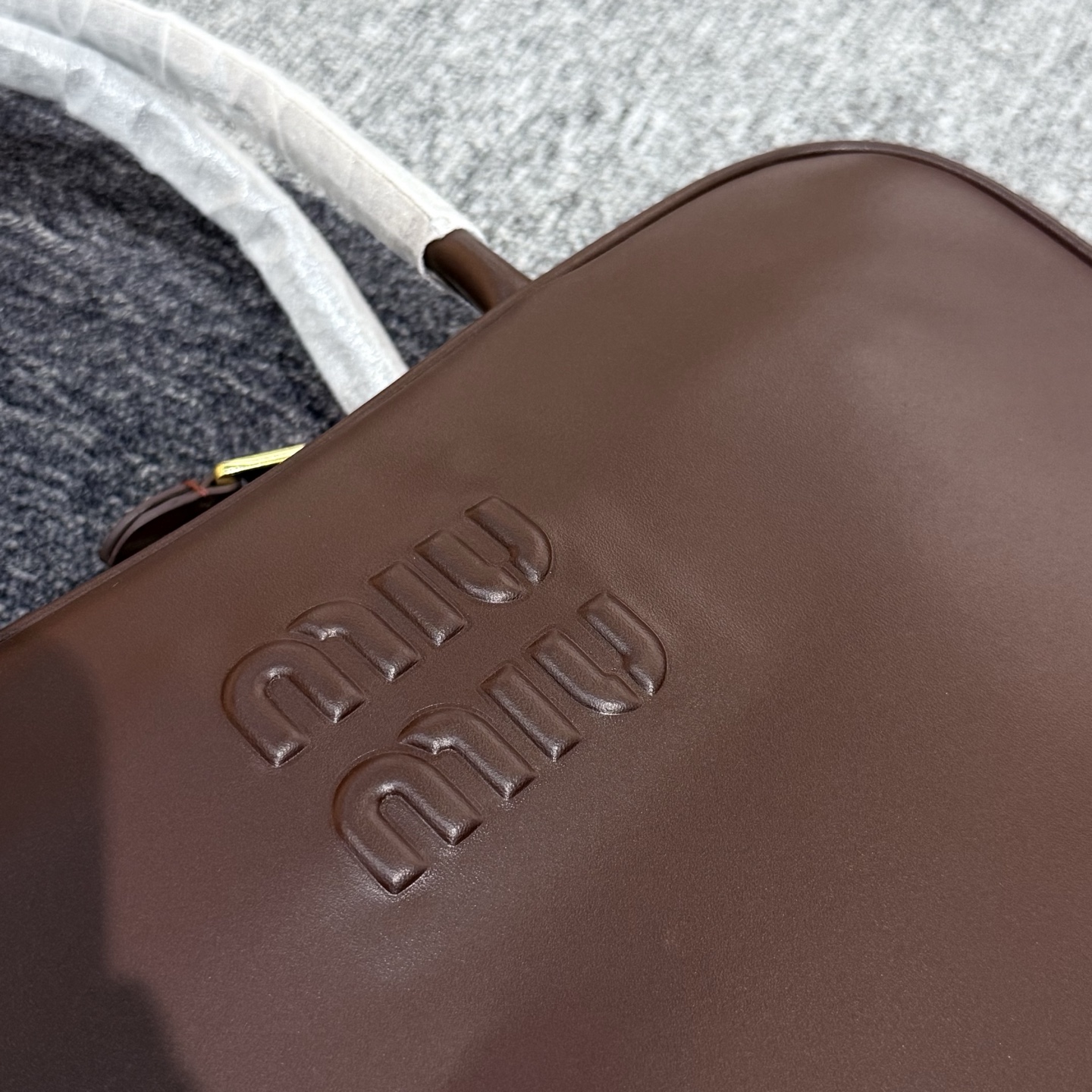 孤品微瑕心态‼️ 海扣正品品质⚠️ ! 石南木色镀金色保龄球包手提包 爱称她为保龄球包!MIUMIU新款手提包! 浮雕徽标.摸起来非常的柔软细腻.软软糯糯.