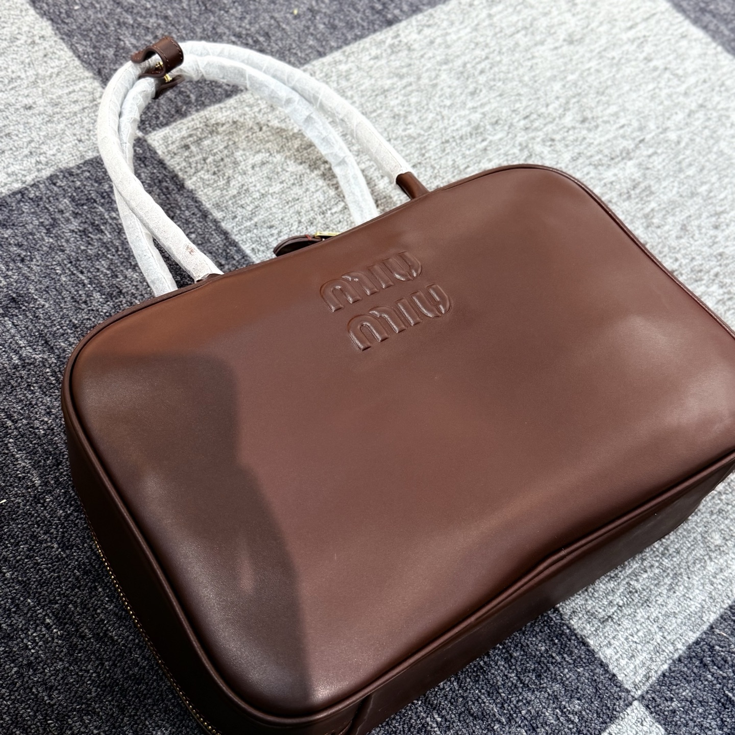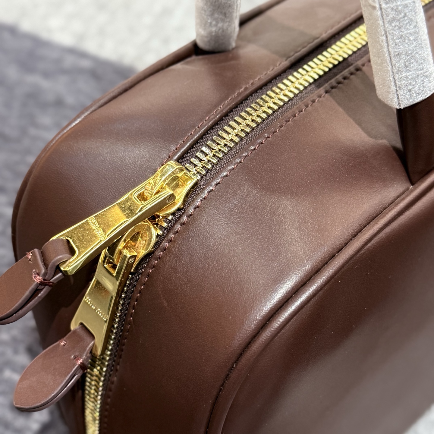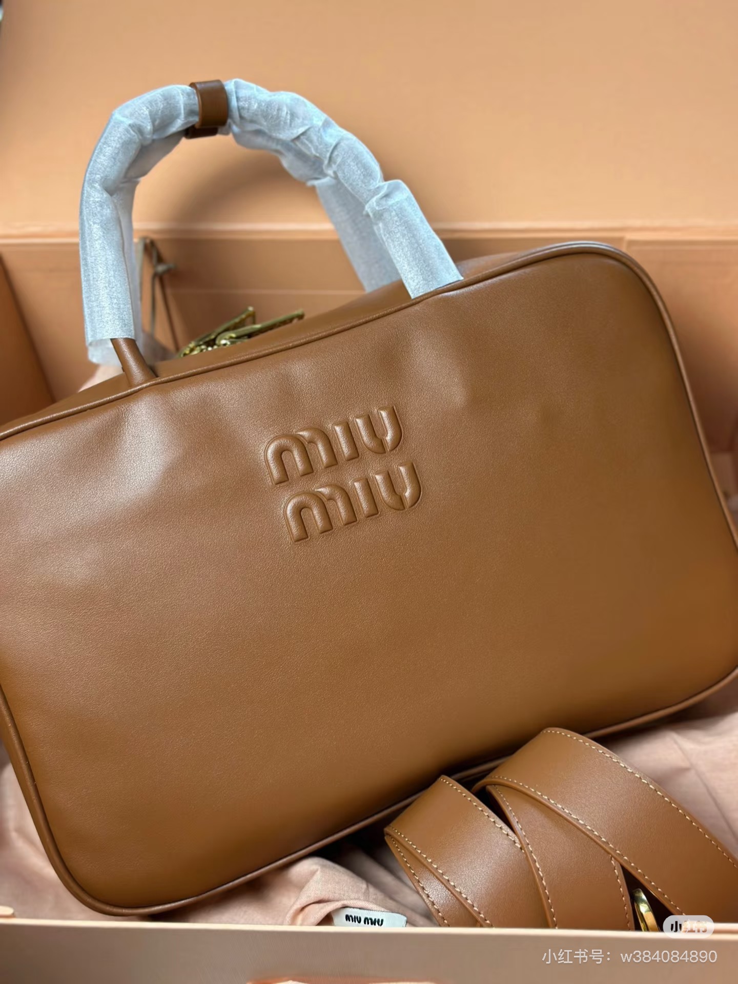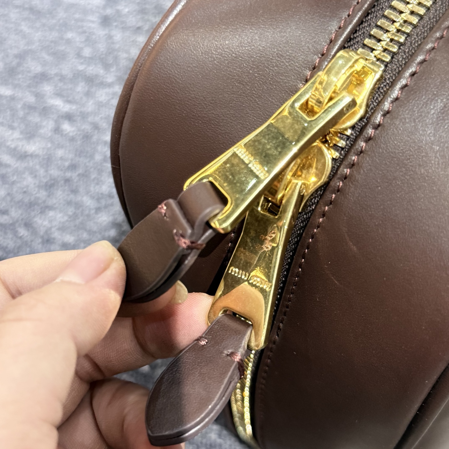 孤品微瑕心态‼️ 海扣正品品质⚠️ ! 石南木色镀金色保龄球包手提包 爱称她为保龄球包!MIUMIU新款手提包! 浮雕徽标.摸起来非常的柔软细腻.软软糯糯.