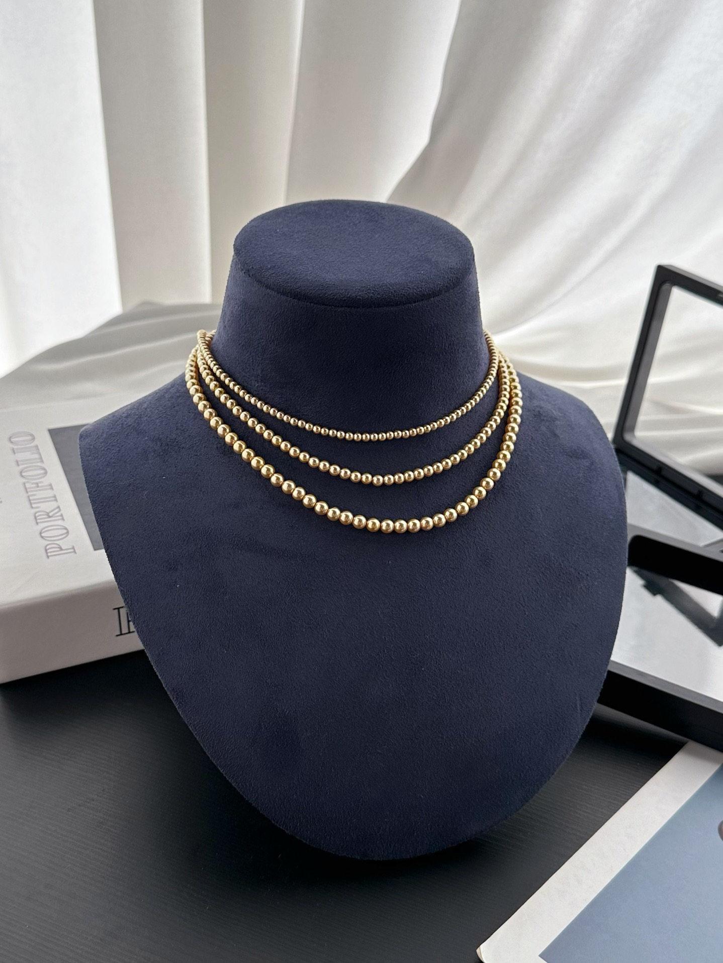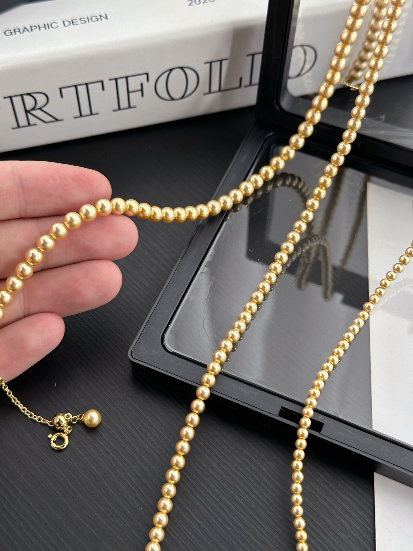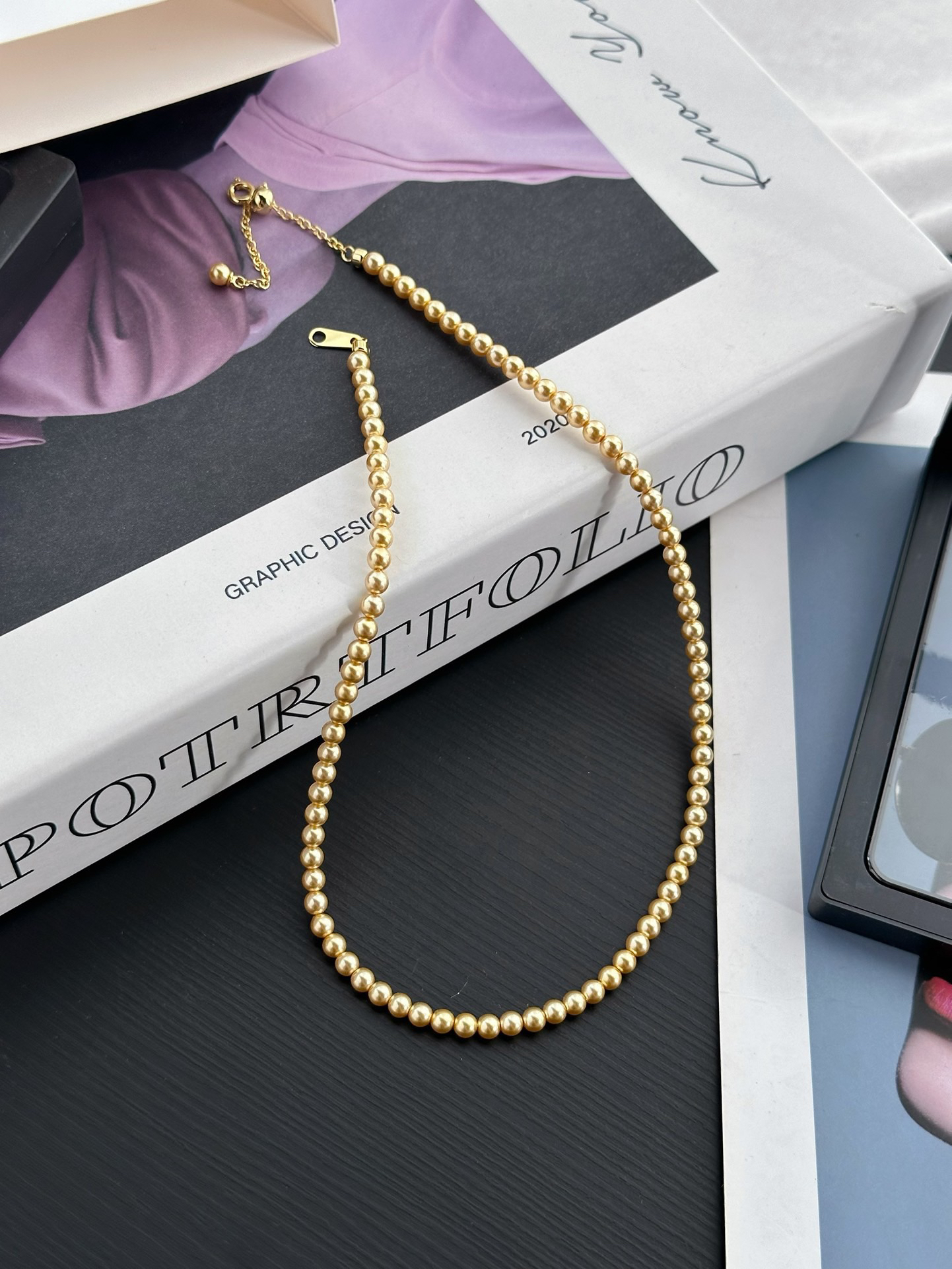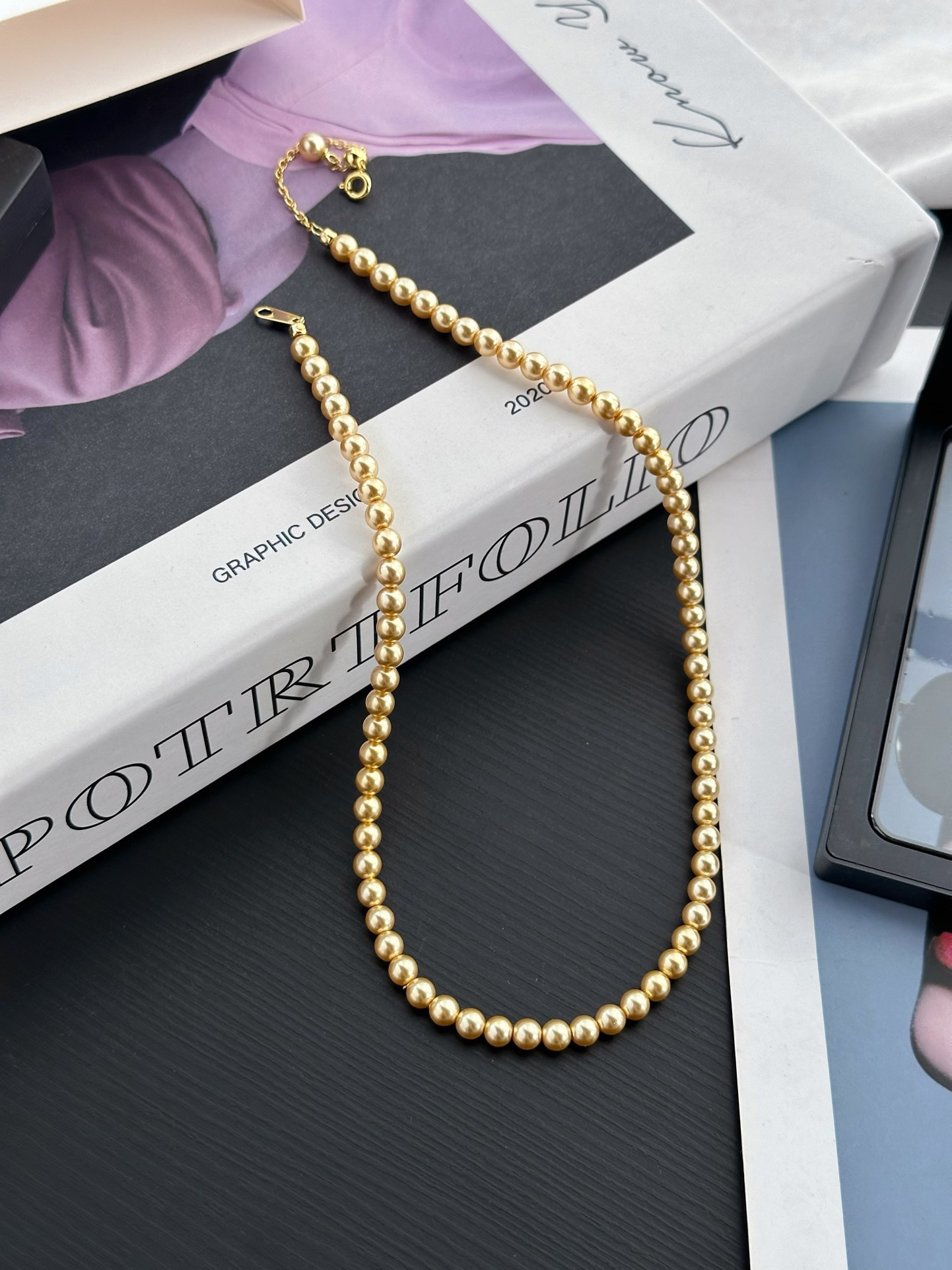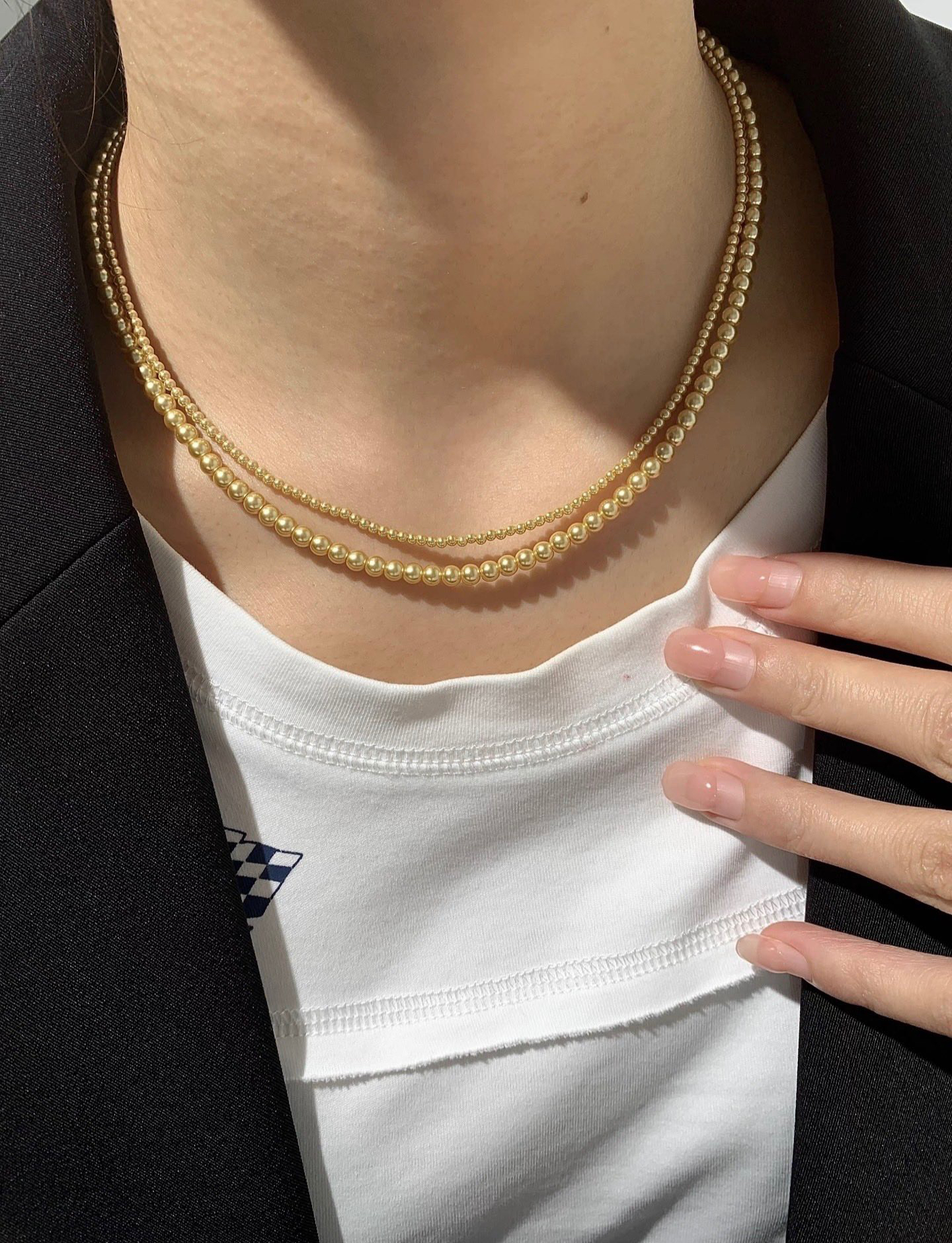 跟我们的三种尺寸的白色珍珠项链是一个工厂的,颜色不同其他都一样哈‼️珍珠又一爆款色浅金色,每次出门戴着就被问炸的款,夏天跟秋冬搭配衣服都绝绝子啊~
