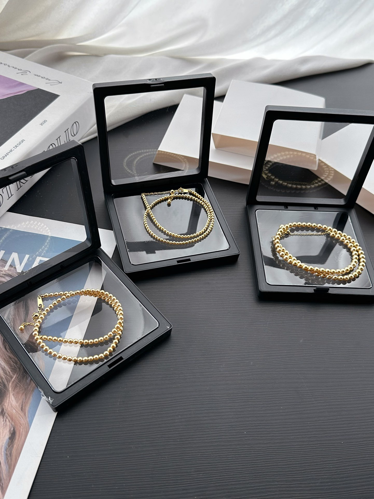我们有3种珍珠尺寸选择,分别是3/4/5mm,施家水晶珍珠➕铜镀18K真金材质,珠子的大小和形状也很平衡,颜色非常均匀统一,买过白色款的都知道我们的品质和性价比!