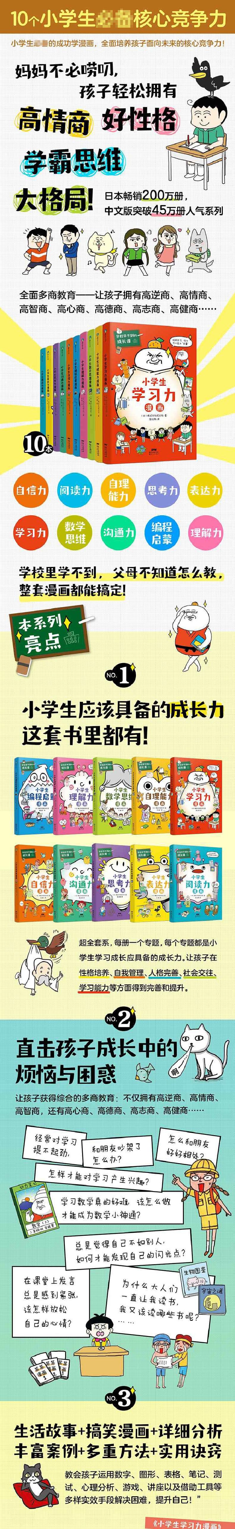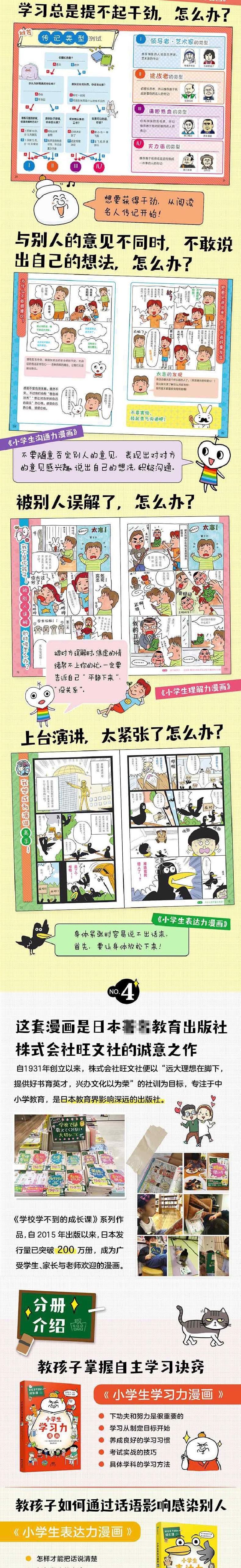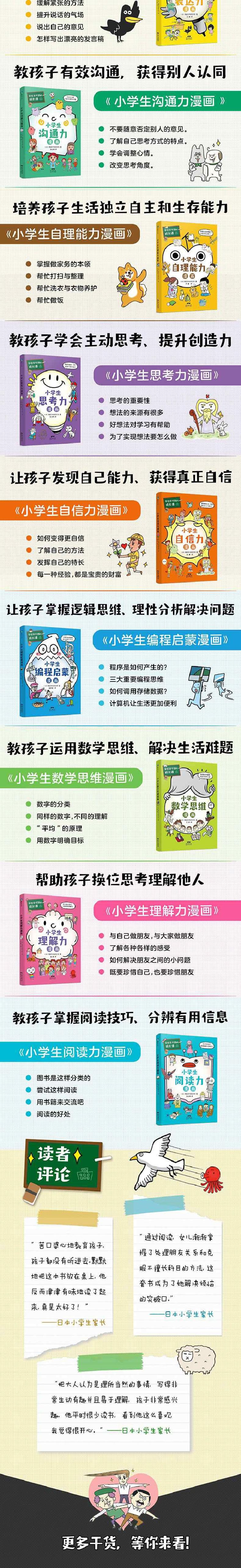 《学校学不到的成长课:共情力篇》共含5册,分别为:《小学生沟通力漫画》《小学生自理能力漫画》《小学生表达力漫画》《小学生自信力漫画》《小学生理解力漫画》。每册内容以有趣可爱的人物+幽默搞笑故事引出主题,以提出问题——分析问题——给出解决方法的内容展开,循序渐进,孩子在生活中遇到的问题都能从中找到答案。确保孩子不仅享受轻松阅读,更能get成才密码。