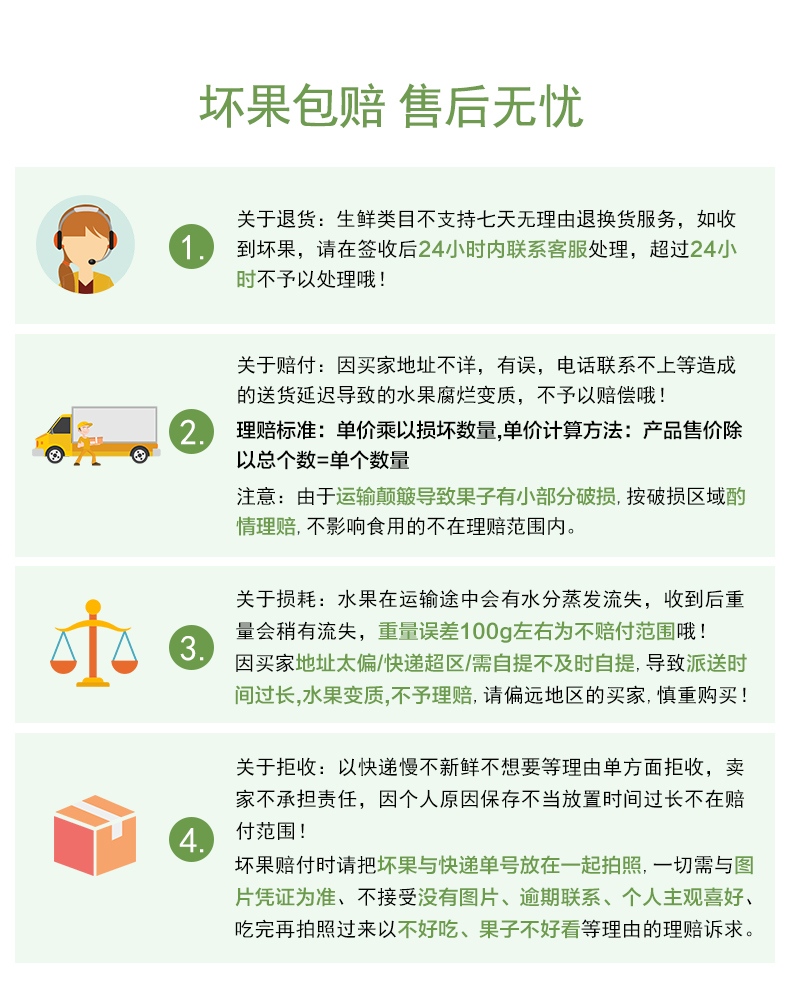 2.如收到坏果,请在收到货24小时内,将坏果和快递单一起拍照,需清晰,缺一不可,否则不可理赔哦。