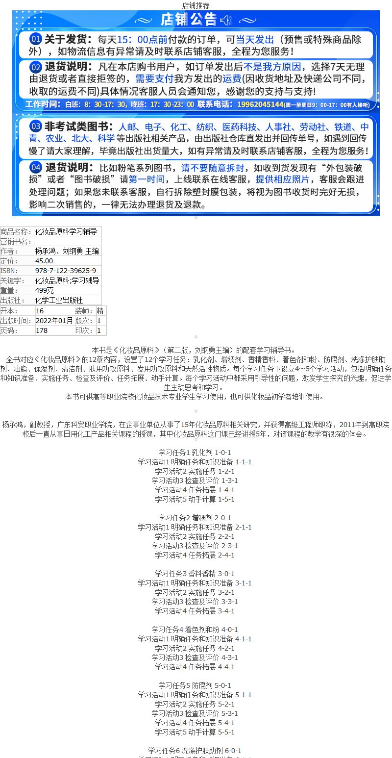 化妆品原料学习辅导 杨承鸿 化妆品原料 第二版 配套学习辅导书 高等职业院校化妆品技术专业学生应用教材 化妆品初学者学习书籍 无 化学工业出版社 9787122396259