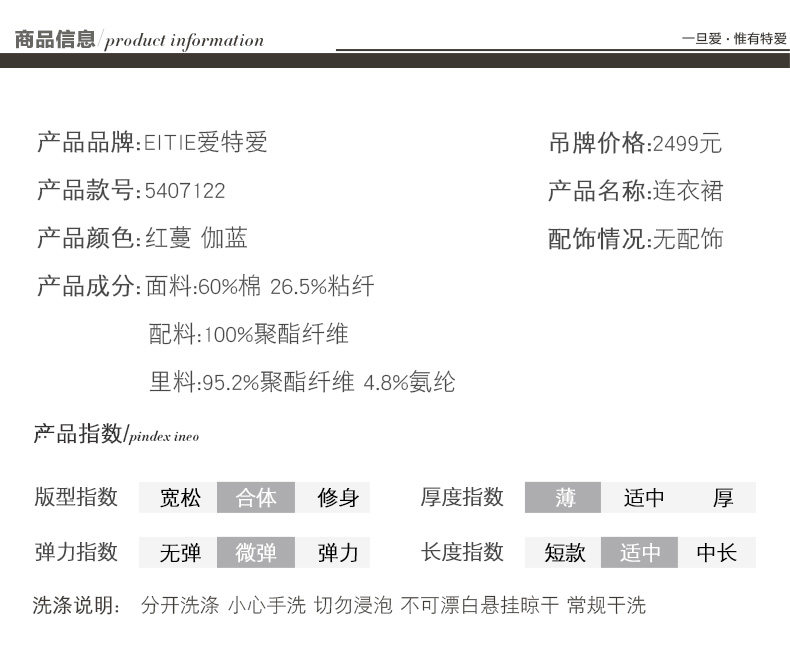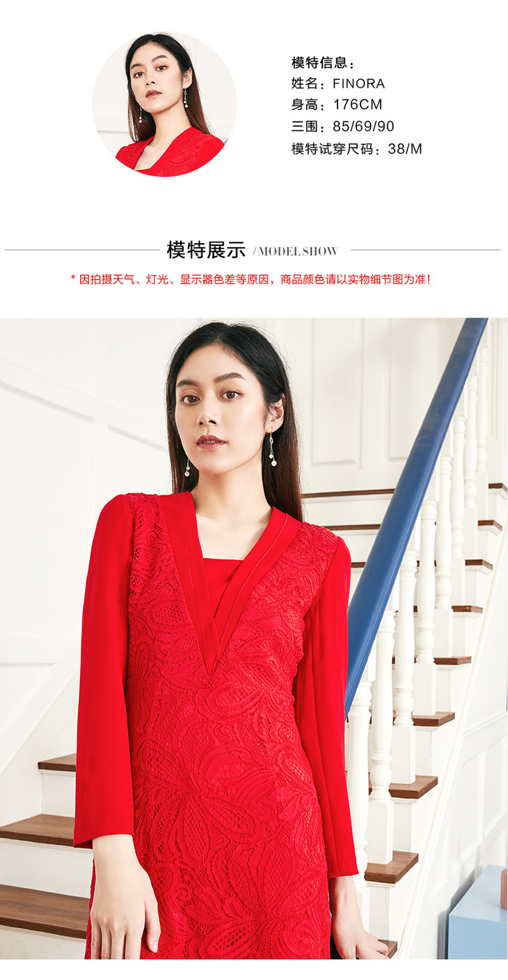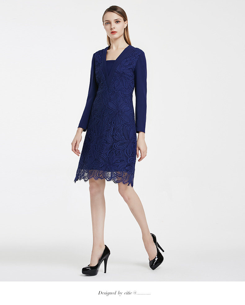 EITIE爱特爱秋季连衣裙女优雅V领蕾丝钩花中长款女士裙子5407122