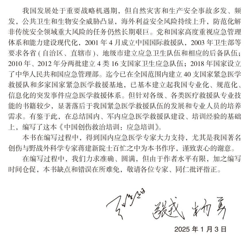 本书作为中国创伤救治培训的系列专著,可供从事创伤救治、紧急医学救援的医护人员借鉴参考。希望该书的出版对于我国各地各类应急医学救援队建设和应急医学救援能力提高起到积极作用。