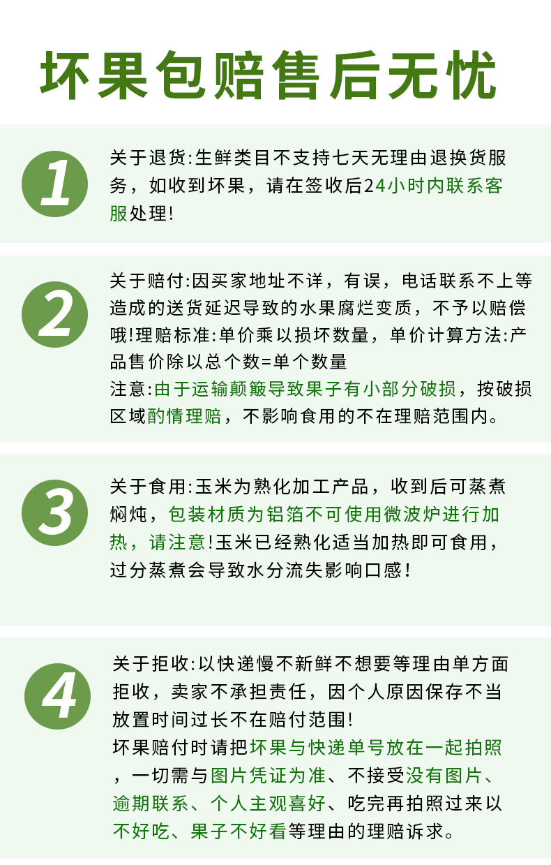 ③不支持七天无理由退货;因玉米本身属于生鲜产品,加之是批次成熟批次新鲜采摘生产发货。非质量问题或物流问题不予售后。介意者勿拍!