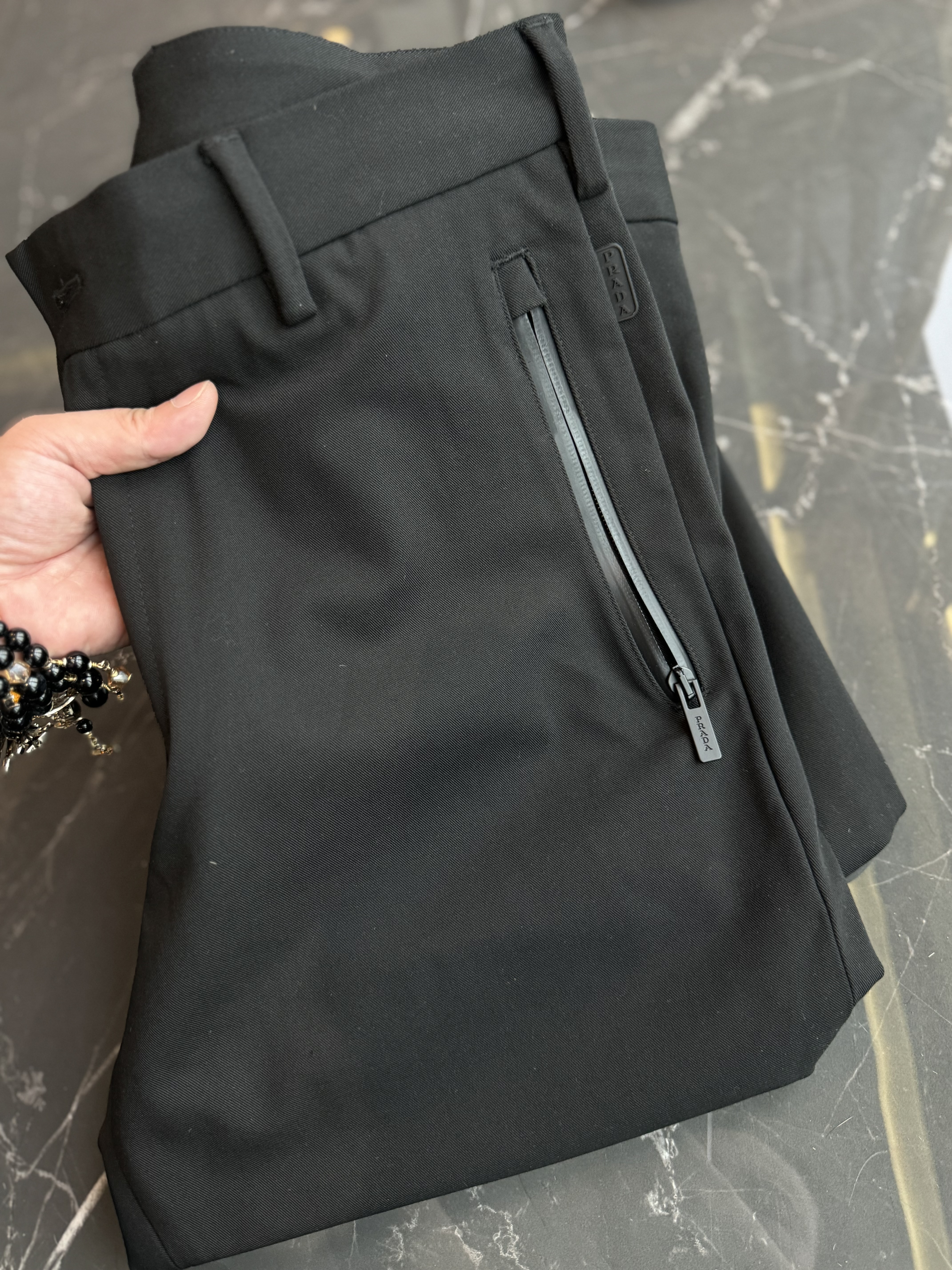经典斜插口袋款式,小直筒版型,普家logo胶质标点缀,原装五金细节, YKK拉链设计 +内里包边。时尚男士衣橱必备单品!不挑身材不挑年龄,任何男士都能穿出时尚感!客供定制原厂高端棉混纺的面料 ,横向有弹力,蹲起很舒服!