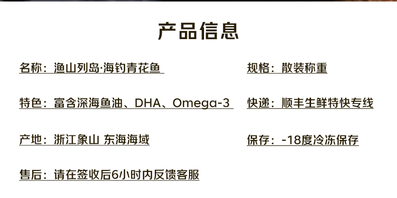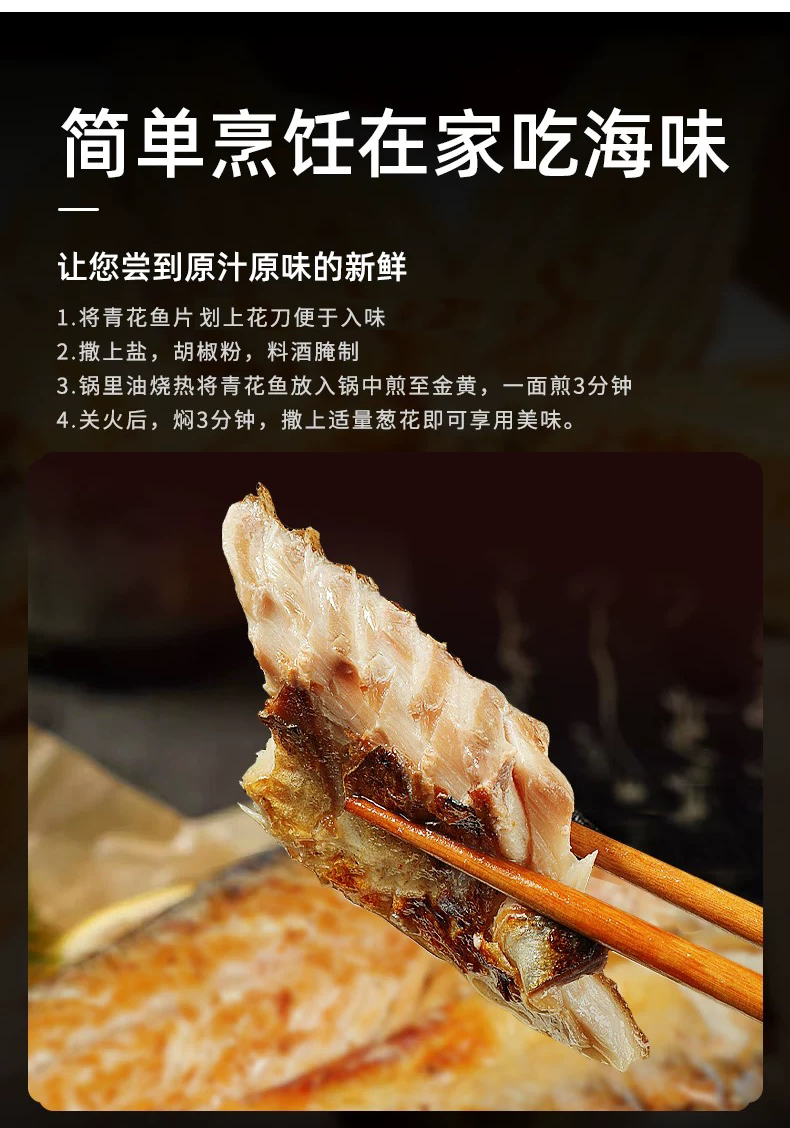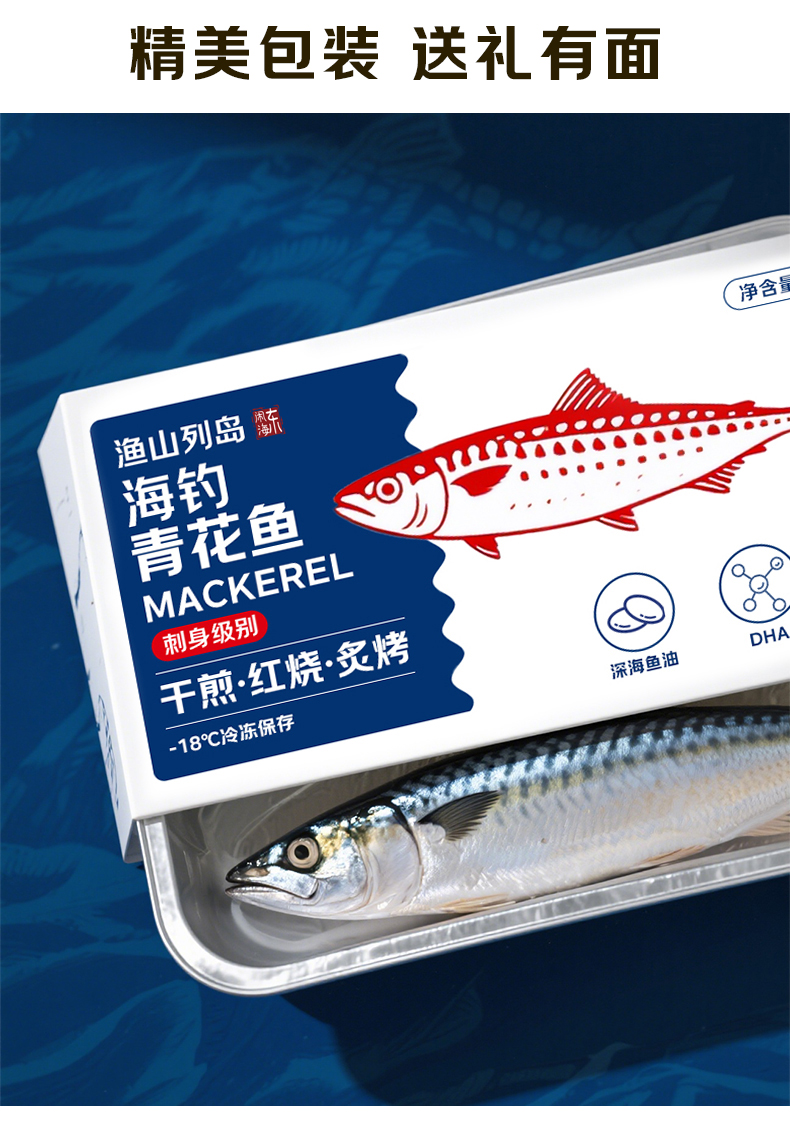 ·刺身级别,干煎红烧炙烤都很好吃·富含深海鱼油、DHA、Omega-3,适合孩子补充营养 ·高考中考季,青花鱼有“青”云直上之美意·包装精美,送亲友也很赞