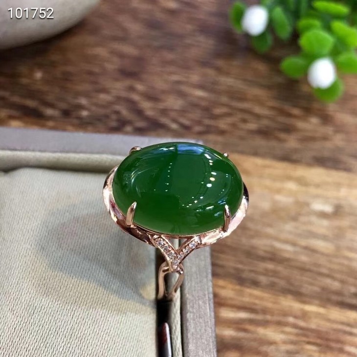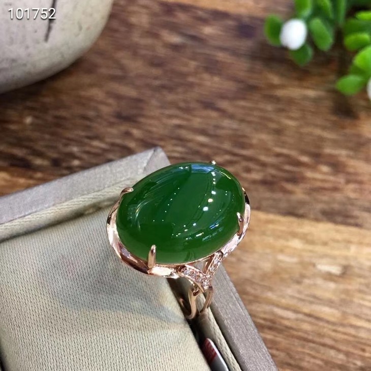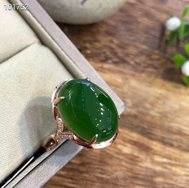 18k玫瑰金镶和田玉碧玉女士戒指,老料菠菜绿,干净细腻,裸石规格:12×16mm,镶嵌钻石,指圈号大小可以改,送精美包装。