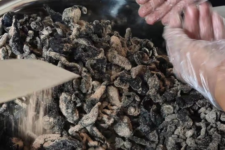 6月份小满节气及9月份白露节气,启动蒸制程序,九次蒸九次晒。在第八次蒸晒后加辅料野生阳春砂仁、生态黄酒后,捣碎、搅拌均匀、团球后蒸第九次,切片晒第九次。每次蒸制持续近一个月为“熟地”。
