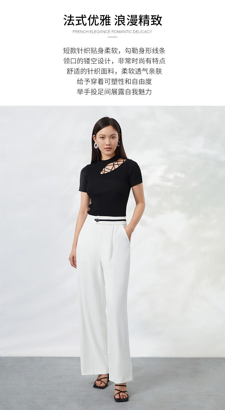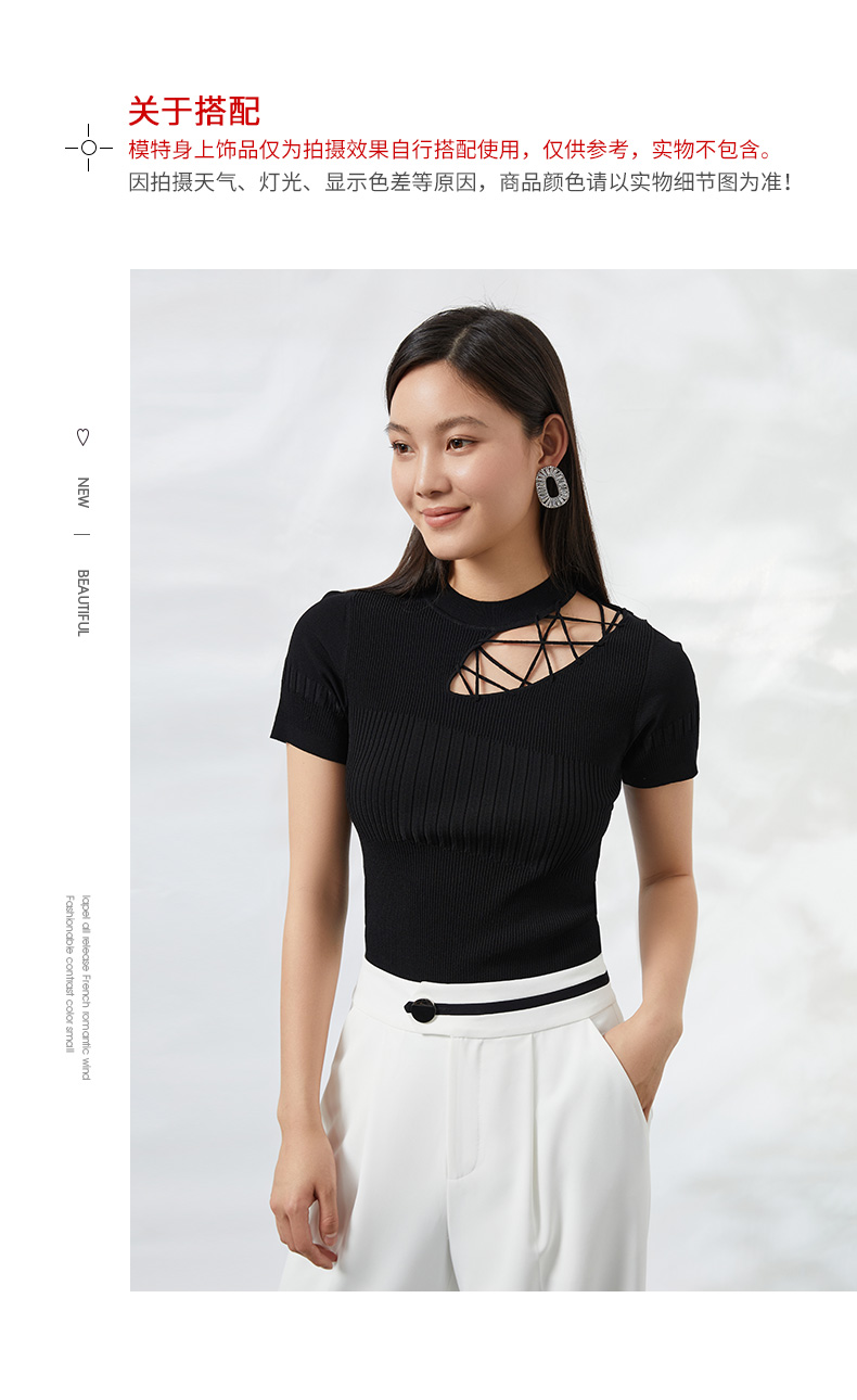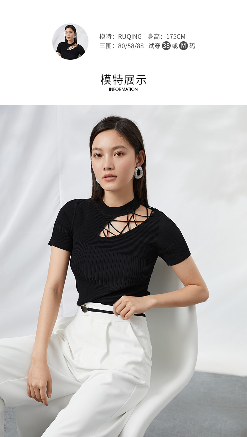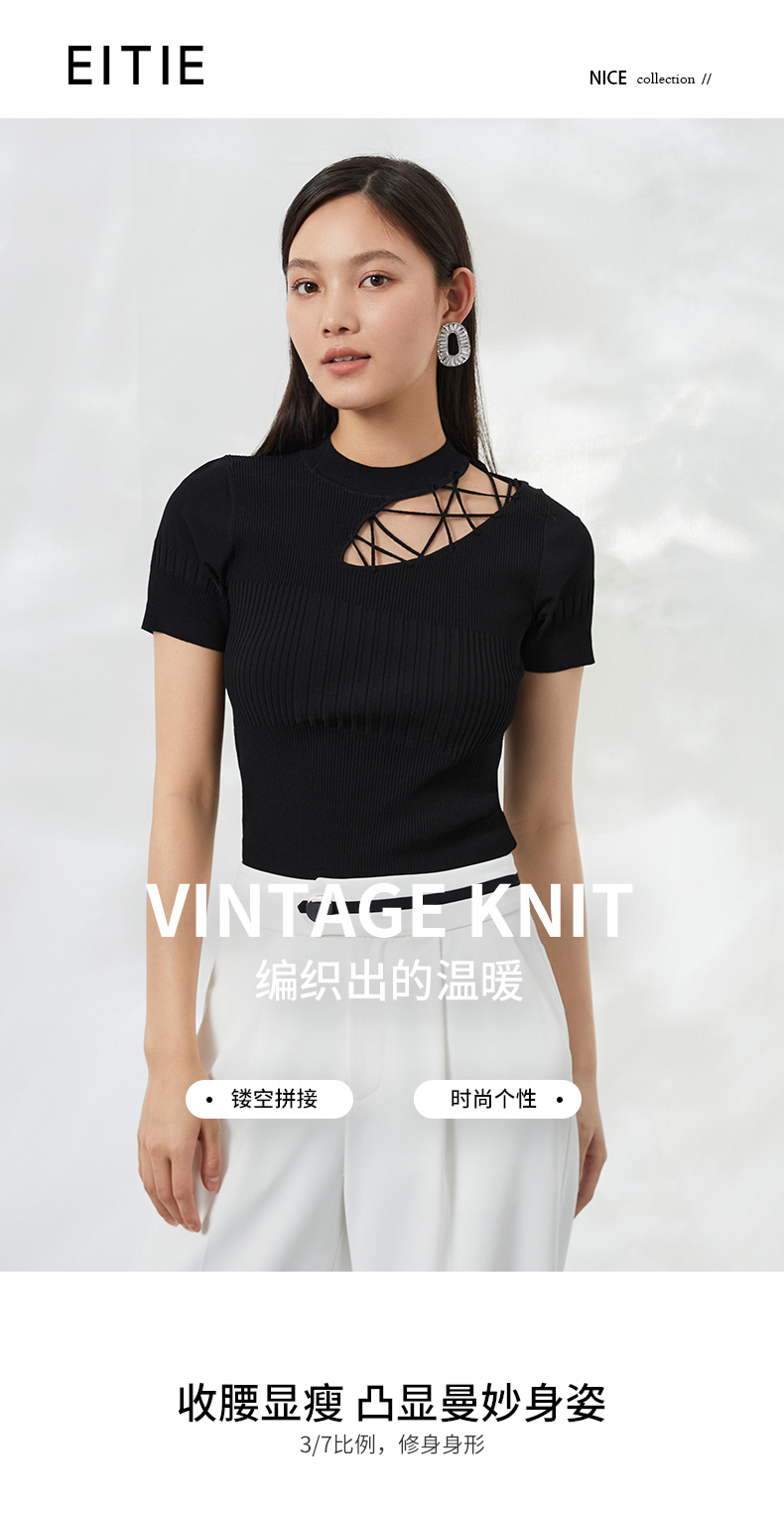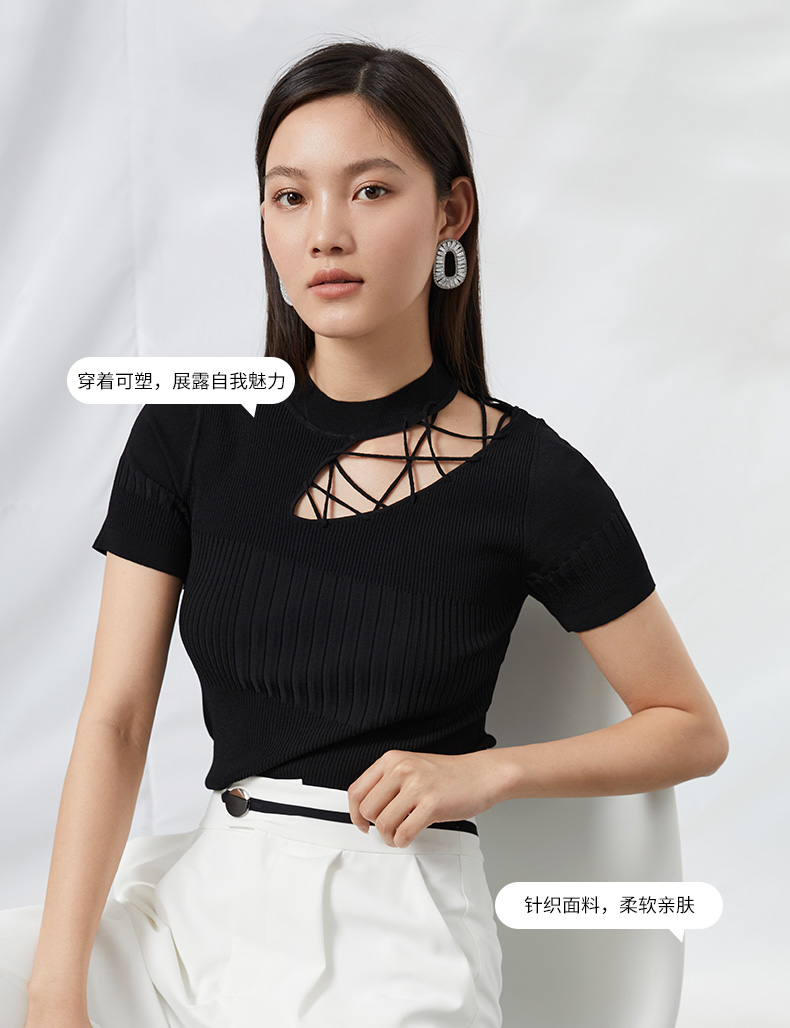 EITIE爱特爱夏季新款时尚显瘦绑带设计镂空针织T恤黑色上衣B2201906