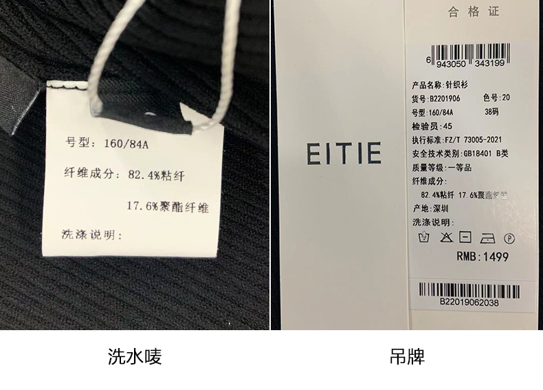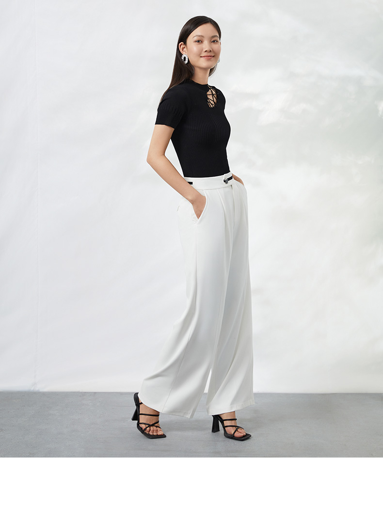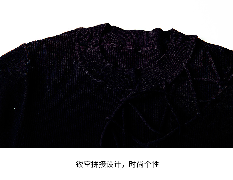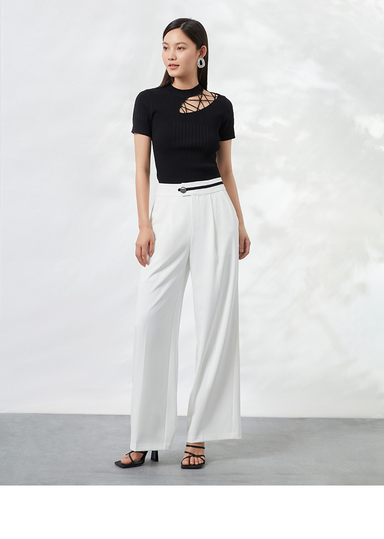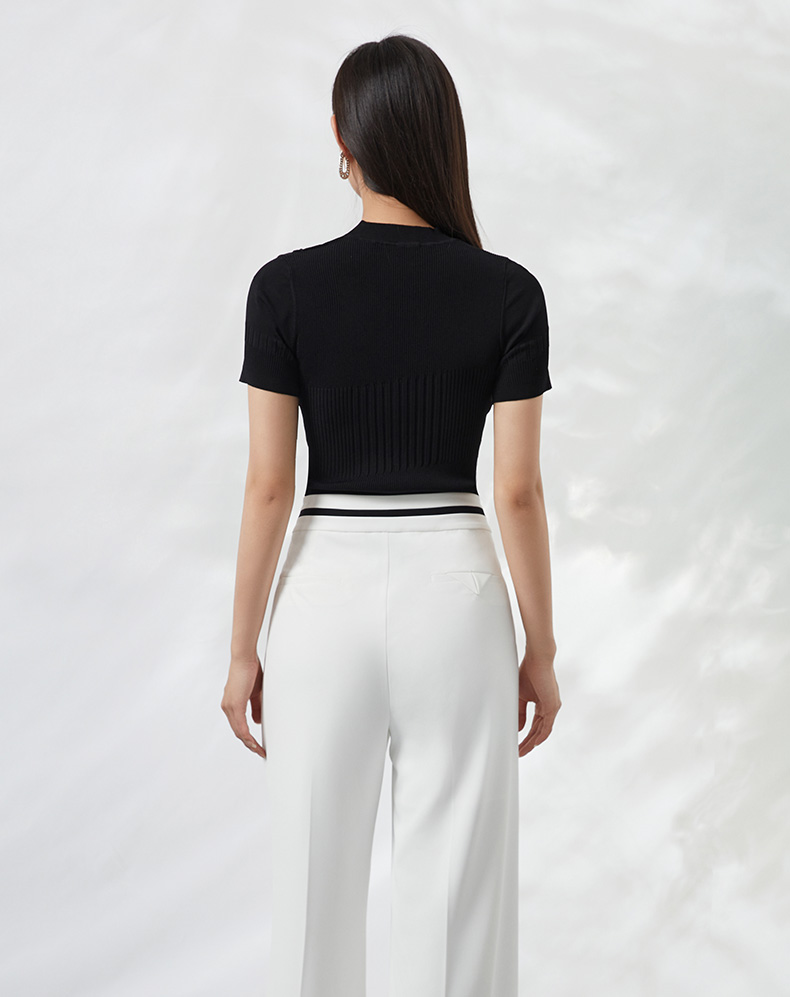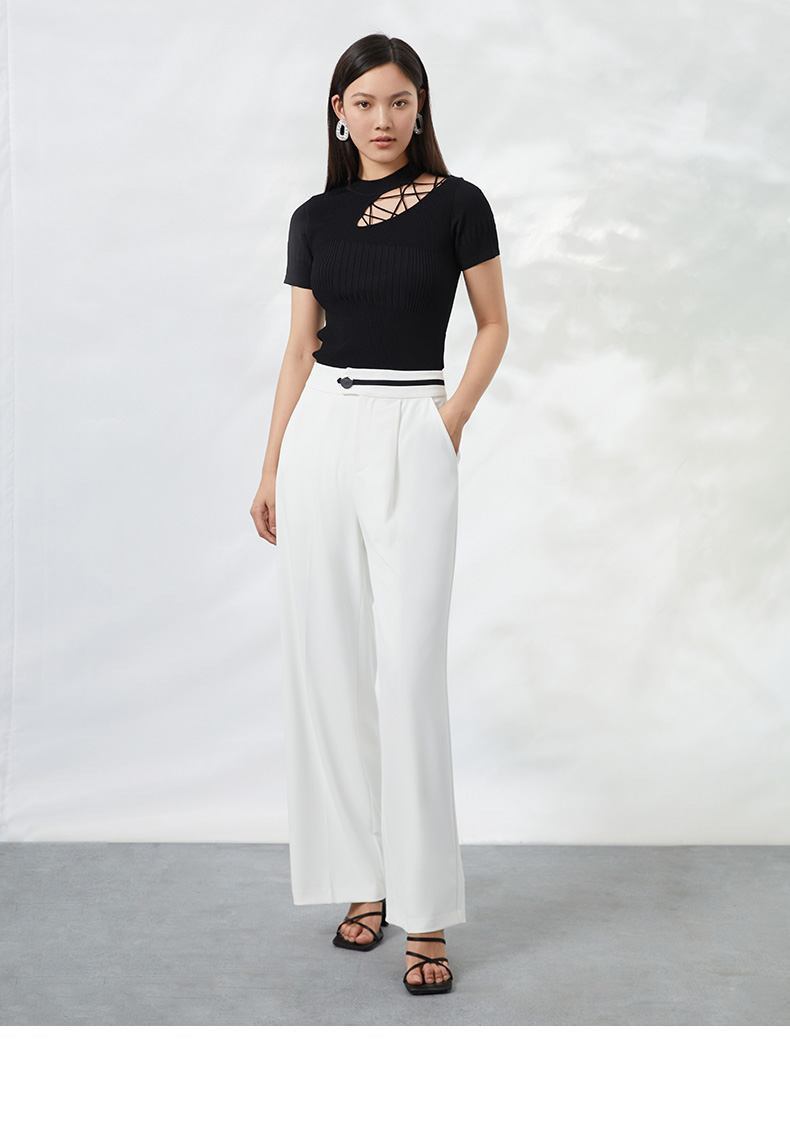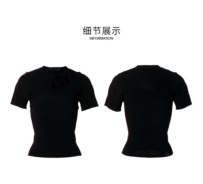 EITIE爱特爱夏季新款时尚显瘦绑带设计镂空针织T恤黑色上衣B2201906