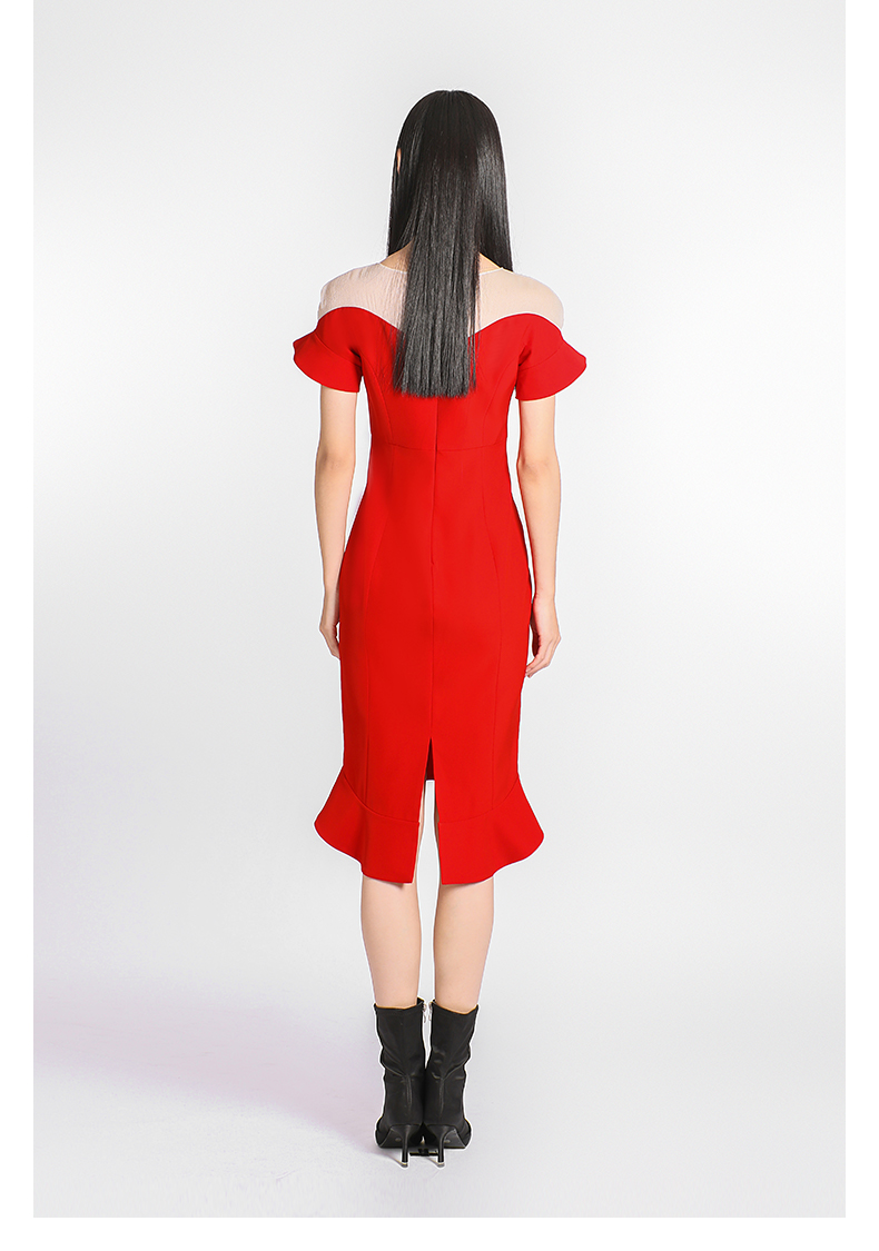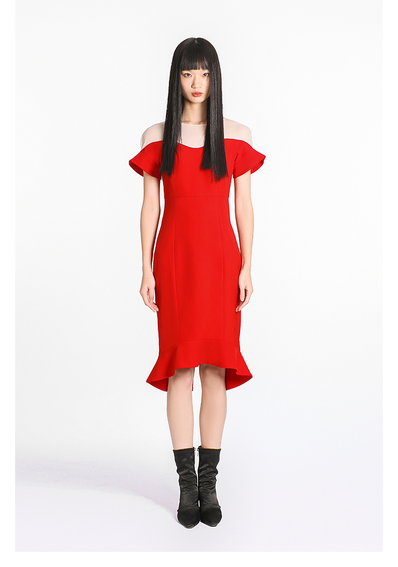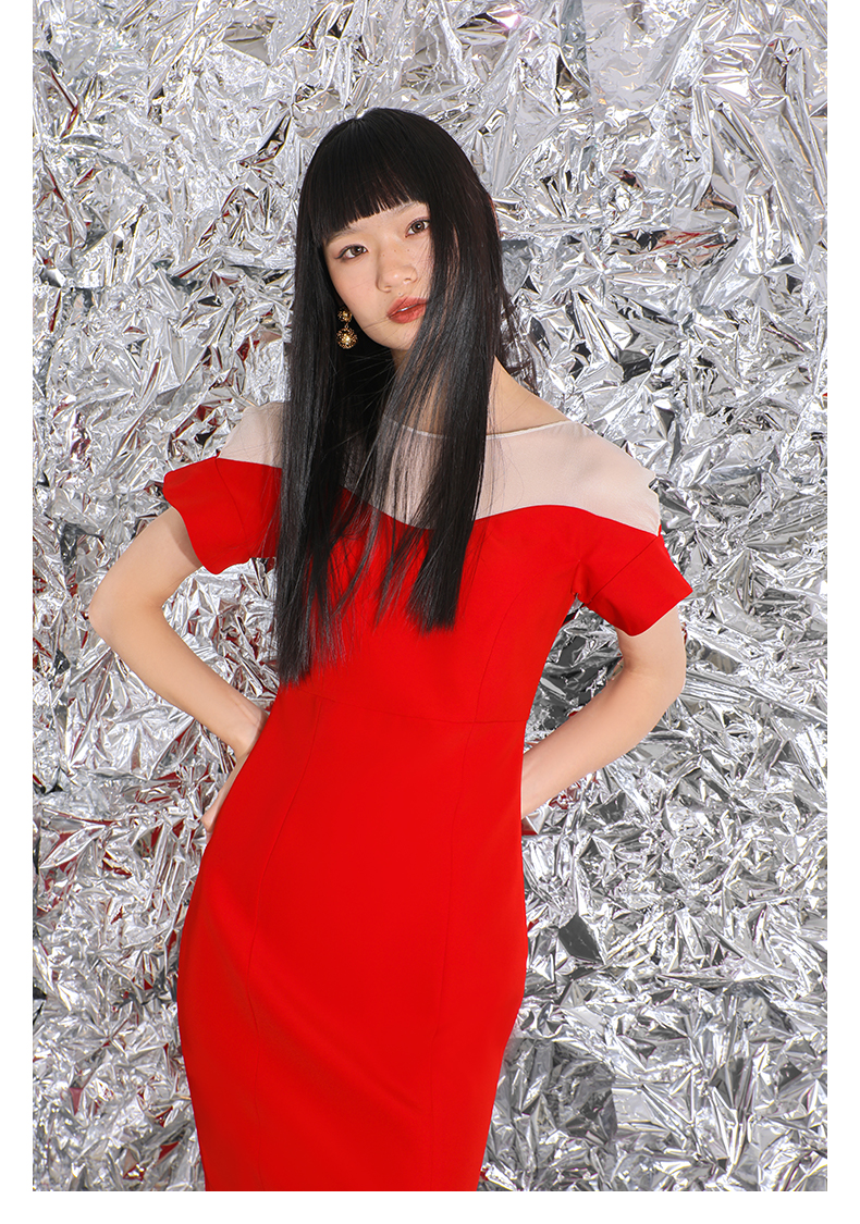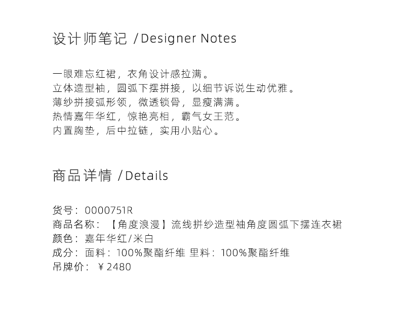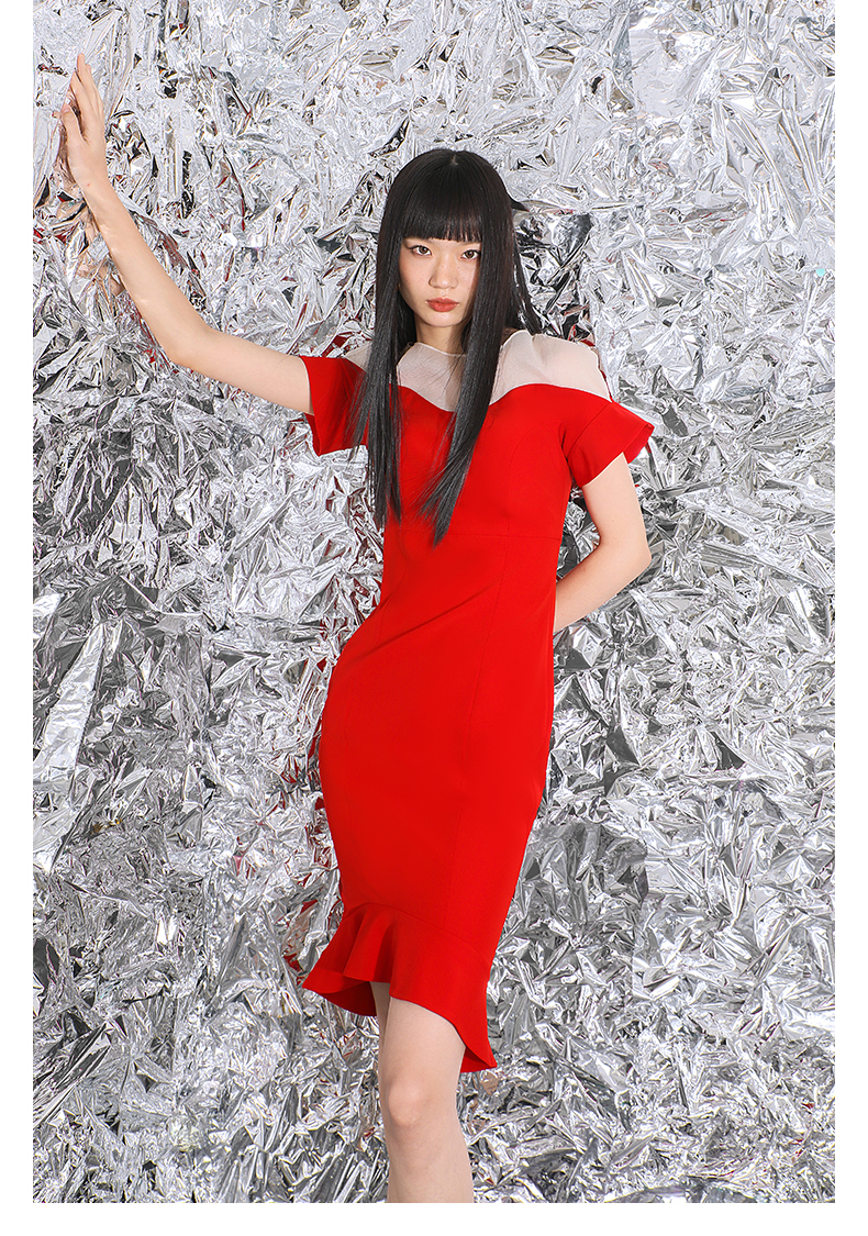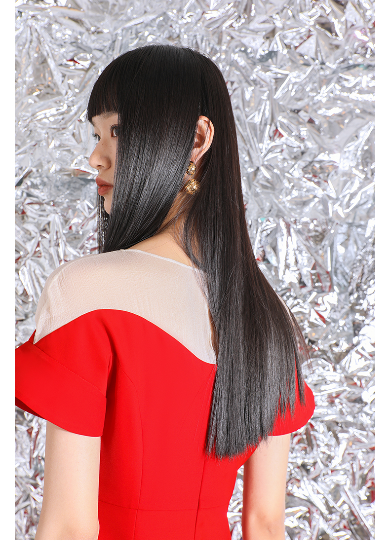 【角度浪漫】流线拼纱造型袖角度圆弧下摆连衣裙/0000751R