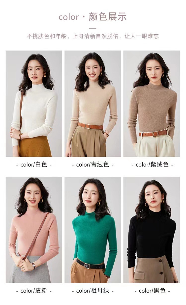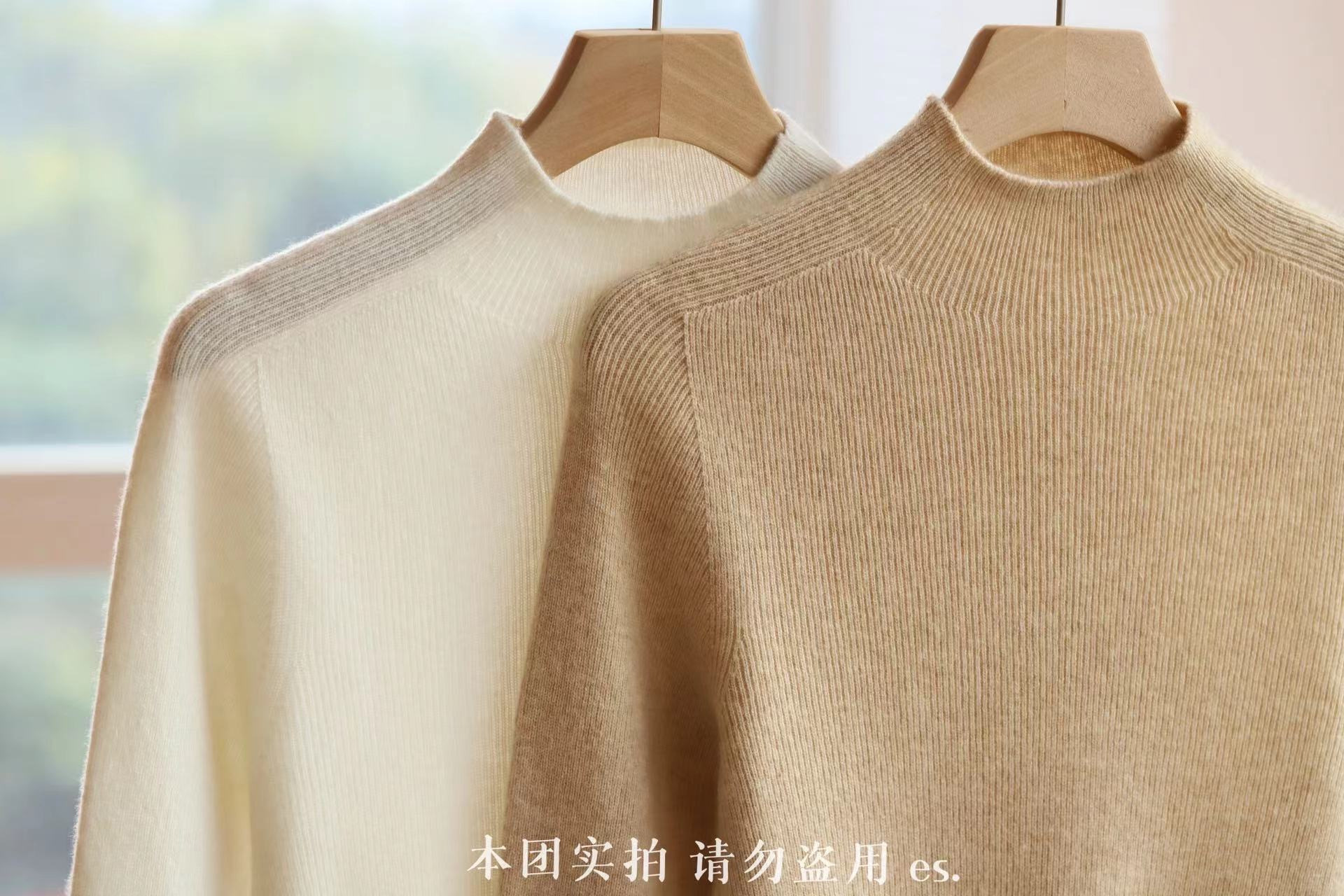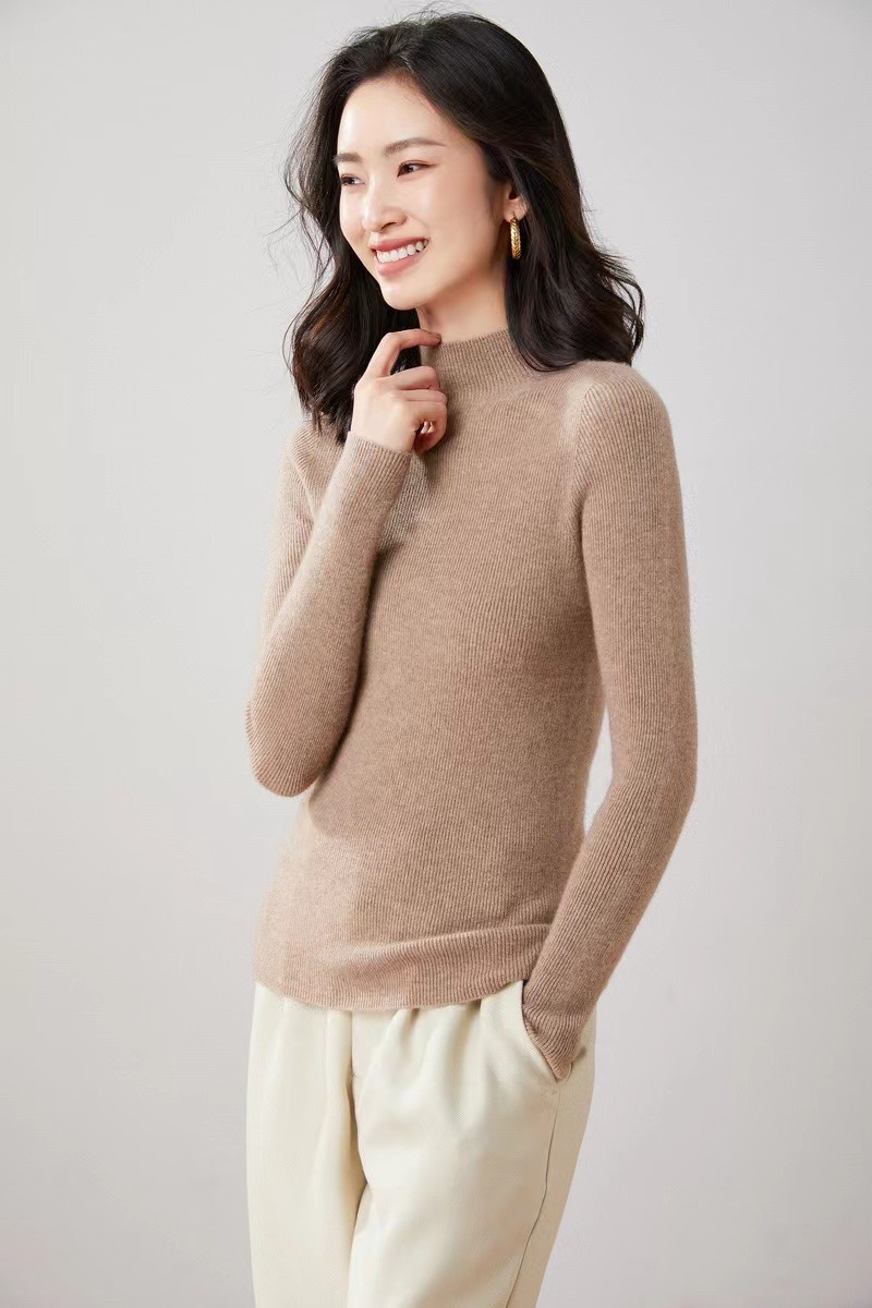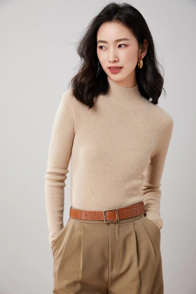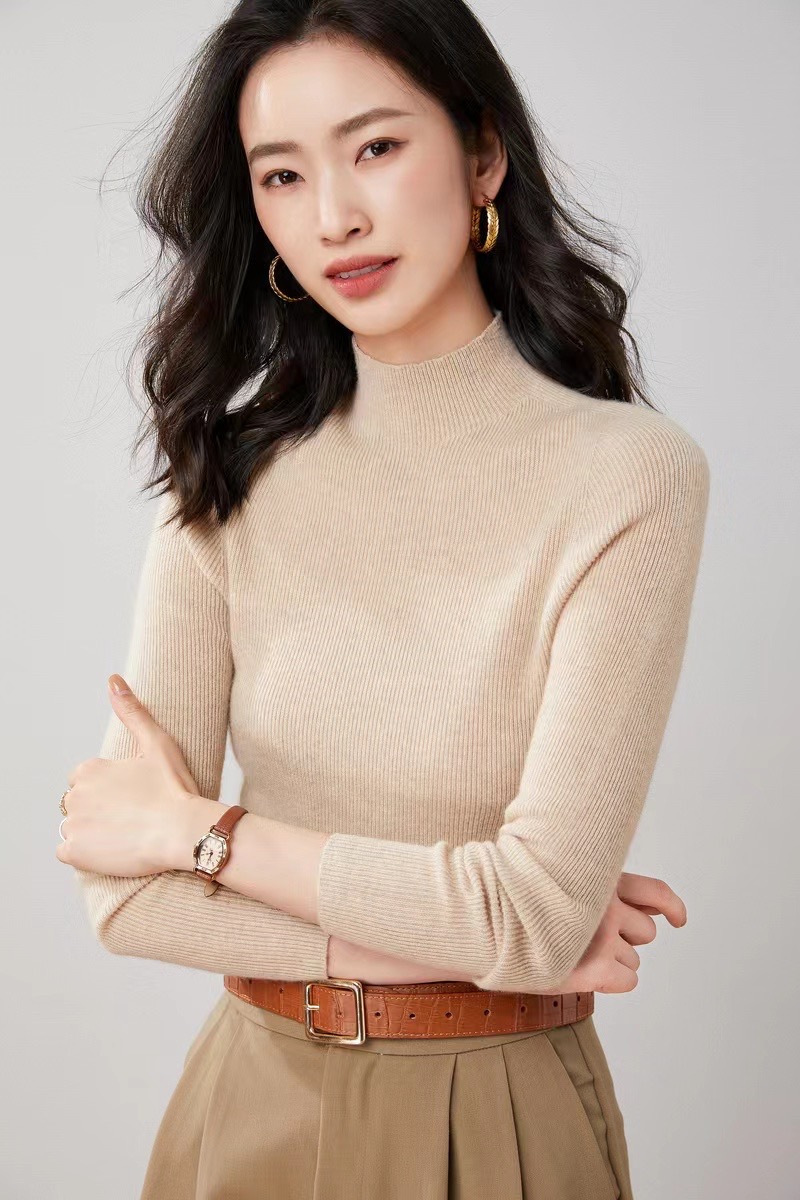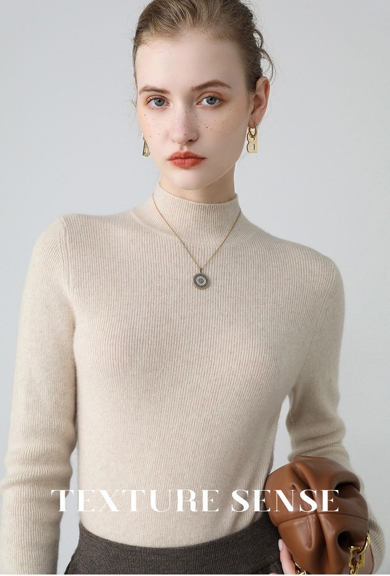 纯山羊绒衫【女士半高领修身坑条打底衫】
