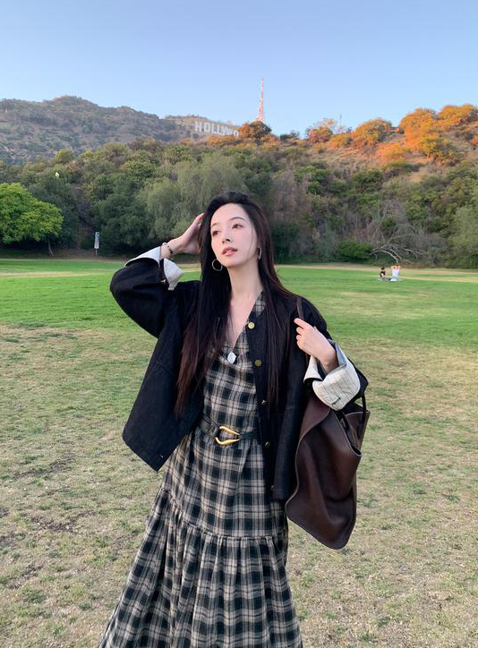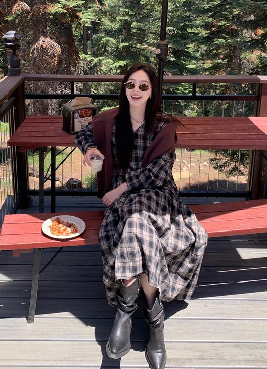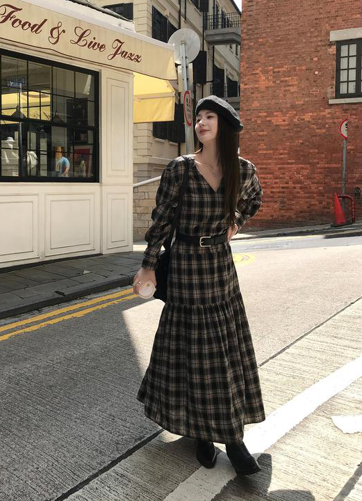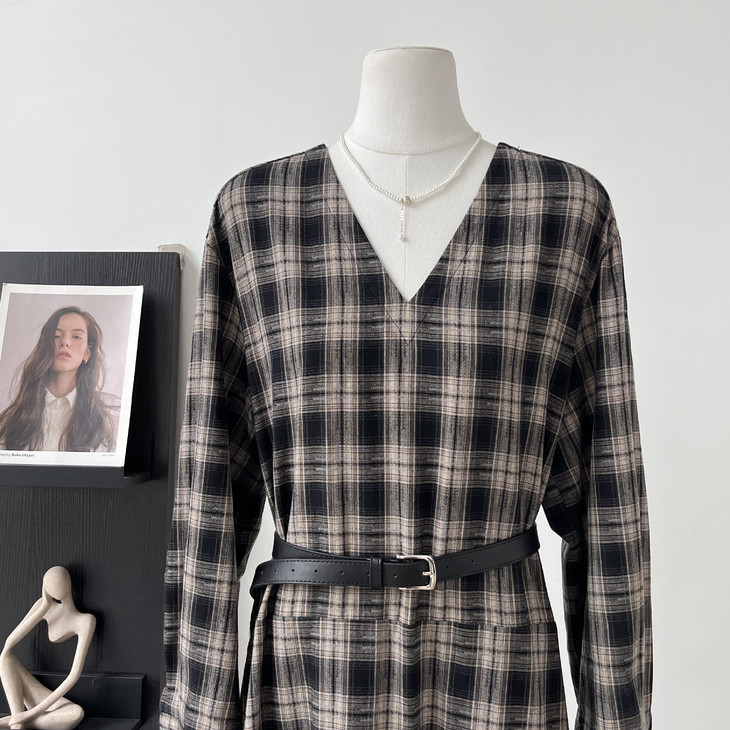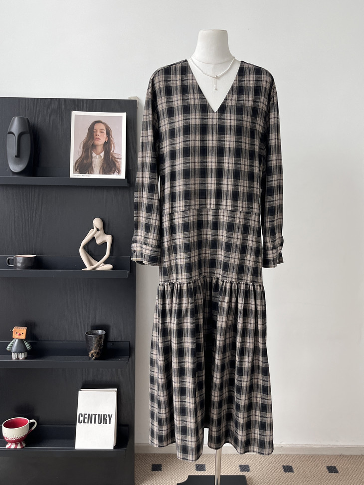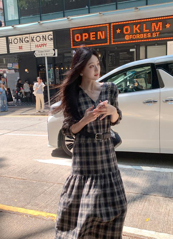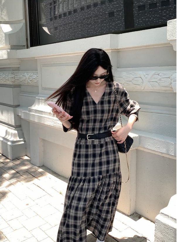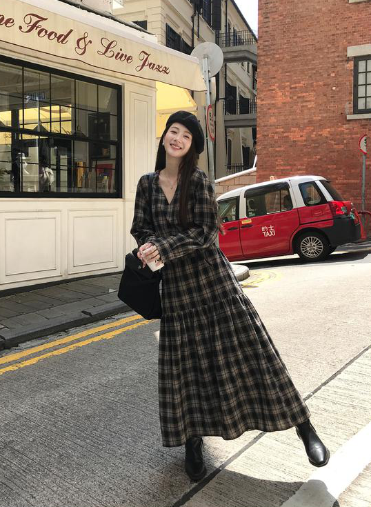 秋天怎么能没有一条格纹连衣裙! 这条真的是我的本命裙 穿上直接氛围感拉满~ 经典 V 领设计太懂女生了! 轻轻拉长颈部线条,把脸型修饰得超好看 视觉上就很显瘦,脸大的姐妹放心冲 下摆的分割抽褶设计太加分!
