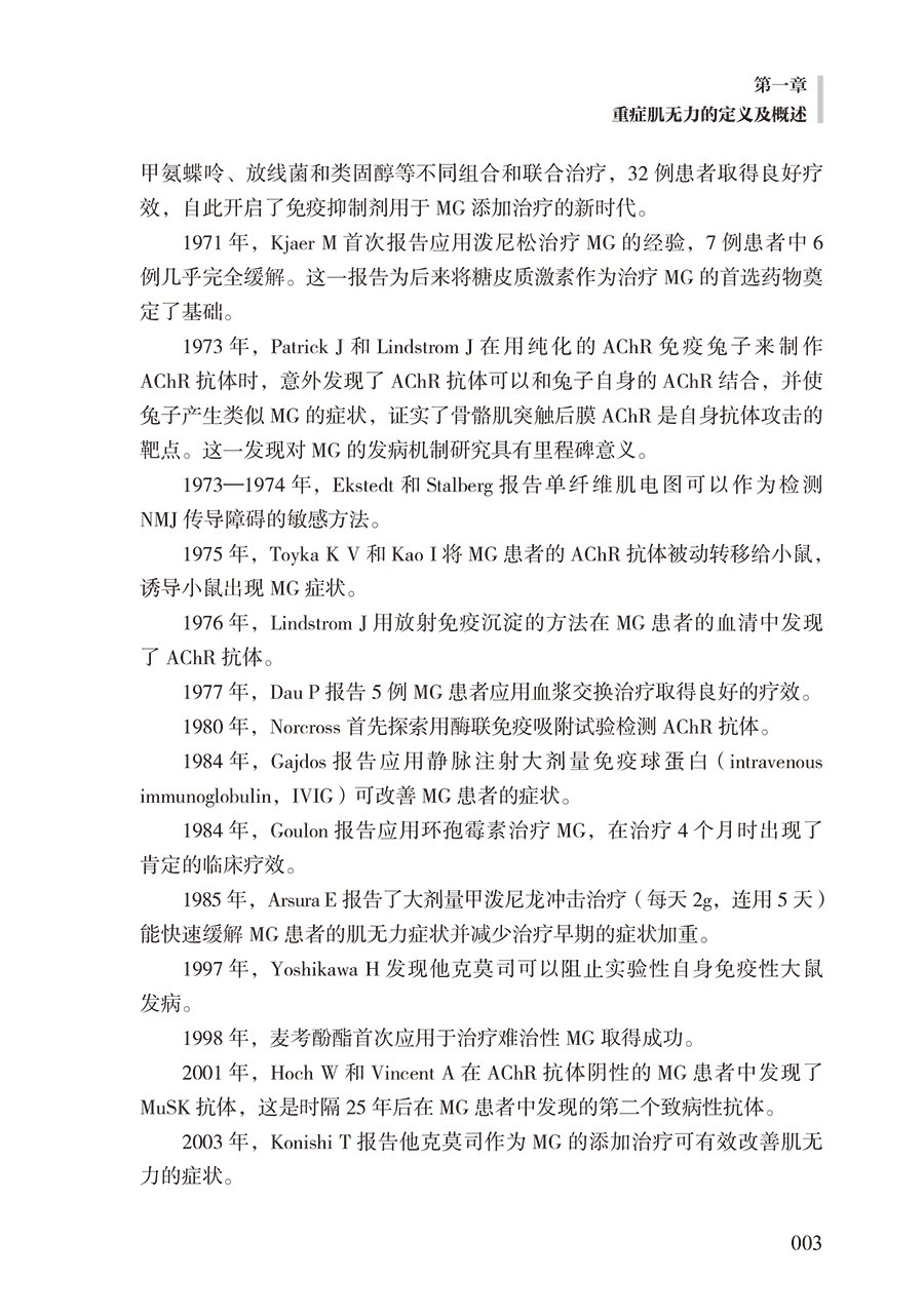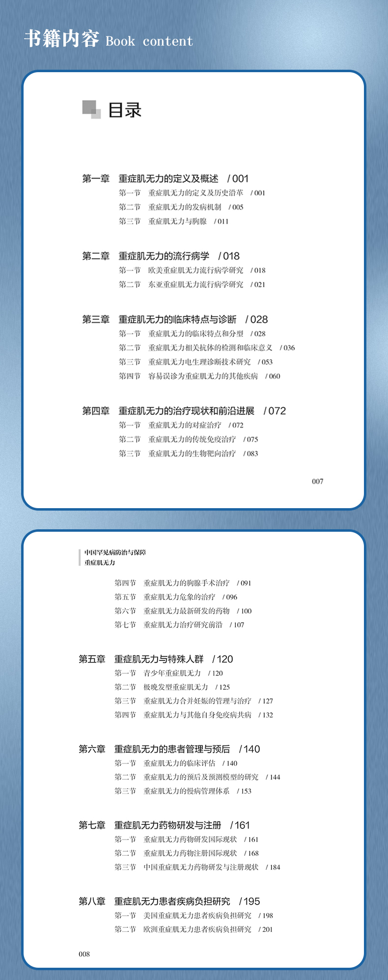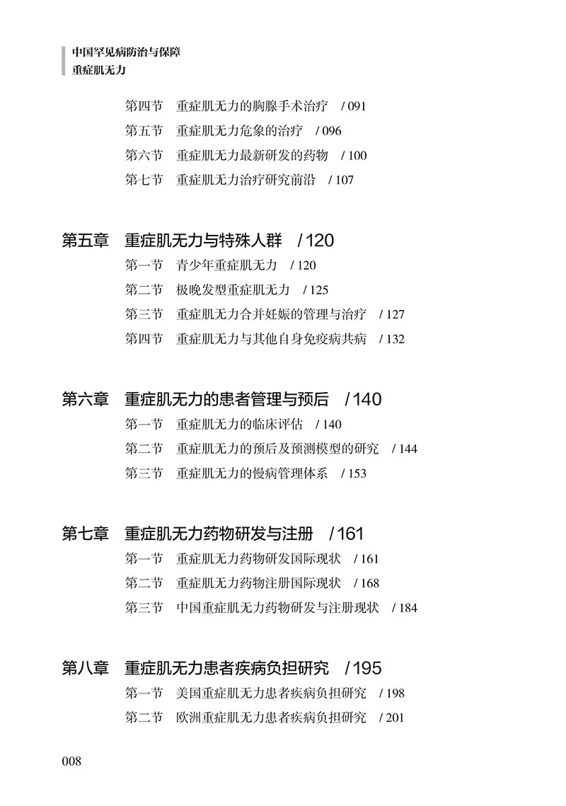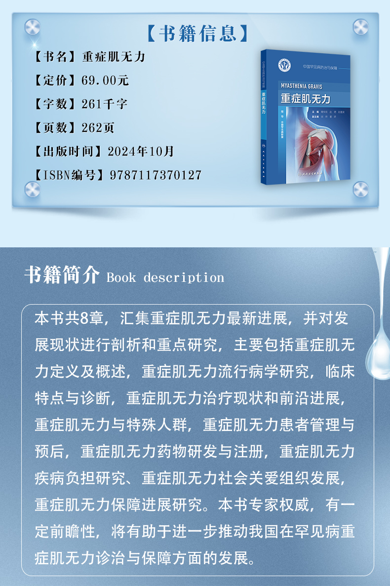 本书共8章,汇集重症肌无力最新进展,并对发展现状进行剖析和重点研究,主要包括重症肌无力定义及概述,重症肌无力流行病学研究,临床特点与诊断,重症肌无力治疗现状和前沿进展,重症肌无力与特殊人群,重症肌无力患者管理与预后,重症肌无力药物研发与注册,重症肌无力疾病负担研究、重症肌无力社会关爱组织发展,重症肌无力保障进展研究。本书专家权威,有一定前瞻性,将有助于进一步推动我国在罕见病重症肌无力诊治与保障方面的发展。